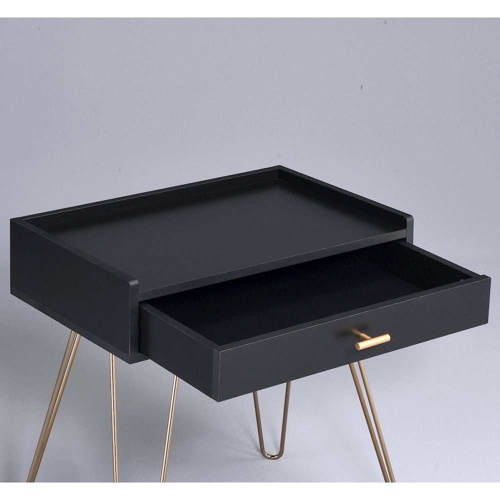 The table features a storage drawer with a gold-tone finished drawer handle Durable engineered wood top finished in black Metal hairpin legs with gold-tone finish Dimensions: 22″W x 14″D x 24″H Some assembly required. Photo may be slightly different from the actual item in terms of color due to the monitor’s display