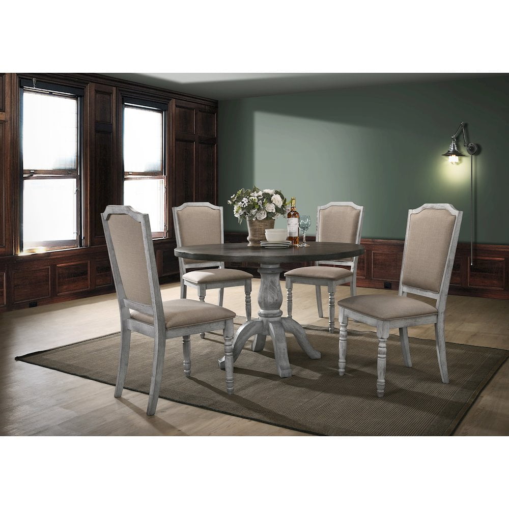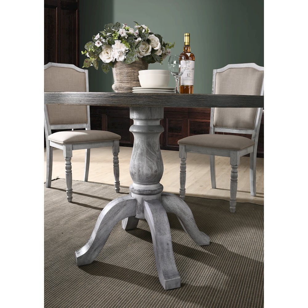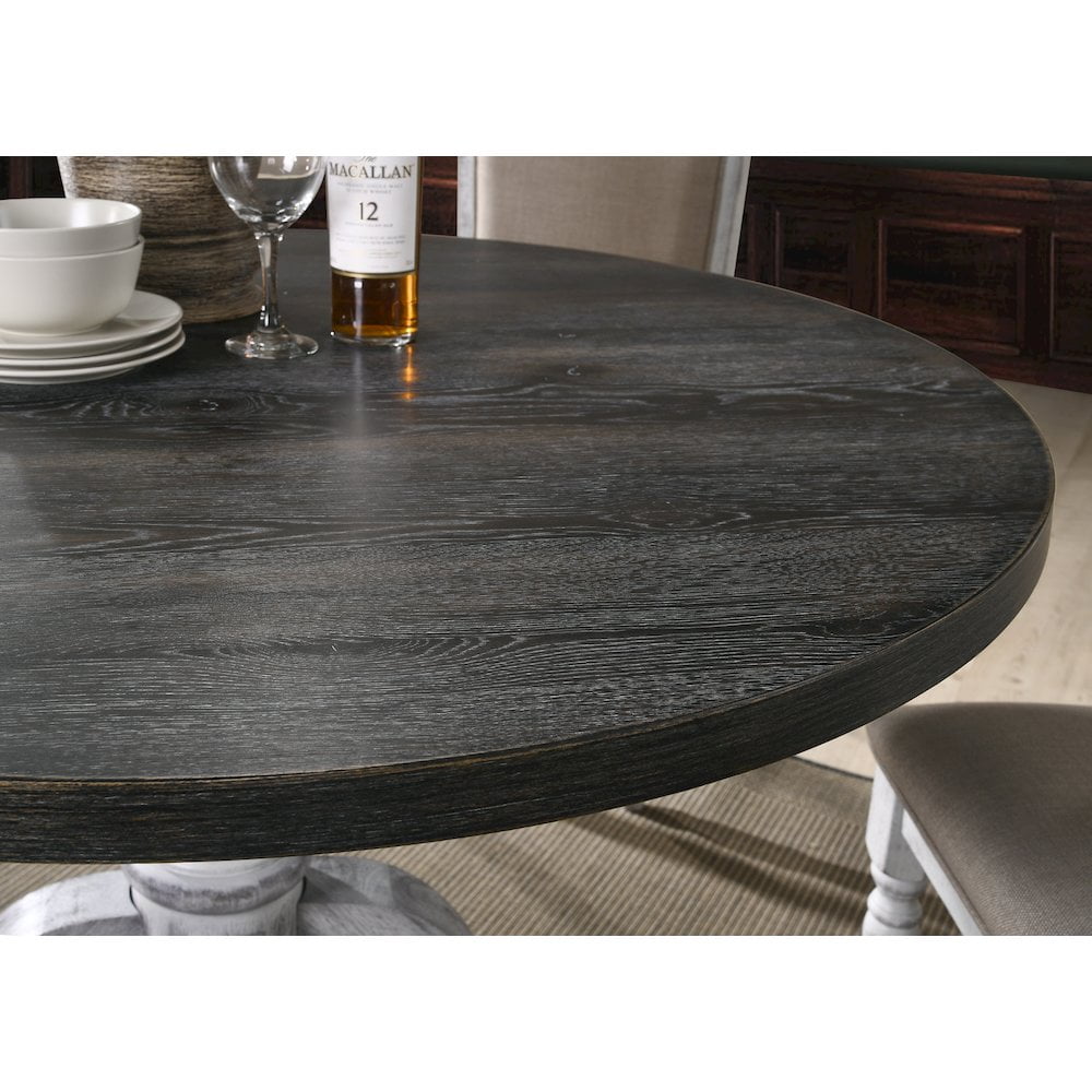 Iris Round Pedestal Wood Dining Table When it comes to your dining room ensemble, the table and chairs are the meat and potatoes. The Iris Dining collection, featuring round table and chairs, is made from solid rubber wood with weathered white and smooth woodgrain texture. The table has a central pedestal that allows for plenty of legroom, and strikes a stylish silhouette. The table top features a dark finish on solid rubber wood. The Iris Dining Set features a rustic style and it will be a great piece for your dining room. The piece also feature a solid rubber wood base. Durable hardwood construction in natural-and-ash finish, Sturdy turned legs. The table features a distressed undertone. A simple yet elegant transitional piece. It can also be interpreted as a rustic piece to fit in your dream farmhouse styled dining room. The dining table can be a great addition for the holidays. Some assembly needed, Photo may be slightly different from the actual item in terms of color due to the monitor’s display