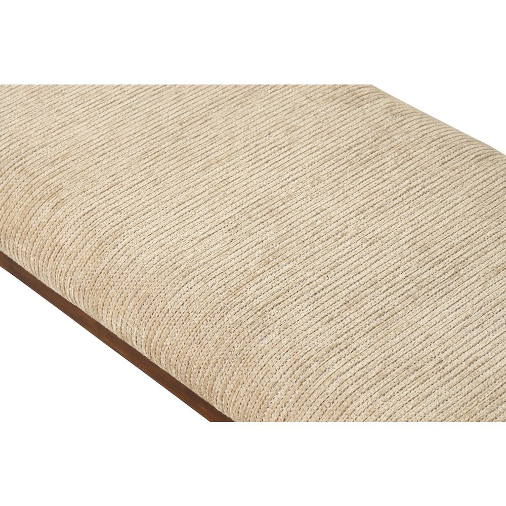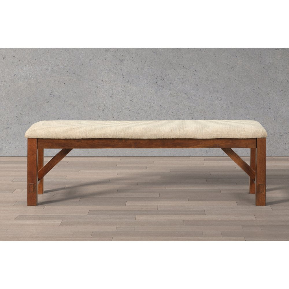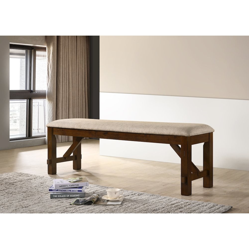 Thick, sturdy, straight legs made of solid rubberwood Dark hazelnut finish 100% polyester upholstered tan seat Dimensions: 60″W x 16″W x 20.25″ H Some assembly needed, Photo may be slightly different from the actual item in terms of color due to the monitor’s display