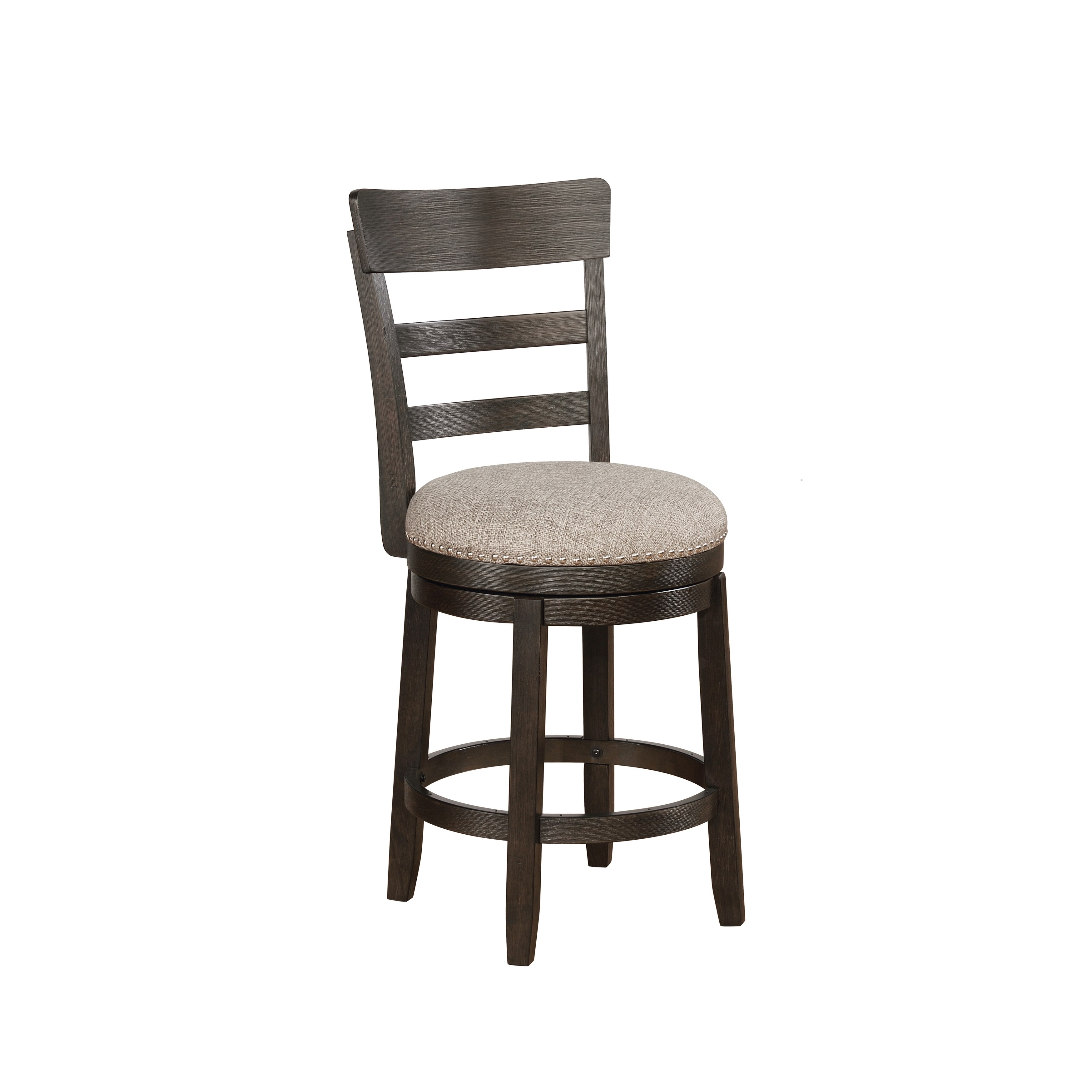 Upgrade your traditional home bar or dining area with this pair of brushed-wood swivel stools. Featuring a classic ladder-back design and ring footrest for support, each stool also sports a padded swivel seat for additional comfort. A nailhead finish around each cushion adds a touch of class to this stylish, sturdy pair. Features: The stool features 360-degree swivel seat, upholstered with tan color fabric Ladder-style back, ring footrest to add comfort. Bronze nailhead around the seat The stool is constructed with solid acacia wood Some assembly needed Dimensions: Dimensions: 18″W x 20.5″D x 41″H, seat height: 25.5″ Photo may slightly different from actual item in terms of color due to the monitor’s display