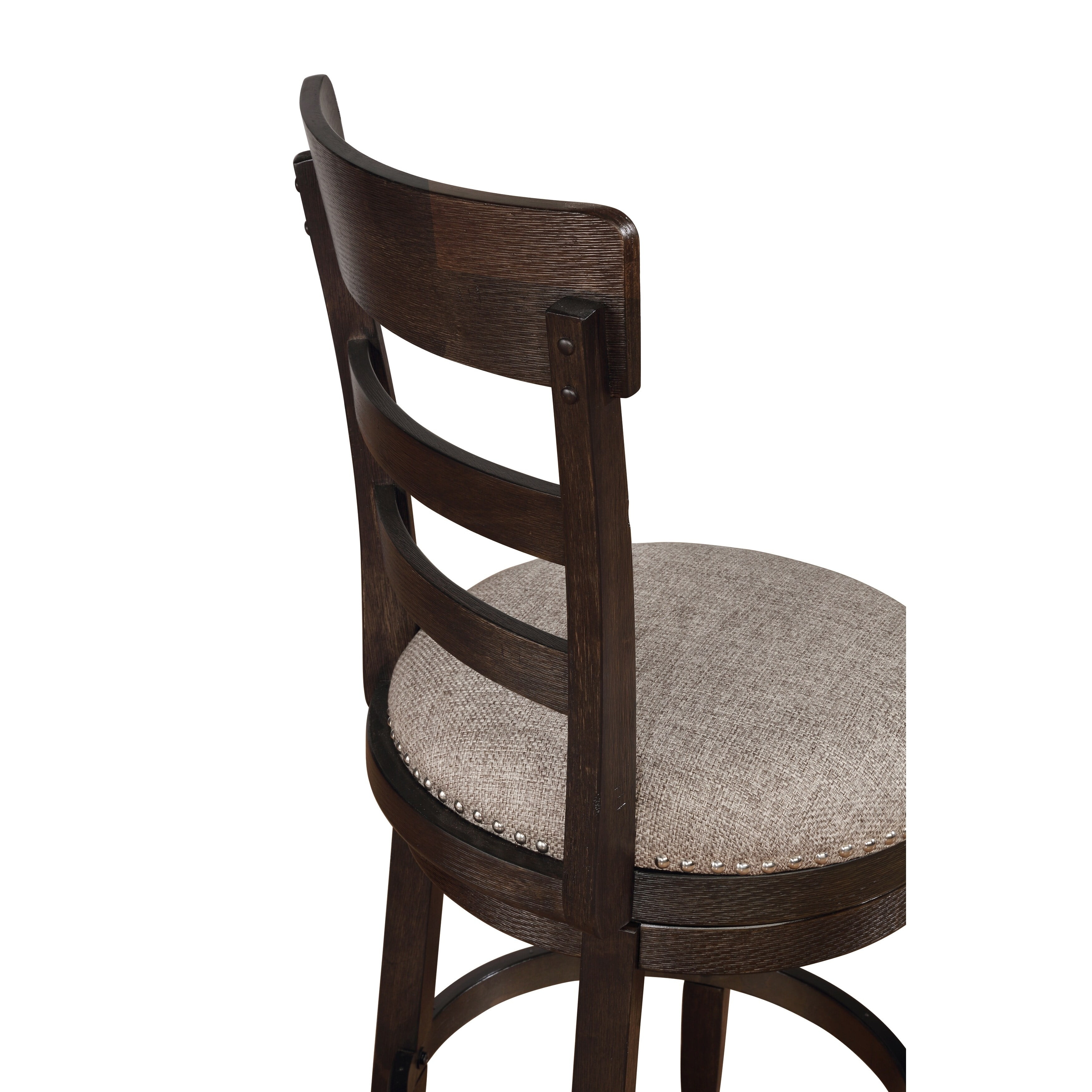 The stool features 360-degree swivel seat, upholstered with tan color fabric Ladder-style back, ring footrest to add comfort. Bronze nailhead around the seat The stool is constructed with solid acacia wood
