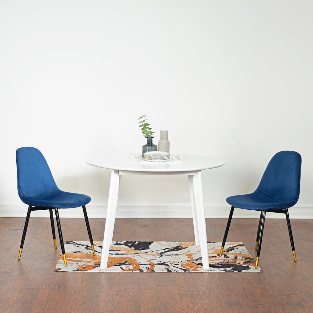 Lassan Contemporary 5-Pc Dining Set, White Round Dining Table and 4 Chairs, Blue Experience the captivating elegance of the Roundhill Furniture Lassan Contemporary 5-Piece Dining Set. This exquisite ensemble includes a white round dining table and four chairs. The table is made of MDF and Rubberwood, ensuring stability and durability. The chairs, upholstered in plush polyester velvet, provide extra comfort with their blend of polyester. The metal legs in a gold-tone finish not only provide long-lasting support but also brighten up the look. With its contemporary aesthetic and impeccable craftsmanship, this dining set becomes the focal point of any dining space. Its compact design makes it perfect for various room sizes. Easy to assemble, this space-saving dining set seamlessly blends form and function. Elevate your dining experience today with the Roundhill Furniture Lassan Contemporary 5-Piece Dining Set, available in four colors: Blue, Green, Gray, and Red. COMPLETE SET: This dining set includes a timeless white round dining table and four stylish chairs Our white round table is crafted with MDF and Rubberwood, providing a sturdy foundation. The chair is crafted with tough wood, and the leg features a metallic black-finished gold tone end. The chair is upholstered in plush polyester velvet. The soft velvet upholstered chairs feature dense foam padding for uncompromising comfort, complementing a space-saving round table that facilitates easy movement and conversation flow. Dimensions: Table: 41.73″W x 41.73″D x 29.13″H”; Chair: 17.25″W x 22.25″D x 33.25″H in. Tabletop Thickness: 2.5″; Seat: 17.5″W x 16″D x18.5″H Some assembly is required, all parts and instructions are included. The photo may be slightly different from the actual item in terms of color due to the monitor’s display.