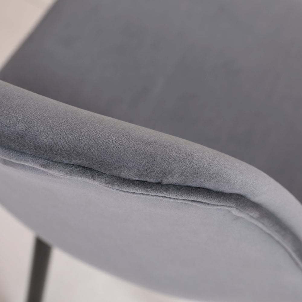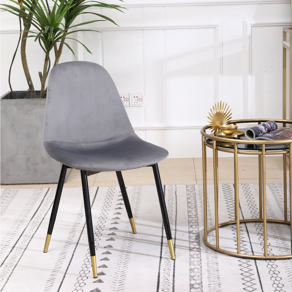 Lassan Contemporary Fabric Dining Chairs, Set of 4, Gray Welcome the Lassan Contemporary Fabric Dining Chairs into your kitchen or dining room for a perfect perch from which to enjoy your every meal. This mid-century modern inspired dining chair features a contoured seat made from tough wood and is upholstered in a plush polyester velvet upholstery. The angled legs underneath are made from metal and feature a gold-tone finish in the end that brightens up the look. Mid-century inspired dining chairs in set of 4 Thick layers of dense foam are used to pad the backrest and seat, upholstered with a lush velvet fabric in your choice of color Black finished angled legs are made from metal for long-lasting and feature a gold tone finish in the end that brightens up the look Dimensions: 17.25″W x 22.25″D x 33.25″H. Seat: 18.5” H x 17.5” W x 16” D Some assembly required. Photo may be slightly different from the actual item in terms of color due to the monitor’s display
