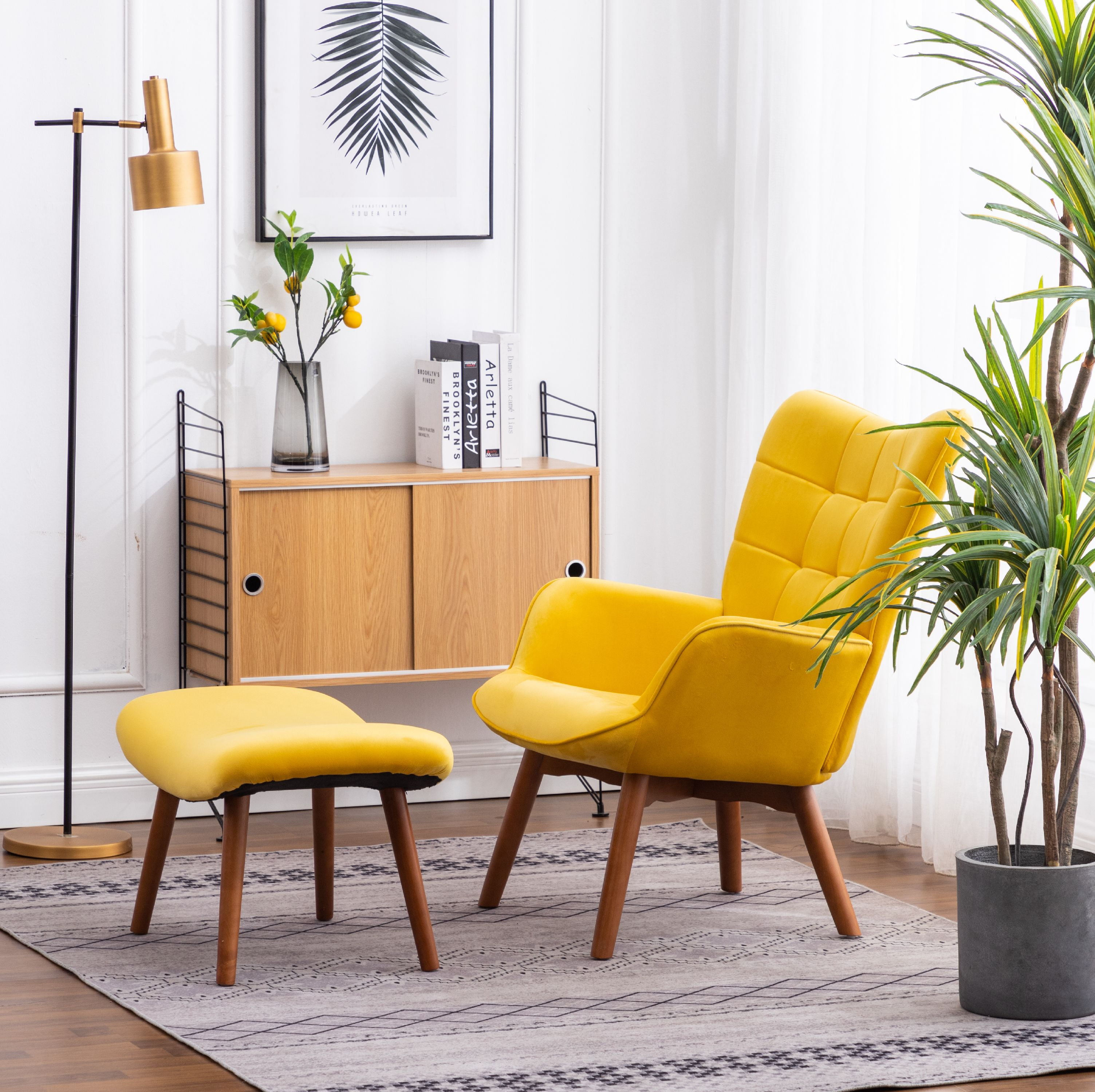 Button-tufted accents make the Leiria Contemporary Silky Velvet Tufted Accent Chair with Ottoman. Tapering wood dowel legs add mid-century flair. Settle into the generous wingback design to appreciate this chair’s smart, welted arms and its matching ottoman. This set includes a lounge chair and matching ottoman. Oak finished legs. Plump foam pads the seat and ottoman top, upholstered in premium soft velvet fabric and diamond-tufted. Choose among available fabric options. Features : Finish: Yellow Materials: Velvet, Wood Silky velvet upholstery with beautiful diamond button tufting and welt trim This set includes an accent chair and matching ottoman Plush bright yellow polyester upholstered seat, supported by strong and durable Solid Rubber Wood frame Some assembly required, all parts and instructions included. Photo may slightly different from Actual Item in Terms of color due to the Monitor’s display Specifications : Chair Dimensions : 28.75″W x 33″D x 37″H Seat Dimensions : 18.5″W x 20.5″D x 17″H Ottoman Dimensions : 25.6″W x 17″D x 16.5″H Weight Capacity : 200 lbs