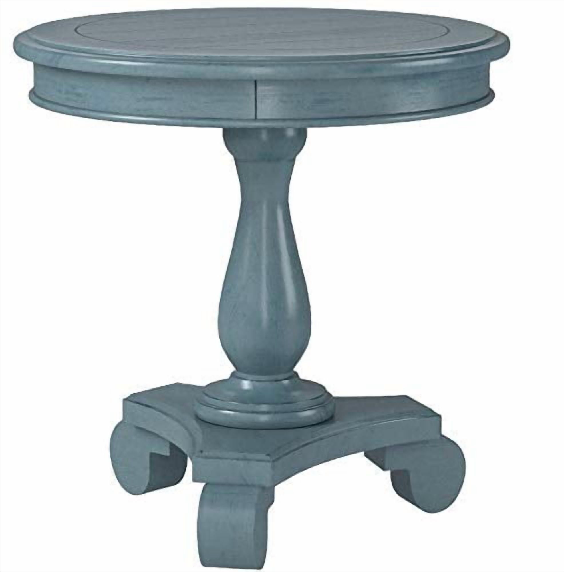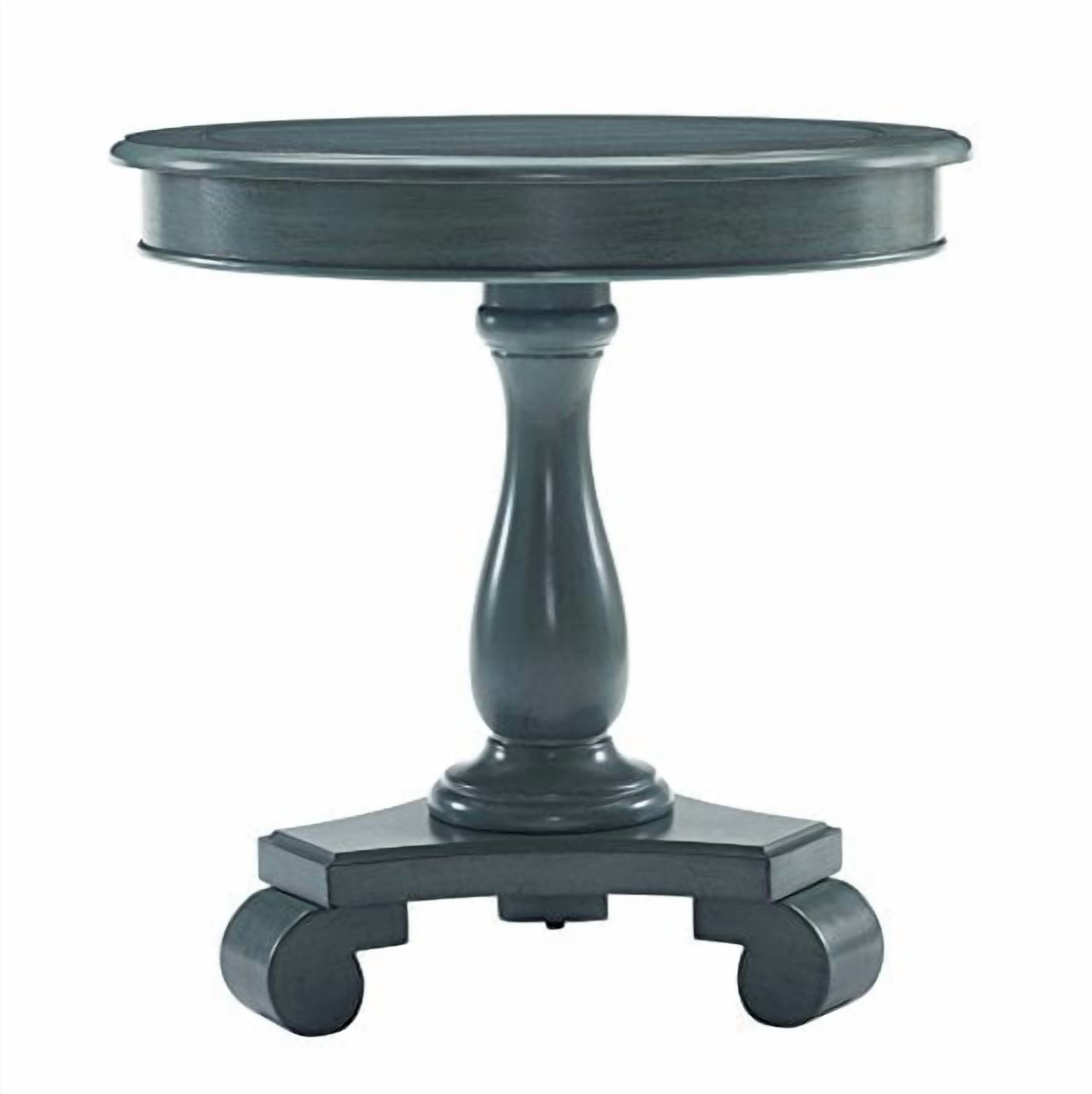 Gracefully traditional yet timeless, the Rene Teal Blue Round Wood Pedestal Side Table is a true transitional beauty. Scaled large enough to offer practical display space and create visual appeal, this end table is 26 inches around. It stands on a sturdy, well-turned pedestal base that ends in carefully scrolled legs. Built to last, this end table is carved from wood and comes in a teal finish that adds to its classic appeal. Dimensions: 26″W x 26″D x 26.5″H Photo may be slightly different from the actual item in terms of color due to the monitor’s display