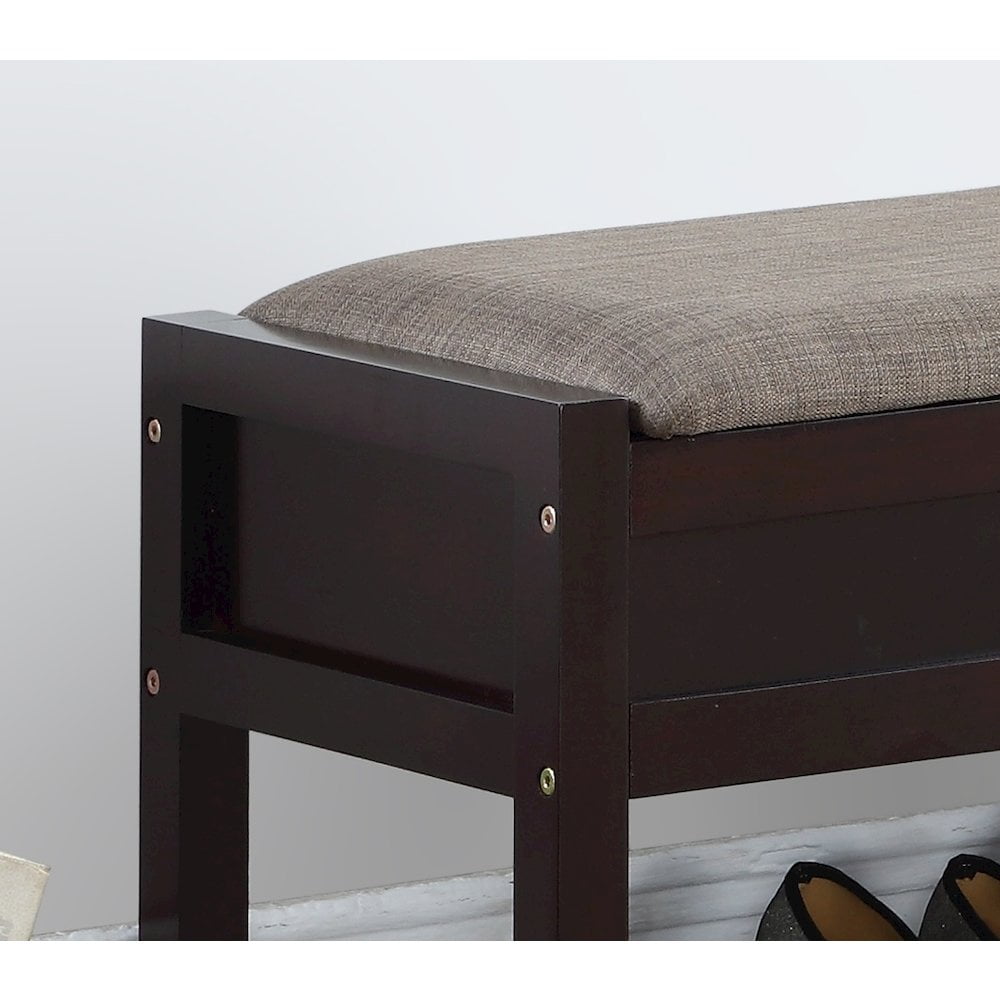 Rouen Espresso Seating Bench with Shoe Storage Perfect in the entryway, this Rouen Seating Bench with Shoe Storage provides a practical place to sit and is loaded with smart storage. Sit on the cushioned seats of this bench or lift to reveal open storage inside. A handy open shelf below is perfect for storing shoes, boxes, and more. The bench is constructed of wood frame and slatted shoe shelf with a padded seat cushion. This storage bench has a transitional design that works with any decor and is available in finish options. Gray fabric upholstery for your comfort, matches perfectly with the rich espresso frame. The lift-up seat cushion provide hidden storage space One slatted shelf under the seat to provide extra storage space. Constructed of Pine wood and MDF Dimensions: 35.43″W x 13.19″D x 18.11″H; Slat shelf space dimensions: 32.67″W x 13.36″D x 6.81″H; Seat storage dimensions: 32.67″W x 11.81″D x 5″H Some assembly needed, Photo may be slightly different from the actual item in terms of color due to the monitor’s display