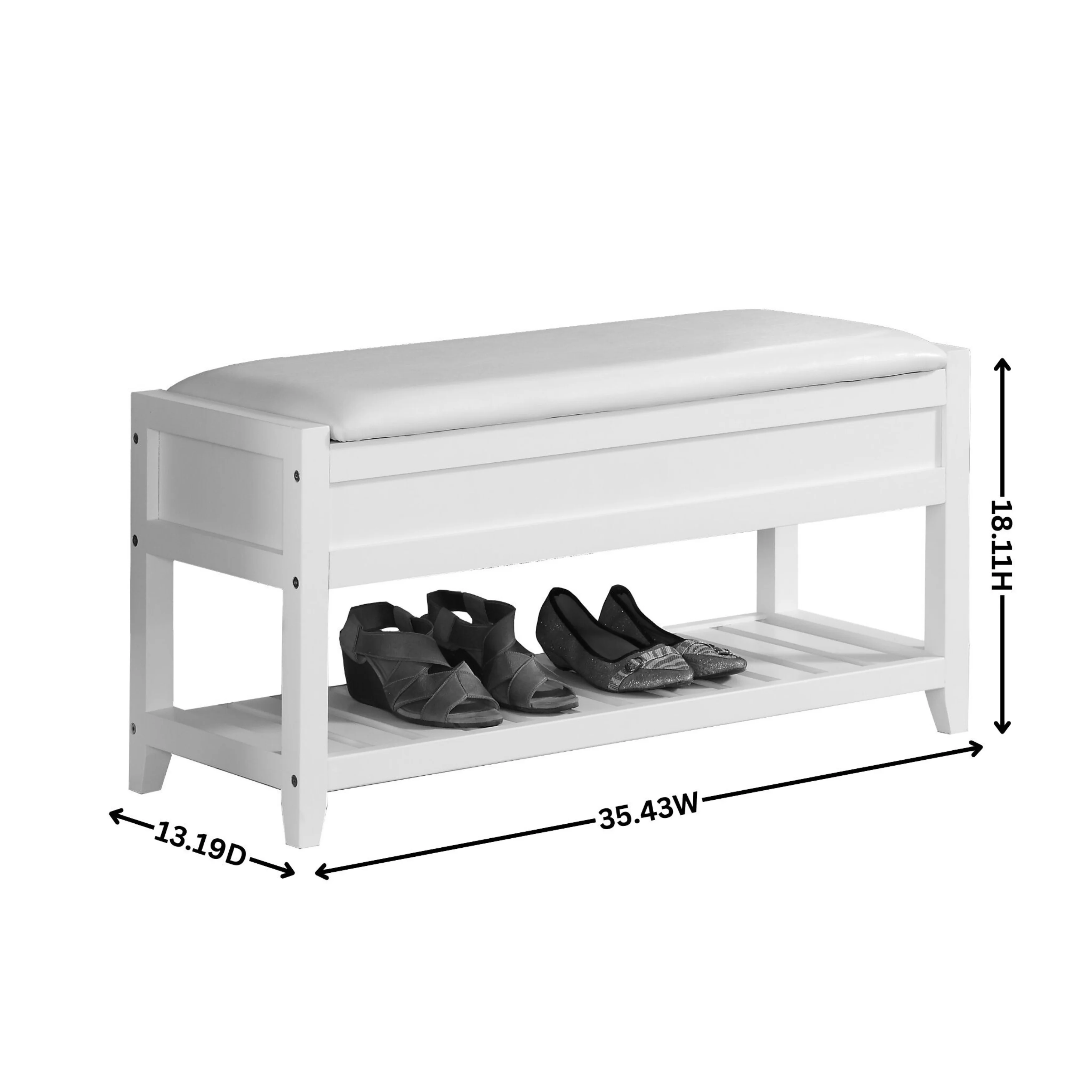 Beige fabric upholstery for your comfort matches Perfectly with the Crisp white frame Photo may be slightly different from actual item in terms of color due to the lighting during photo shooting or the monitor’s display ITEM SKU: 3431WH Slat shelf space dimensions: 32.67″ W x 13.36″ D x 6.81″ H Seat dimensions: 32.67″ W x 11.81″ D One slatted shelf under the Seat to provide extra storage space. Constructed of pine wood and MDF Overall dimensions: 35.43″ W x 13.19″ D x 18.11″ H The lift-up seat cushion provides hidden storage space Maximum weight capacity: 200 lbs