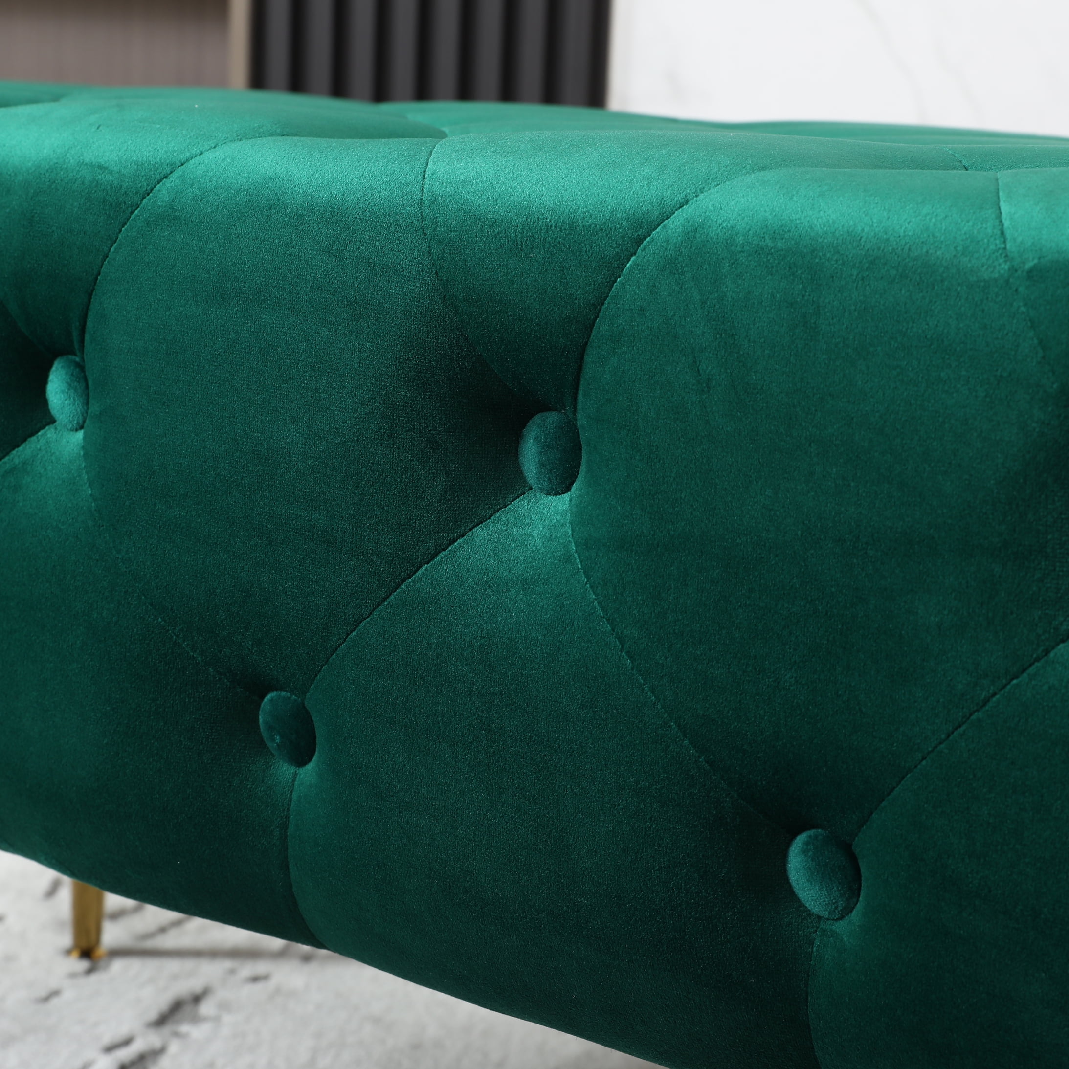 Sira Velvet Button Tufted Bench with Gold Metal Legs, Green The Sira Velvet Button Tufted Bench adds a contemporary element to any room with its luxe velvet upholstery. It has a cushioned top that’s upholstered with a smooth, deluxe velvet material. Plus, it’s enhanced with the generous button tufting detail. This bench has sleek metal legs that add a dose of modernity to the look. And, the gold-tone finish heightens this bench’s glamorous essence. Backless bench with luxe velvet upholstery Generous button tufting detail on the seat The bench is supported by four metal legs finished in gold tone Dimensions: 50″W x 20.5″D x 18″H Some assembly required. Photo may be slightly different from the actual item in terms of color due to the monitor’s display