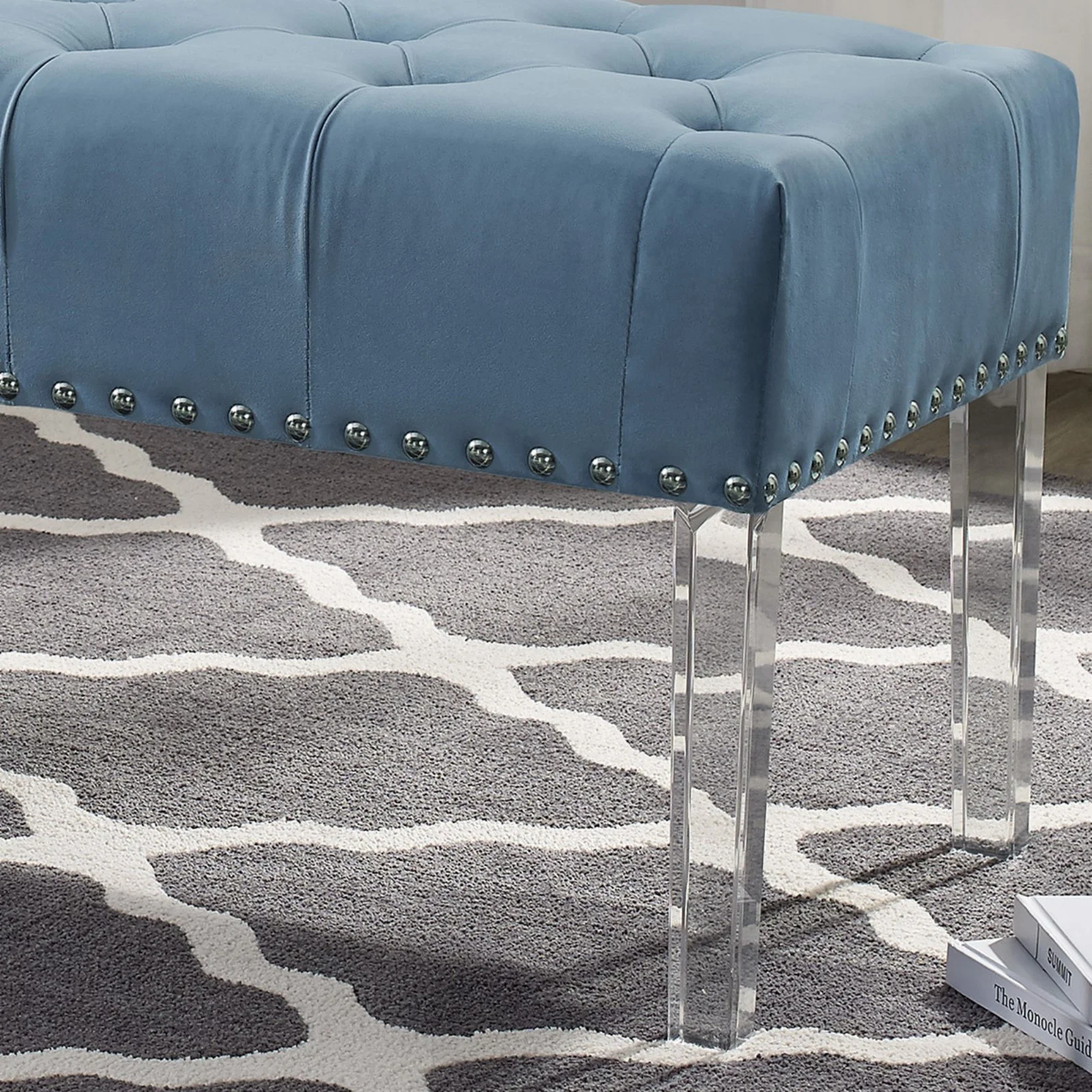 Sturdy acrylic legs provide support. Dense foam padding and smooth velvet textured polyester upholstery. Choose from available colors. The colors available include blue and Gray. Button-tufted detail adds visual appeal. Chic modern style with elegant nailhead trim. Dimensions: 49″W x 19″D x 19″H Some assembly required. Photo may be slightly different from the actual item in terms of color due to the monitor’s display