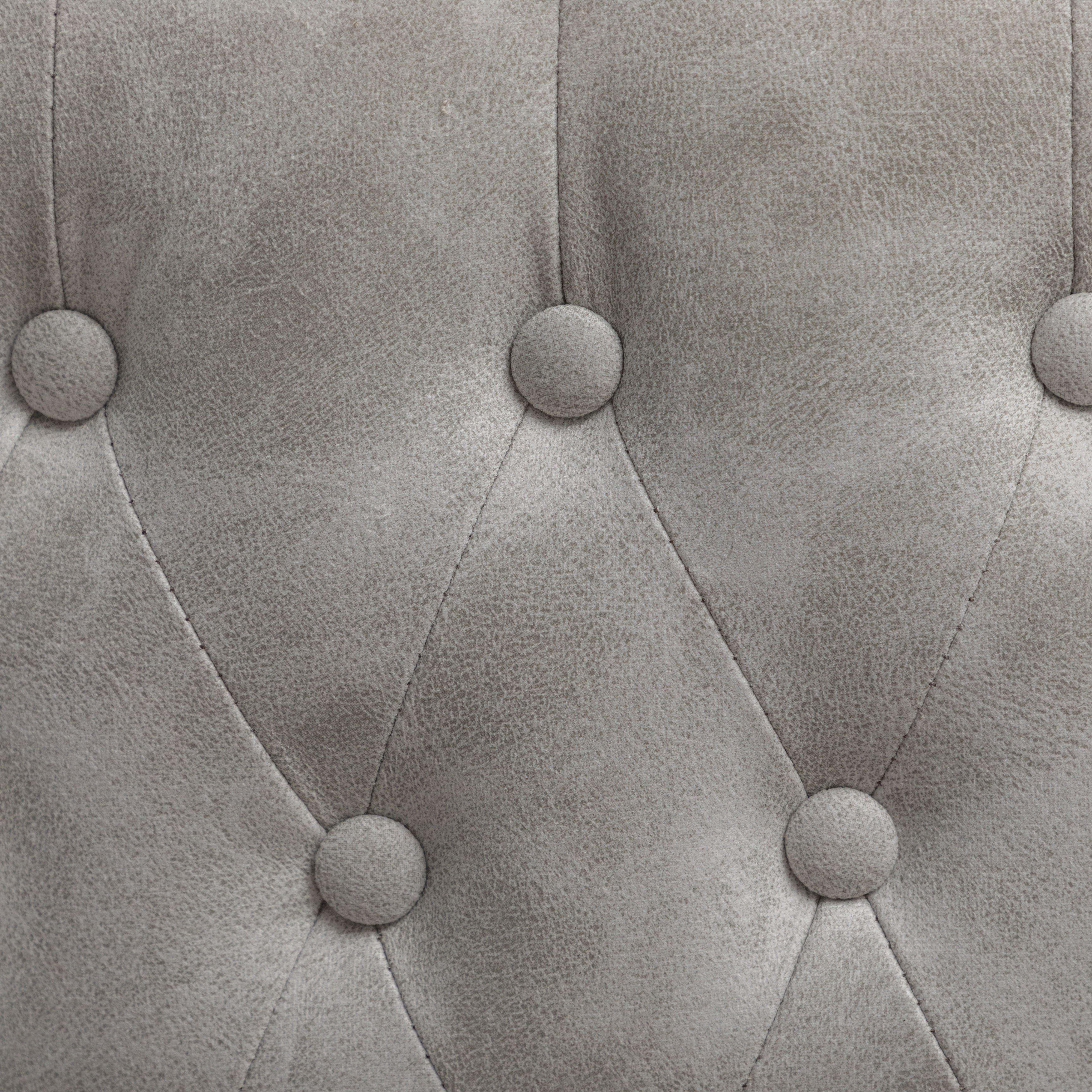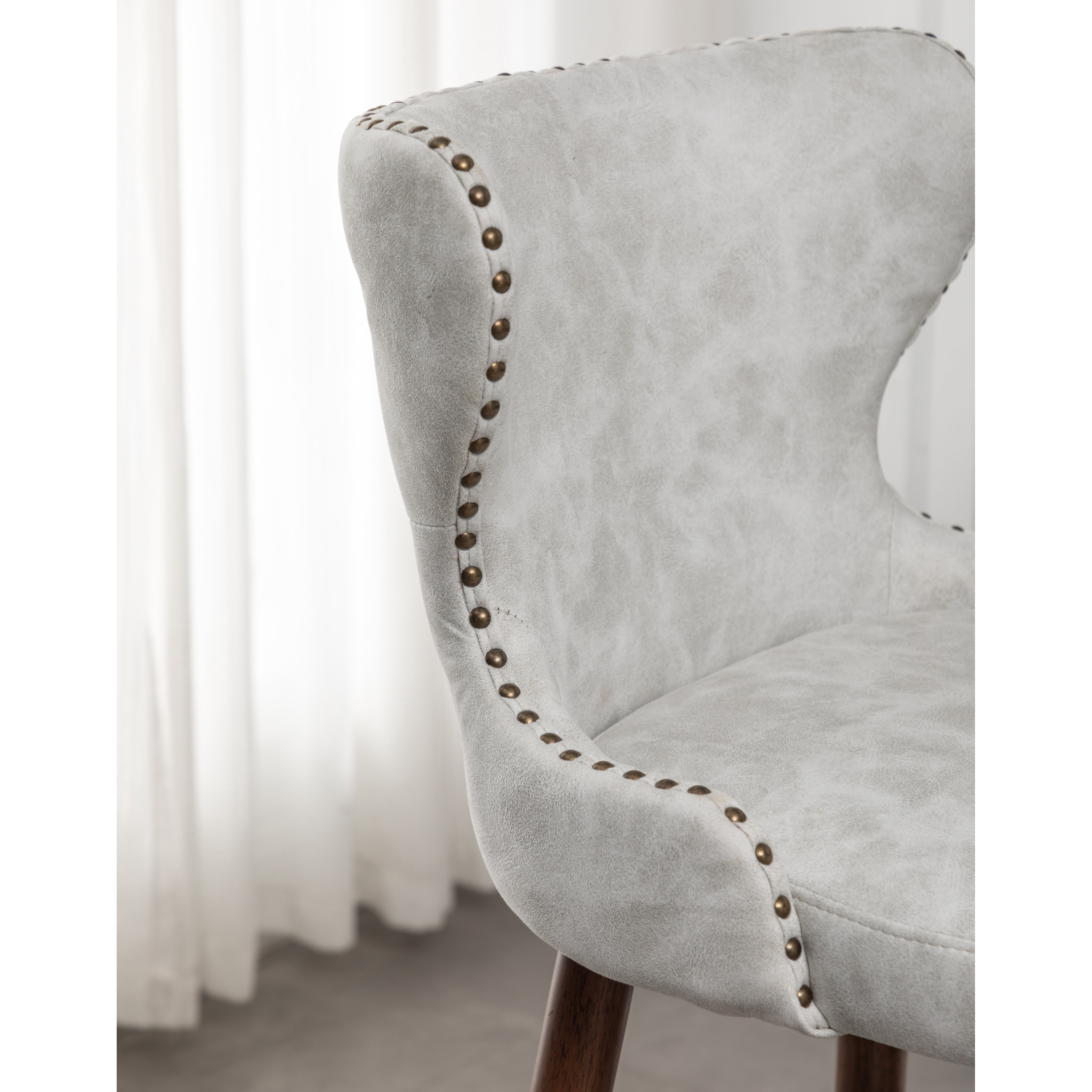 Dimensions: 20.25W x 21.5D x 41.25H in Suede-like fabric upholstery A button tufted seat back Curved wing-back seat with nail head trim Tapered walnut finished solid wood dowel legs Gold-finished metal footrest The set includes two bar stools Seat dimension: 18.5W x 16D x 29.5H in Seat cushion thickness: 3.5 in Footrest to floor: 12.5 in