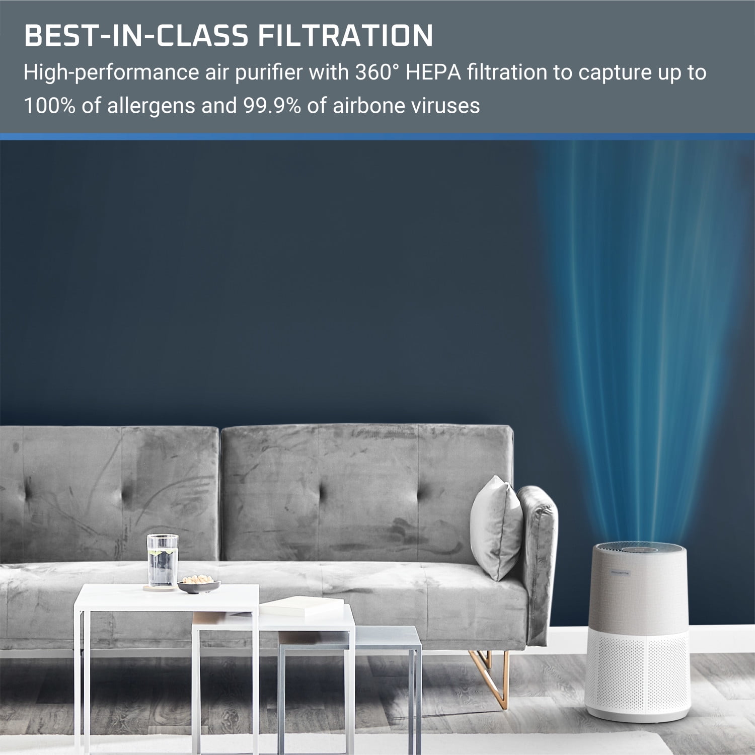 BEST-IN-CLASS FILTRATION: High-performance air purifier with 360° HEPA filtration to capture up to 100% of allergens (tests carried out by external laboratory, on birch allergens, on full appliance in maximum speed, 2022) and 99.9% of airbone viruses (tests carried out by external laboratory on H1N1 strain, on full appliance in maximum speed, 2022; an air purifier alone does not do away with additional preventative measures). Filters formaldehyde, the most dangerous home pollutant. FAST ACTING: A CADR of 141 CFM (240 m3/h) guarantees fast results for your home, purifying a 876 sq ft (81 m²) room in 1 hour (surface coverage estimated for a standard ceiling height of 8.2 ft (2.5 m) SMART PURIFICATION: Home air purifier with automatic pollution detection and speed adjustment, featuring 4 air-quality indicators and day/night modes for ultimate efficiency PURE AIR APP BY ROWENTA: Dedicated app with advanced air management monitoring and tracking, for total control and a perfect peace of mind. Compatible with voice assistants such as Alexa. EXTREME SILENCE: Discreet during the day and almost inaudible at night, at just 25 dB (38 dB(A)) (Sound pressure at 1.5m in dB) on speed 3