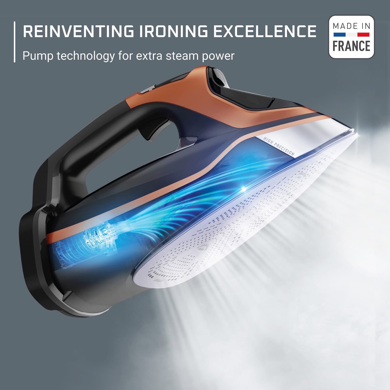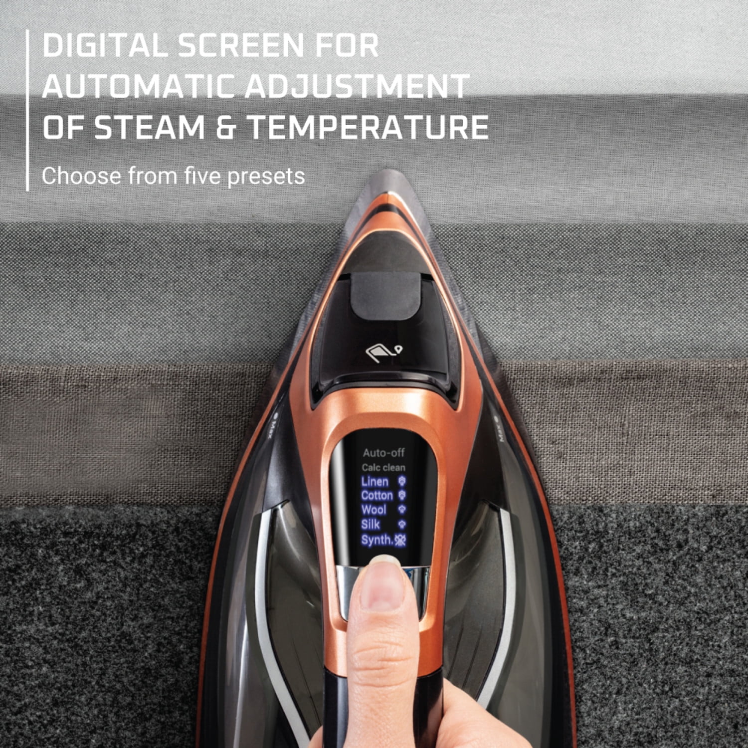 REINVENTING CLOTHES IRON EXCELLENCE: Experience profound steam penetration powered by our unique pump technology and a 1850-watts power, for a perfectly wrinkle-free look. STEAM ON DEMAND: This iron is equipped with our innovative steam boost trigger for custom control over when and where you apply steam for a tailor-made experience. SMART SCREEN FOR ULTIMATE FABRIC CARE: Enjoy consistent, controlled heat and precise electronic temperature and steam adjustment for all your clothes. This steam iron, with five adjustable settings, ensures the finest treatment for every type of fabric. ELEVATE YOUR IRONING WITH THIS ROWENTA CLOTHES IRON: Our uniquely weighted design and gentle pressing action deliver exceptional results. Engineered for superior horizontal ironing, with no vertical steam function. LEAK-FREE IRONING: No more leaks, unwanted color transfers, and residue with our advanced iron thanks to electronic steam regulation and precise settings.