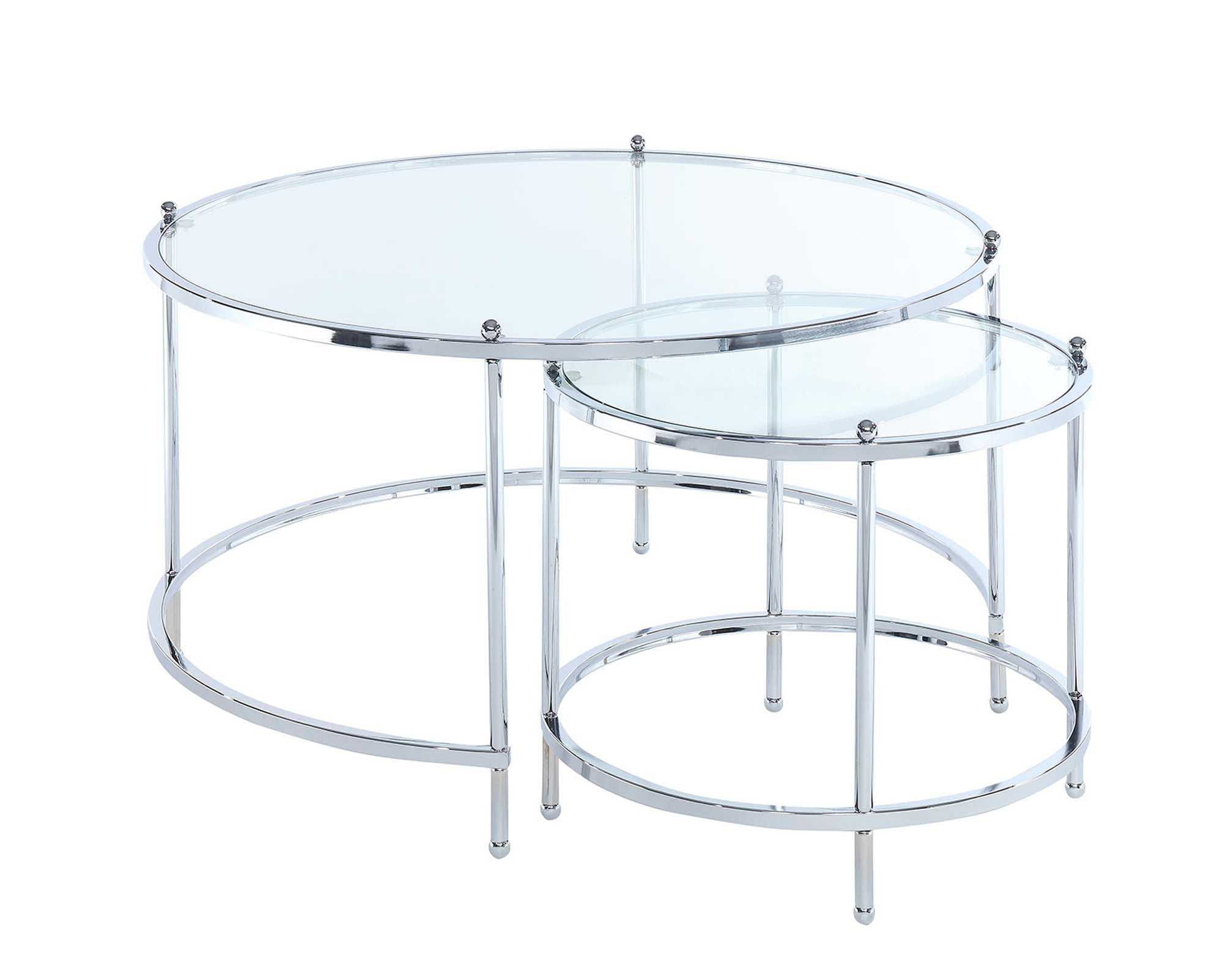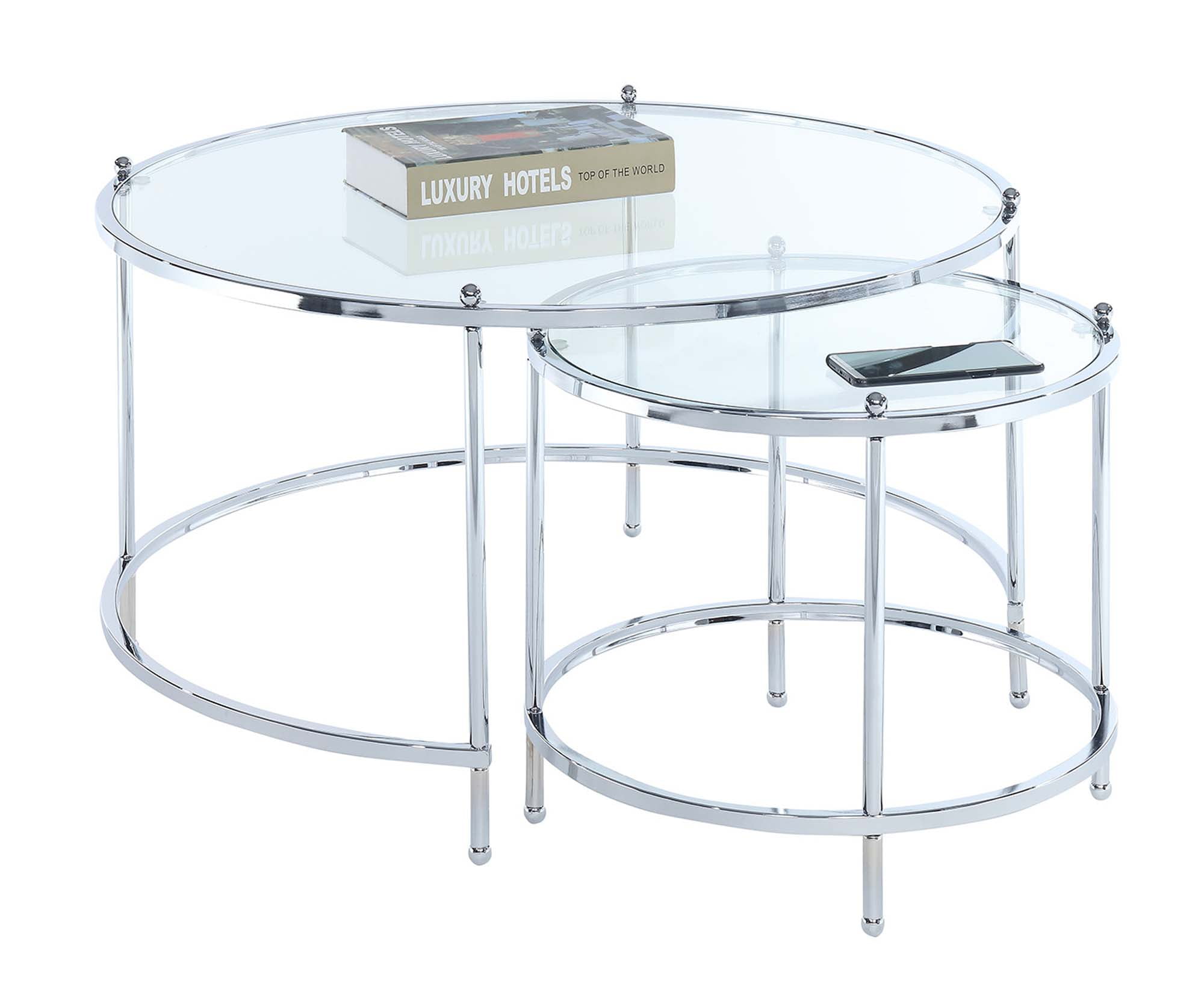 Royal Crest Nesting Round Coffee Table A must have 2 piece unit for your home, the Royal Crest Nesting Coffee Table brings topnotch style and functionality. With its nested design, it creates a multi level display that will become the center of attention in your abode. The beautiful craftsmanship is undeniable as this set is made from chromed metal and tempered clear glass inserts. The round tabletops provide enough space for your favorite centerpiece along with your living room essentials. Nest together when needed or use both glass tables when having multiple guests over for a cup of coffee. Assembles in just 4 steps with no tools required! Look for additional glam style items from the Royal Crest Collection and complete the look today! Each sold separately. Specifications: With its nested design, it creates a multi level display that will become the center of attention in your abode Part of the Royal Crest Collection by Convenience Concepts Provides a glam style to upscale your home decor Crafted from tempered clear glass and chromed metal Assembles in only 4 steps with no tools required!