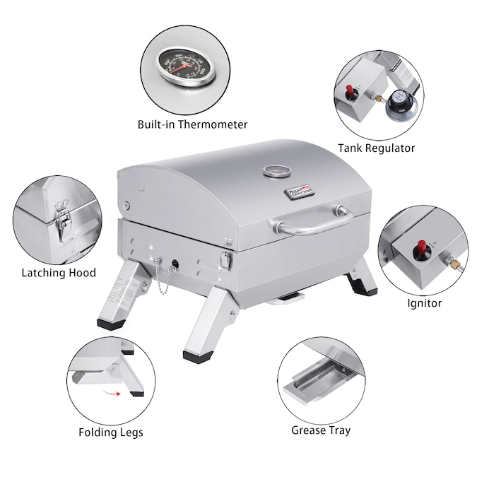 - Portable design: folding support legs and latching hood with compact handle make it easy to carry or store to the decks, patios, camping, tailgating and more, easy assembly with only a few steps