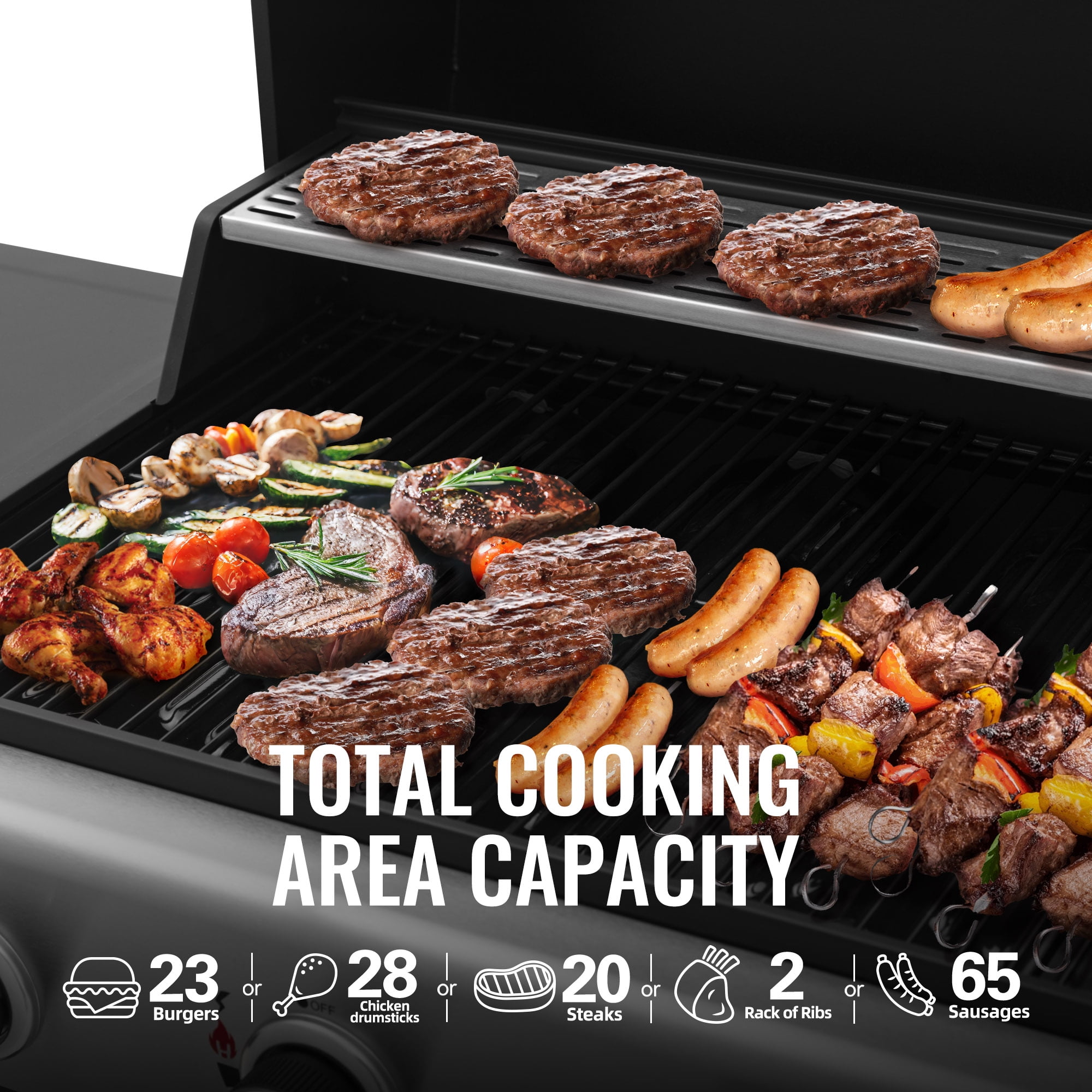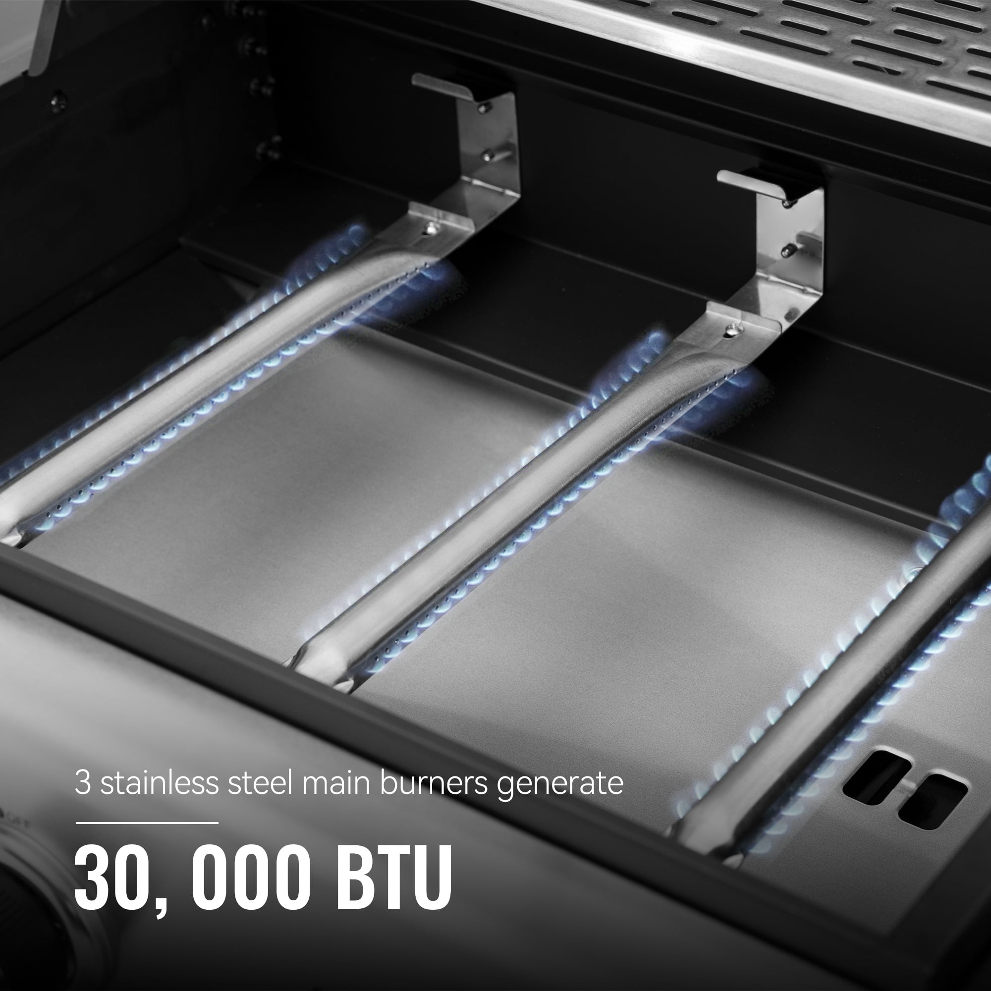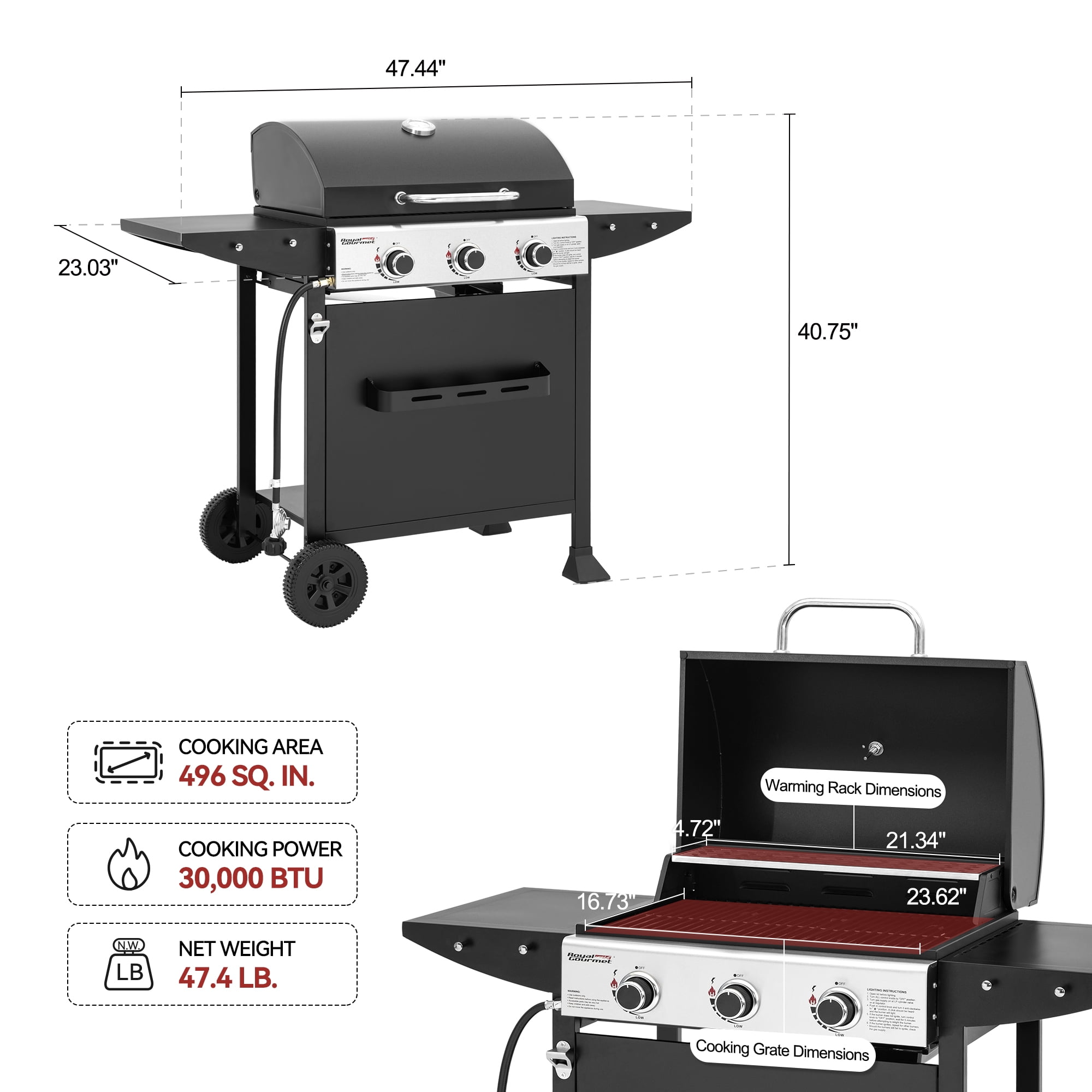1.Ample Cooking Area: 1.Porcelain-enameled steel wire cooking grates provide a 395 sq. in. primary cooking space, complemented by a 101 sq. in. warming area. With a total of 496 sq. in. cooking space, this grill can cook up to 23 burgers at once. 2.Consistent & Even Heat: With an output of 30,000 BTU in total, three stainless steel burners deliver consistent and even heat across the grilling area. Porcelain-enameled flame tamer provides even heat distribution. 3.Extra Prep Space: Two side shelves provide extra space for food prep and keep kitchenware within arms’ reach; two integrated hooks on each side also offer you convenience to hang grill tools. 4.Thoughtful Designs: Front storage basket is perfect for positioning your seasoning bottles. Additionally, the bottle opener is ready to serve you whenever you want to crack open a drink. 5.Stainless Steel Warming Rack: With superior heat retention, the warming rack keeps any food on the rack warm and avoids overcooking. Made of stainless steel, it is easy to clean and boasts extraordinary rust-and-corrosion resistance. 6.Hassle-free Cleanup: The effective grease management system, including removable grease tray and draw-out full-sized grease cup, allows you to easily dispose of grease, drippings, and food residue. 7.Reliable Upper Lid: The stainless steel handle allows for easy opening and closing. When closed, the lid offers excellent heat retention during cooking and reliable protection for the grill afterward. 8.Precise Temperature Control: A lid-mounted thermometer monitors temperature precisely in no time. You can easily check the fluctuation of internal grill temperature and achieve precise and real-time heat control. 9.Automatic Ignition System: This grill features a reliable and safe automatic ignition system which delivers fast and easy startups every time. It is easy to perform since no batteries are required. 10.Sturdy Construction: The stainless steel control panel is resistant to heat, rust and corrosion and easy to clean. Two sturdy wheels and two solid legs are designed for increased stability. Gross weight: 57.8 lb.