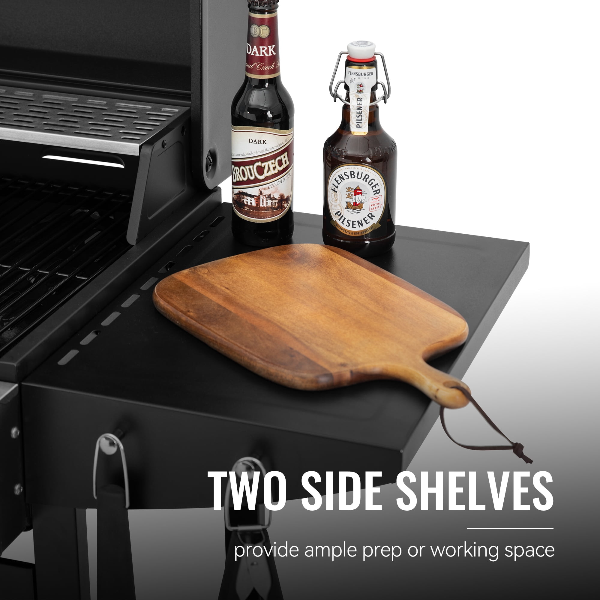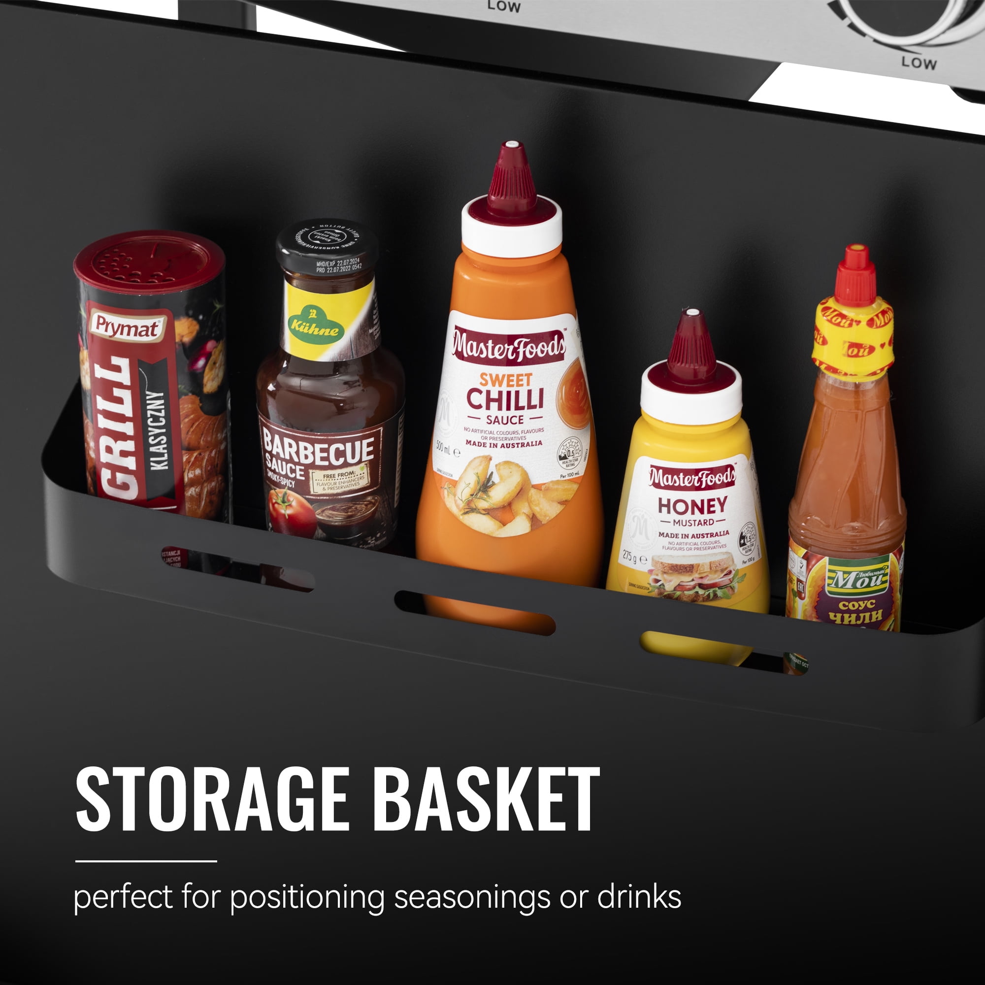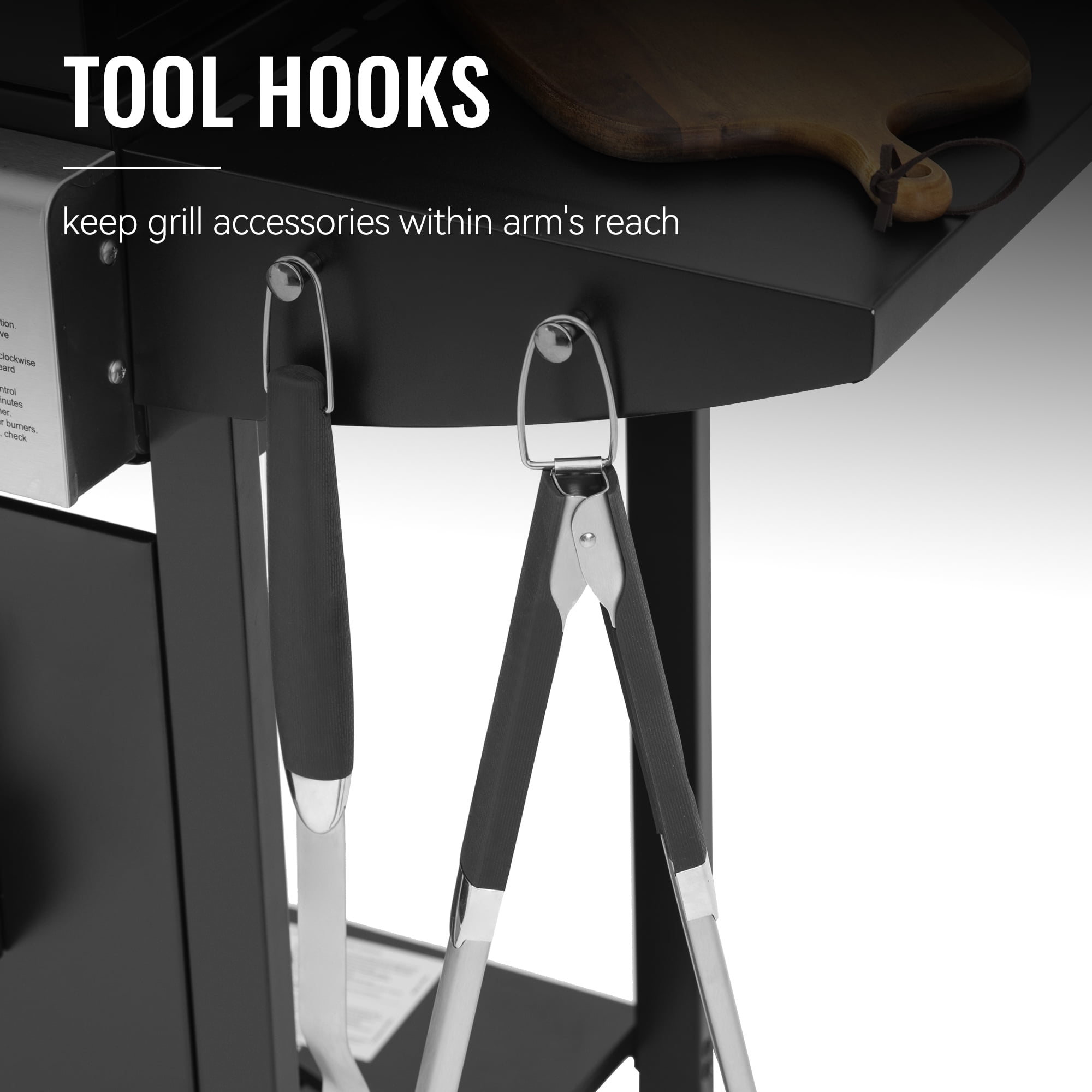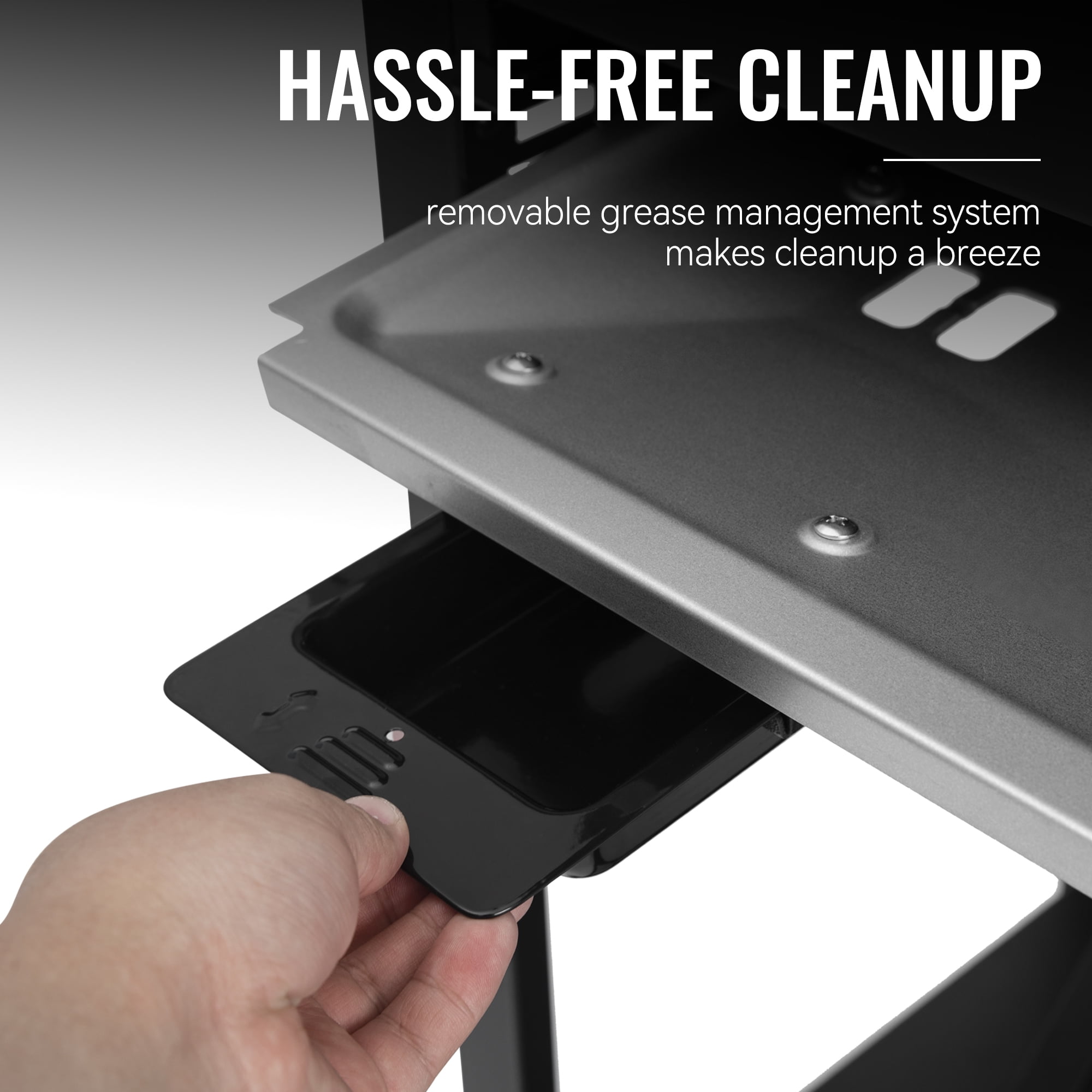 1.Ample Cooking Area: 1.Porcelain-enameled steel wire cooking grates provide a 395 sq. in. primary cooking space, complemented by a 101 sq. in. warming area. With a total of 496 sq. in. cooking space, this grill can cook up to 23 burgers at once. 2.Consistent & Even Heat: With an output of 30,000 BTU in total, three stainless steel burners deliver consistent and even heat across the grilling area. Porcelain-enameled flame tamer provides even heat distribution. 3.Extra Prep Space: Two side shelves provide extra space for food prep and keep kitchenware within arms’ reach; two integrated hooks on each side also offer you convenience to hang grill tools. 4.Thoughtful Designs: Front storage basket is perfect for positioning your seasoning bottles. Additionally, the bottle opener is ready to serve you whenever you want to crack open a drink. 5.Stainless Steel Warming Rack: With superior heat retention, the warming rack keeps any food on the rack warm and avoids overcooking. Made of stainless steel, it is easy to clean and boasts extraordinary rust-and-corrosion resistance. 6.Hassle-free Cleanup: The effective grease management system, including removable grease tray and draw-out full-sized grease cup, allows you to easily dispose of grease, drippings, and food residue. 7.Reliable Upper Lid: The stainless steel handle allows for easy opening and closing. When closed, the lid offers excellent heat retention during cooking and reliable protection for the grill afterward. 8.Precise Temperature Control: A lid-mounted thermometer monitors temperature precisely in no time. You can easily check the fluctuation of internal grill temperature and achieve precise and real-time heat control. 9.Automatic Ignition System: This grill features a reliable and safe automatic ignition system which delivers fast and easy startups every time. It is easy to perform since no batteries are required. 10.Sturdy Construction: The stainless steel control panel is resistant to heat, rust and corrosion and easy to clean. Two sturdy wheels and two solid legs are designed for increased stability. Gross weight: 57.8 lb.