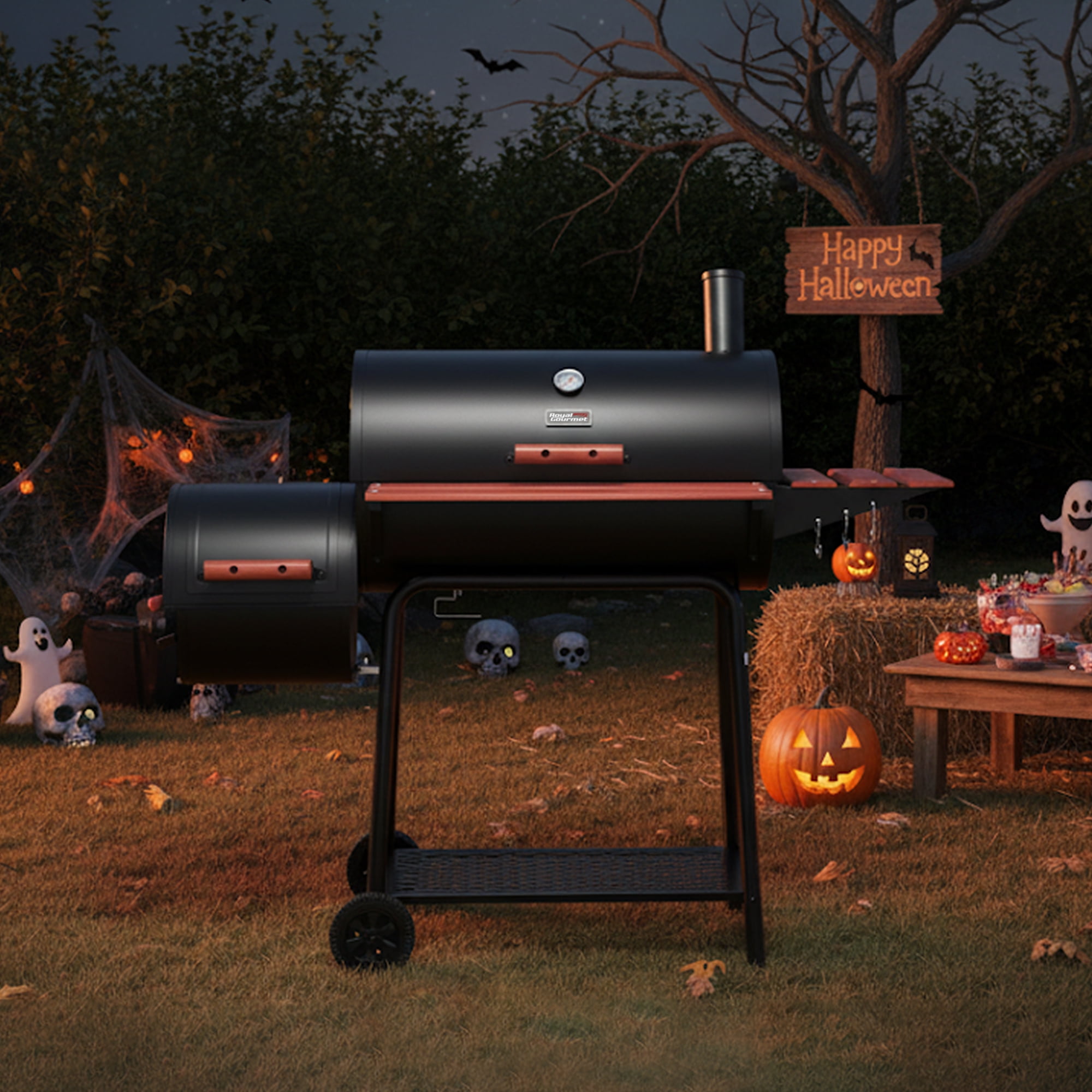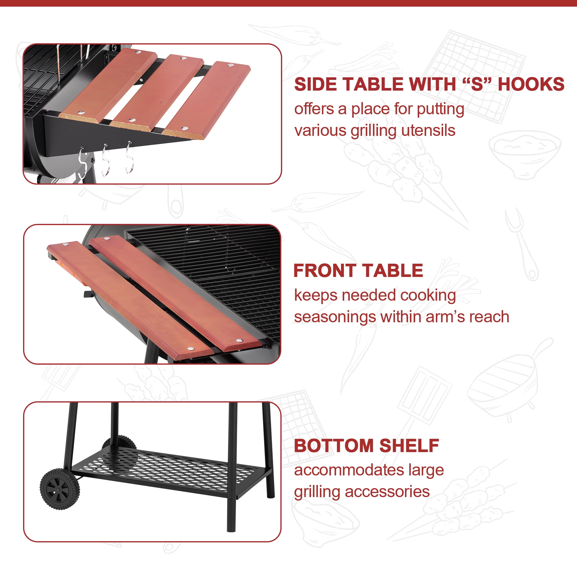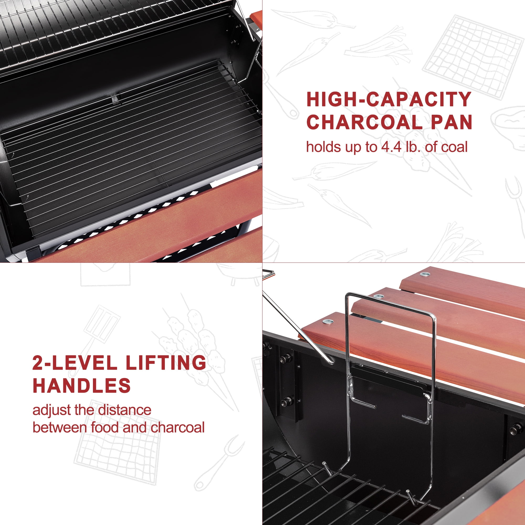 Royal Gourmet 30″ Charcoal Barrel Grill with Offset Smoker, Adjustable Grates and Thermometer Achieves excellent searing, flavorful grilling, and smoky tastes with the hot cooking grates of this charcoal grill Provides an XXL cooking area with 443 sq. in. porcelain-enameled steel wire grates, 184 sq. in. chrome-plated warming rack, and 184 sq. in. offset smoker Features an offset smoker that uses the side firebox to add authentic smoky flavors, making it ideal for small decks, patios, and backyards Includes a 2-level height-adjustable charcoal pan for improved heat control, holding up to 4.4 lbs. of coal Manages airflow with a side air damper to regulate oxygen flow and a smoke stack for precise heat control