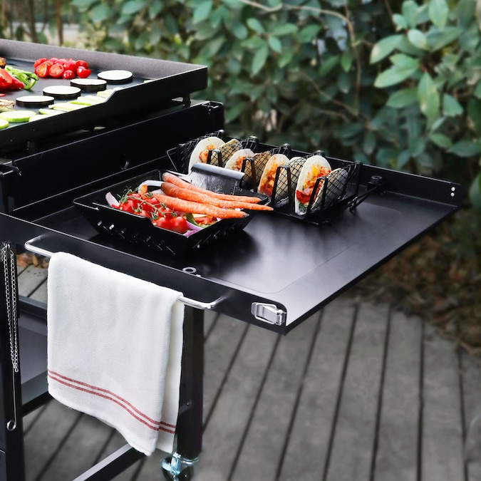- Lay down dual collapsible side shelves as work space when grilling or fold vertically to cover the whole cooking flat top for easy storage and protective transport.