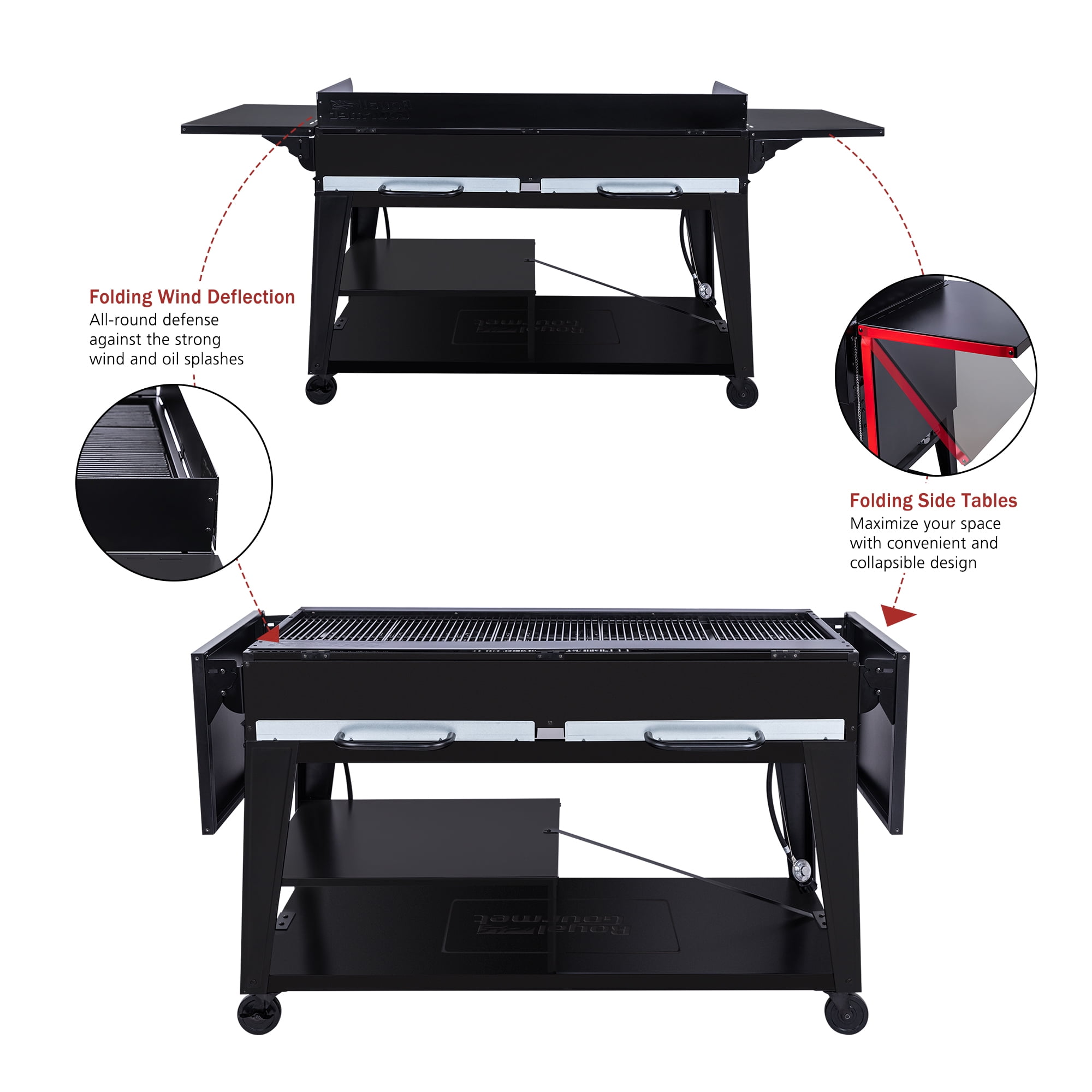 1. Large Event Grill: Porcelain-enameled steel wire cooking grates boast 947 sq. in. cooking space, and 8 stainless steel burners deliver 104,000 BTU cooking power (13,000 BTU each). 2.Dual Systems: Two gas supporting systems create individually controlled grilling zones. Two individual electronic ignition systems offer reliable spark at every push. Two grease management systems make cleanup simpler and easier. 3.Collapsible Designs: Folding wind deflector provides all-around defense against the wind and oil splashes, and folding side tables with utensil rails offer ample food preparation workspace. 4.Great Storage: Double-layer bottom shelf is designed for convenient storage of small tools and large accessories. 5.Flexibility: Four lockable caster wheels make it easy to move around. Color: Black ·Material: Steel; Porcelain-enameled steel wire (cooking grates) ·Product size: 90.31’’L (Length of folding tables: 62.99”L) x 27.56’’W x 40.35’’H ·Package size: 58.46”L x 26.97”W x 14.76”H ·Primary cooking space: 51.18”L x 18.50”W ·Net weight: 121.8 lb. ·Gross weight: 139.2 lb.