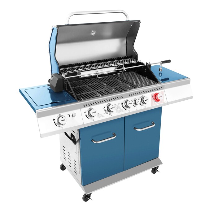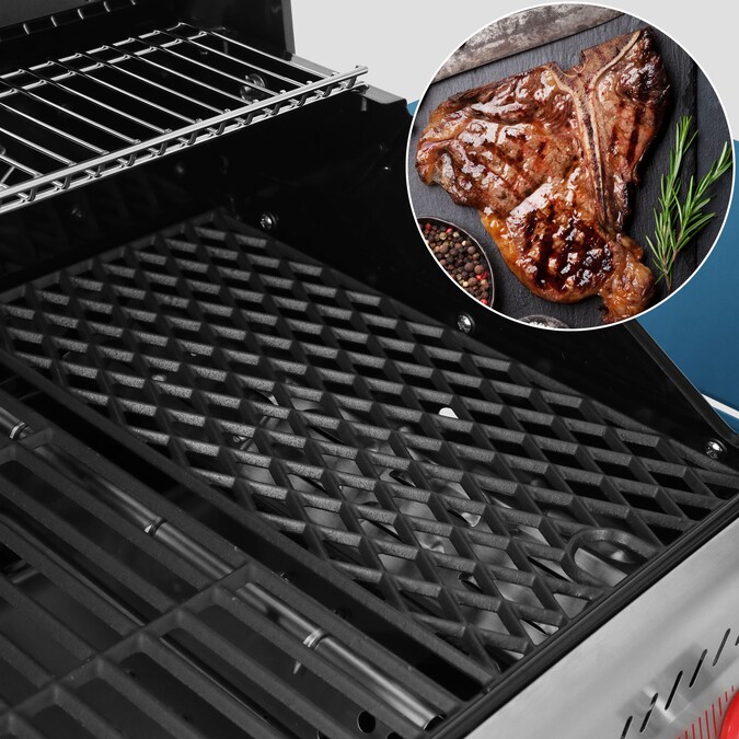- Diamond-shaped cast iron cooking grates are specially designed for scorching and sizzling steaks with sear burner; lidded side burner is ideal for cooking side dishes and sauces; powerful rear burner is perfect for rotisserie chicken.