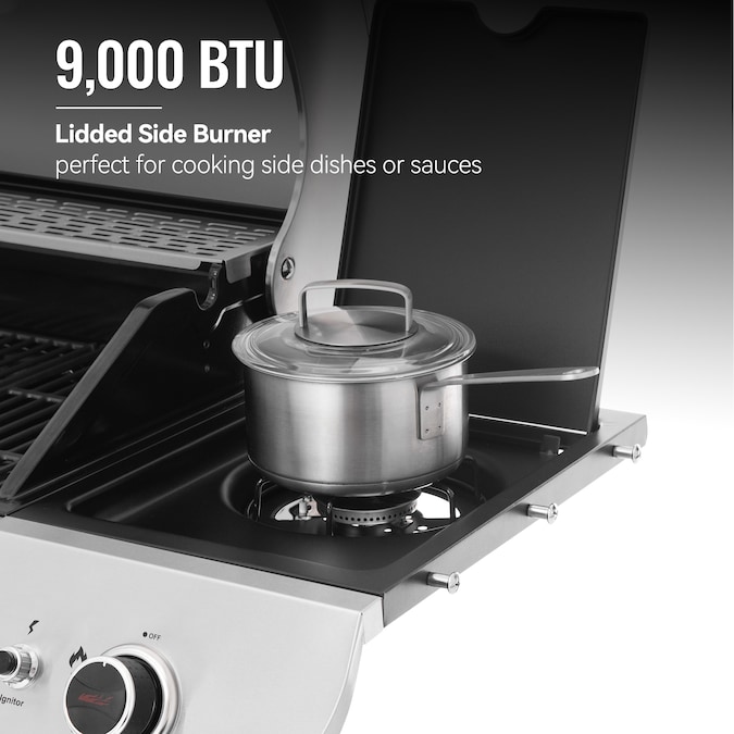 - This side burner allows for easy access to boiling water, preparing side dishes, or sauces; the lid folds down to protect the burner and provides additional workspace when not in use.
