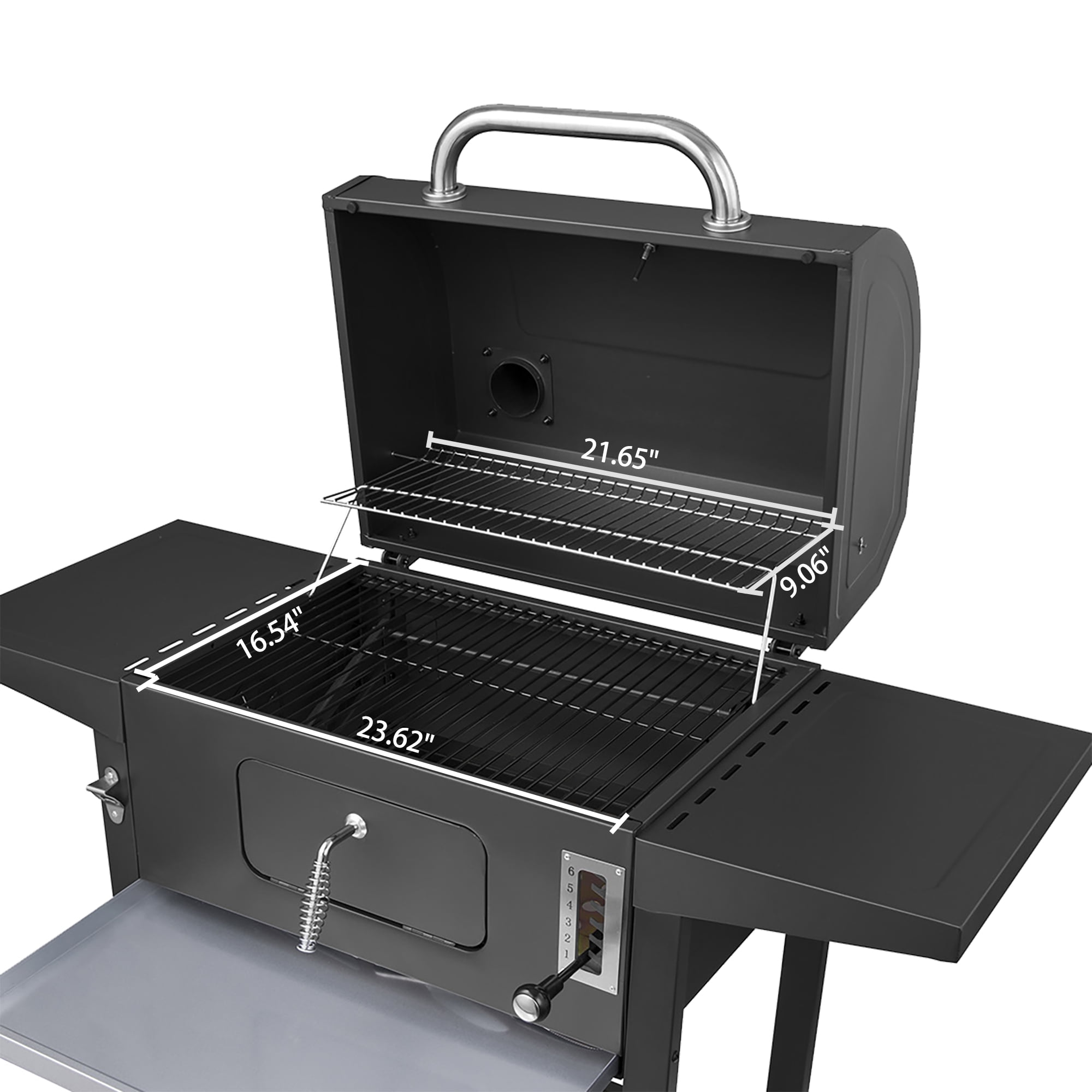 587 Square Inches: Includes 391 sq. in. porcelain-enameled steel wire cooking grates and 196 sq. in. chrome-plated warming rack. Height-adjustable Charcoal Pan: Charcoal pan which holds coals up to 2 kg/4.5 lb. fine-tunes temperature control with 6-level adjustable heights. Easy Charcoal Access: Open the door and add coals easily, no need to open the upper lid. Ample Space: Two fixed side tables offer extra seasoning workspace and bottom shelf provides additional storage space. Temperature Monitor: The built-in temperature gauge provides real-time and accurate heat monitoring. Product size: 49.61″L x 24.02″W x 47.24″H Package size: 30.31″L x 20.87″W x 16.93”H Primary cooking area: 23.62’’ x 16.54’’ Warming rack area:21.65’’ x 9.06’’ Net weight: 53.1 lb. Gross weight: 62.8 lb. Recommended grill cover: Royal Gourmet CR5402