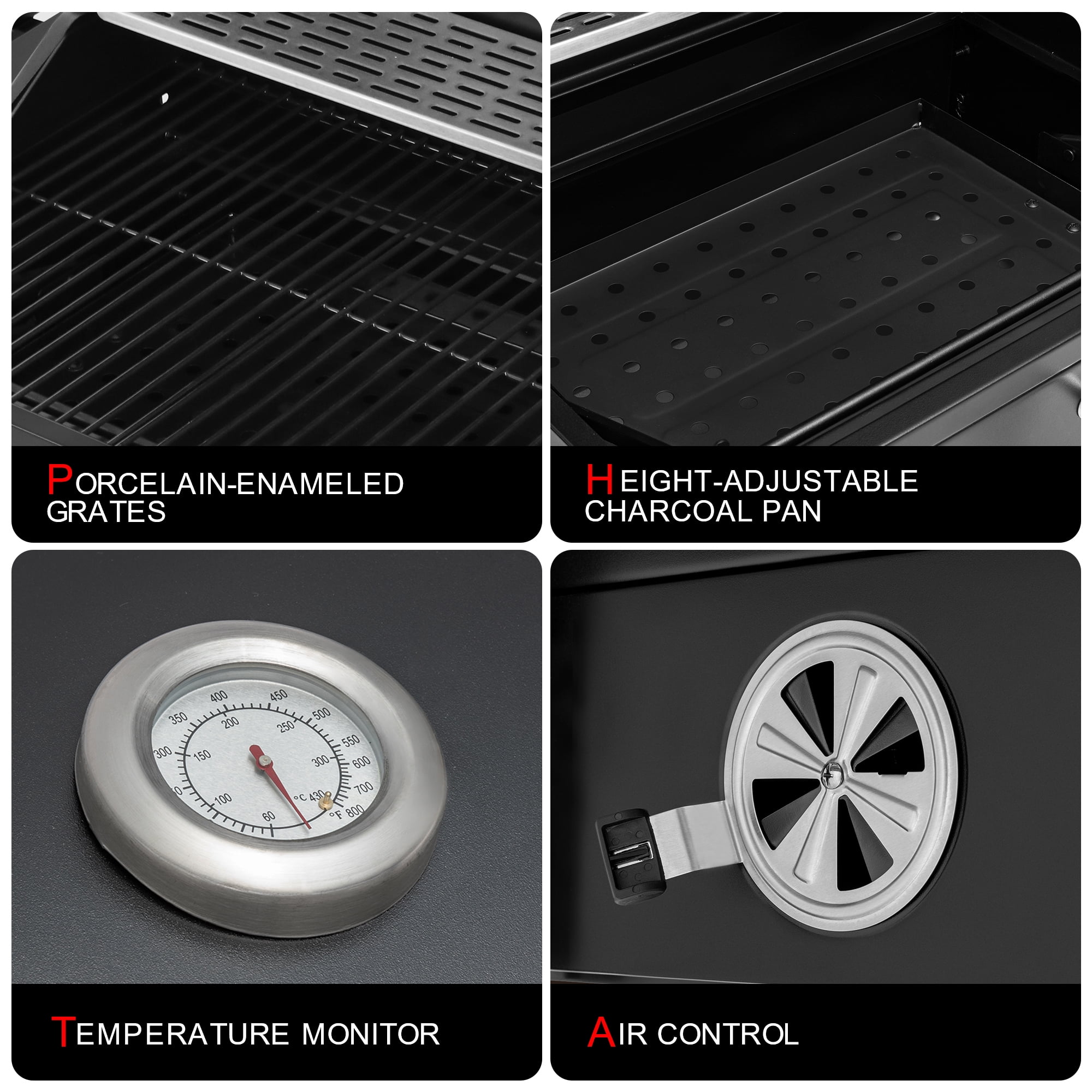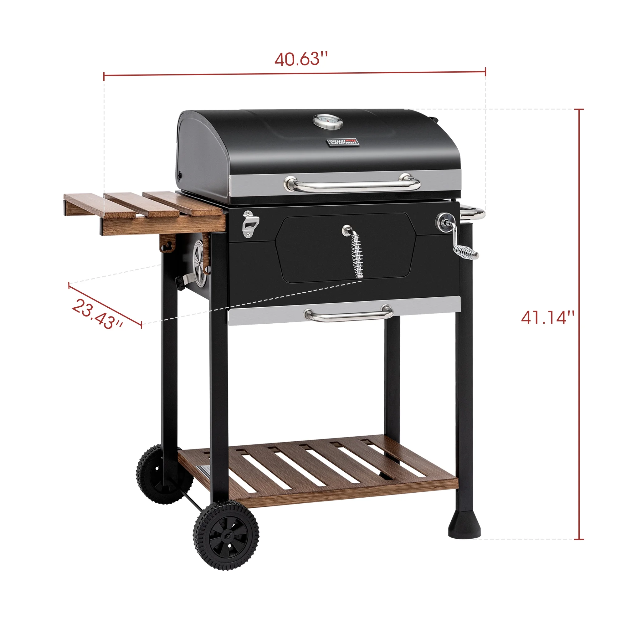 1.Spacious Cooking Area: 384 sq. in. porcelain-enameled steel wire cooking grates and 106 sq. in. stainless steel warming rack provide a total of 490 sq. in. cooking space respectively, serving up to 10 people. 2.Height-adjustable Charcoal Pan: The crank handle controls the distance between the charcoal pan and food for fine-tuning temperature and regulating heat. The charcoal pan holds charcoal up to 4.5 lb. for each use. 3.Convenient Access Door: Front charcoal access door with heat-resistant spring handle provides more convenience for adding charcoal and controls heat loss to a minimum during cooking. 4.Built-in Thermometer Gauge: The lid-mounted thermometer indicates the temperature changes precisely in real-time. 5.Air Flow: Two adjustable air vents control air circulation to enhance sufficient burning of charcoal for efficient smoking. Color: Black ·Material: Steel ·Product size: 40.63’’L x 23.43’’W x 41.14’’H ·Package size: 26.18” L x 21.46” W x 15.16”H ·Primary cooking area: 23.23” L x 16.54” W ·Warming rack area: 22.44” L x 4.72” W ·Net Weight: 40.1 lb. ·Gross Weight: 48.7 lb. ·Recommended grill cover: Royal Gourmet® CR5402