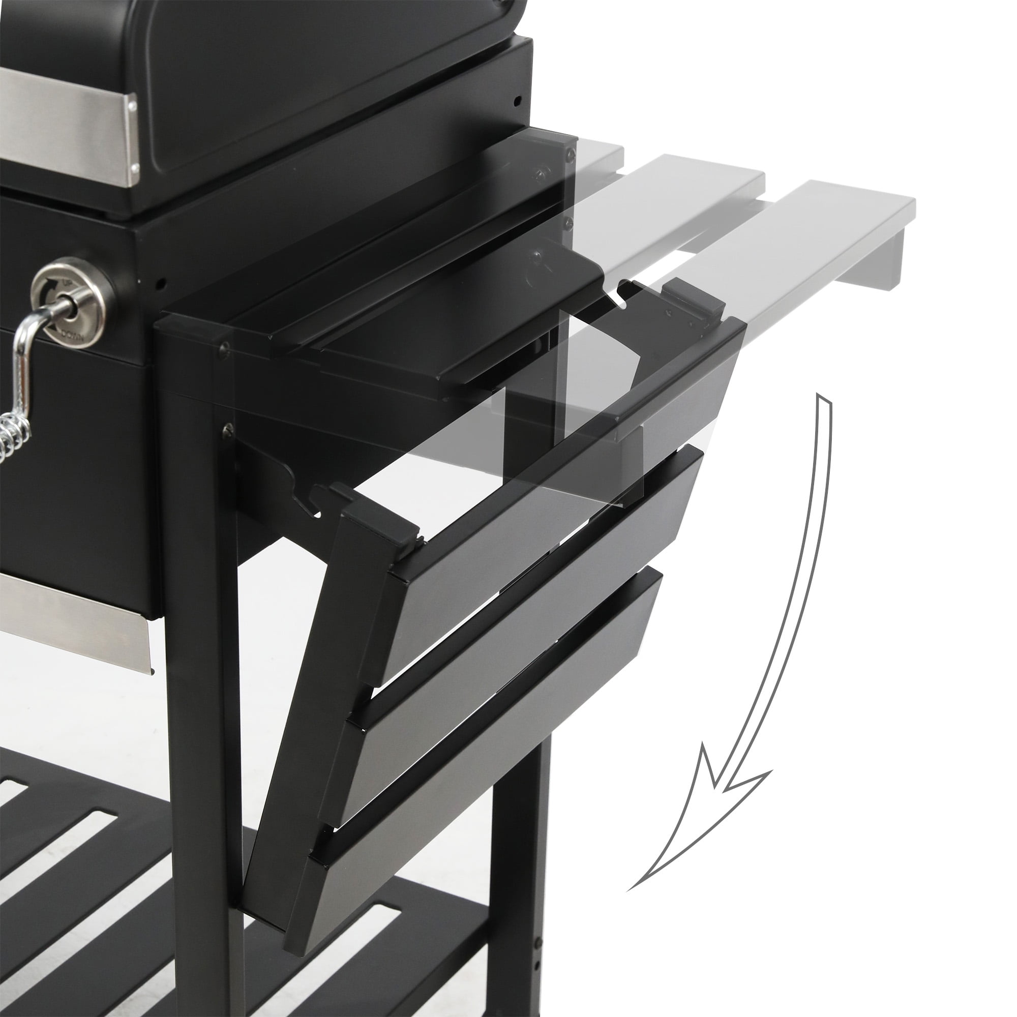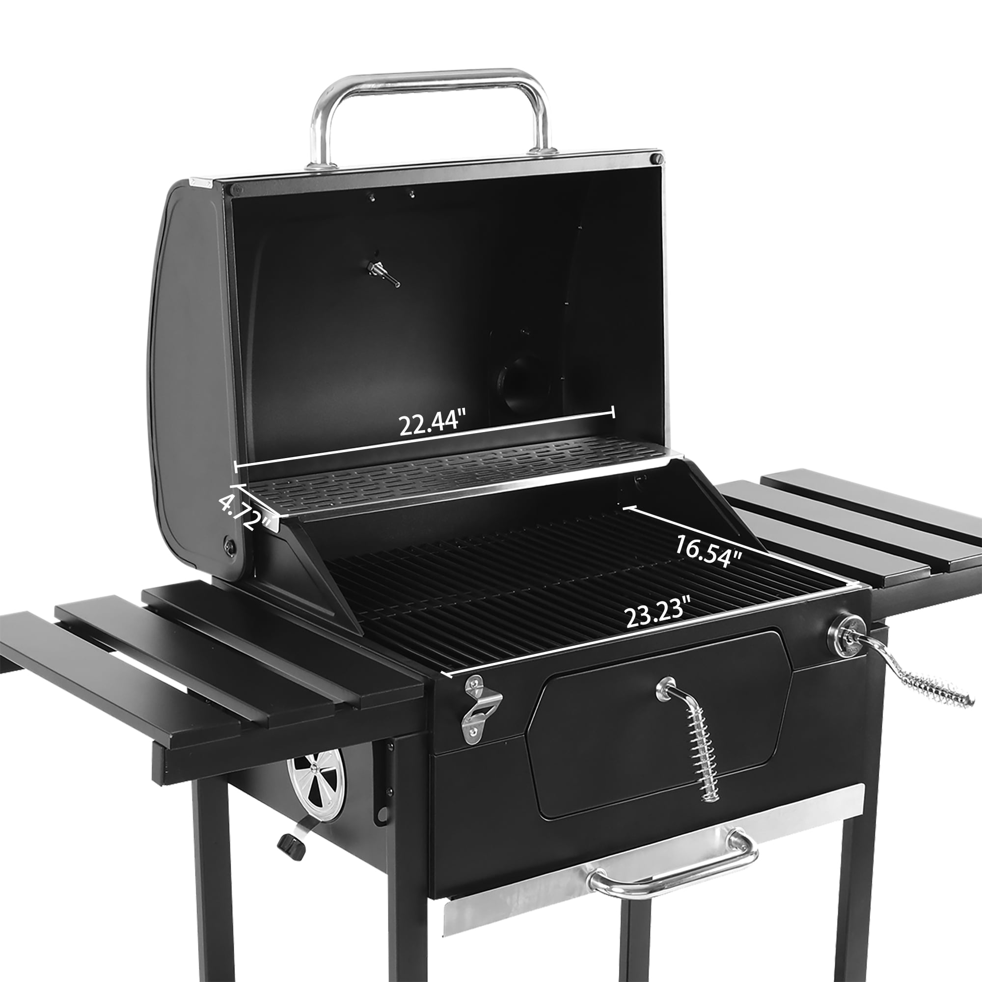 SPACIOUS COOKING AREA: A total of 474 square inches cooking area, including 368 sq. in. porcelain-enameled cooking grates and 106 sq. in. stainless-steel warming rack. HEIGHT-ADJUSTABLE CHARCOAL PAN: Height-adjustable charcoal pan, that can fine-tune the temperature during grilling, ensures the best performance. CONVENIENT ASH DISPOSAL: The galvanized draw-out ash tray collects ashes and makes it easy for dumping. EASY TO ADD COALS AND CLEAN ASHES: With the charcoal access door at the front, coals can be quickly added during grilling with minimum loss of heat. The galvanized draw-out ash tray collects ashes and makes it easy for dumping. AMPLE SPACE FOR PREPARATION AND STORAGE: Two foldable side tables offer extra work and prep space, and the bottom shelf provides additional storage space. EASY TO TRANSPORT: Two large wheels allows for easy-moving and can withstand the elements. LARGE CAPACITY: Caters for 8-10 people, perfect for family gatherings and small patio parties. Product size: 47.44 L x 24.61’’W x 47.05’’H Warming rack area:22.44’’ x 4.72’’
