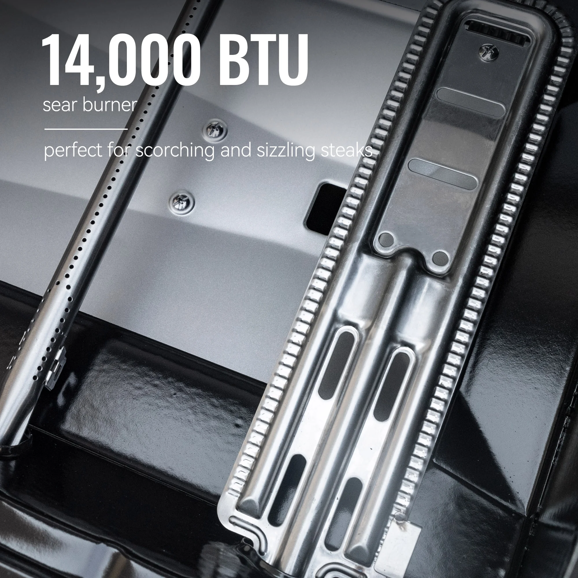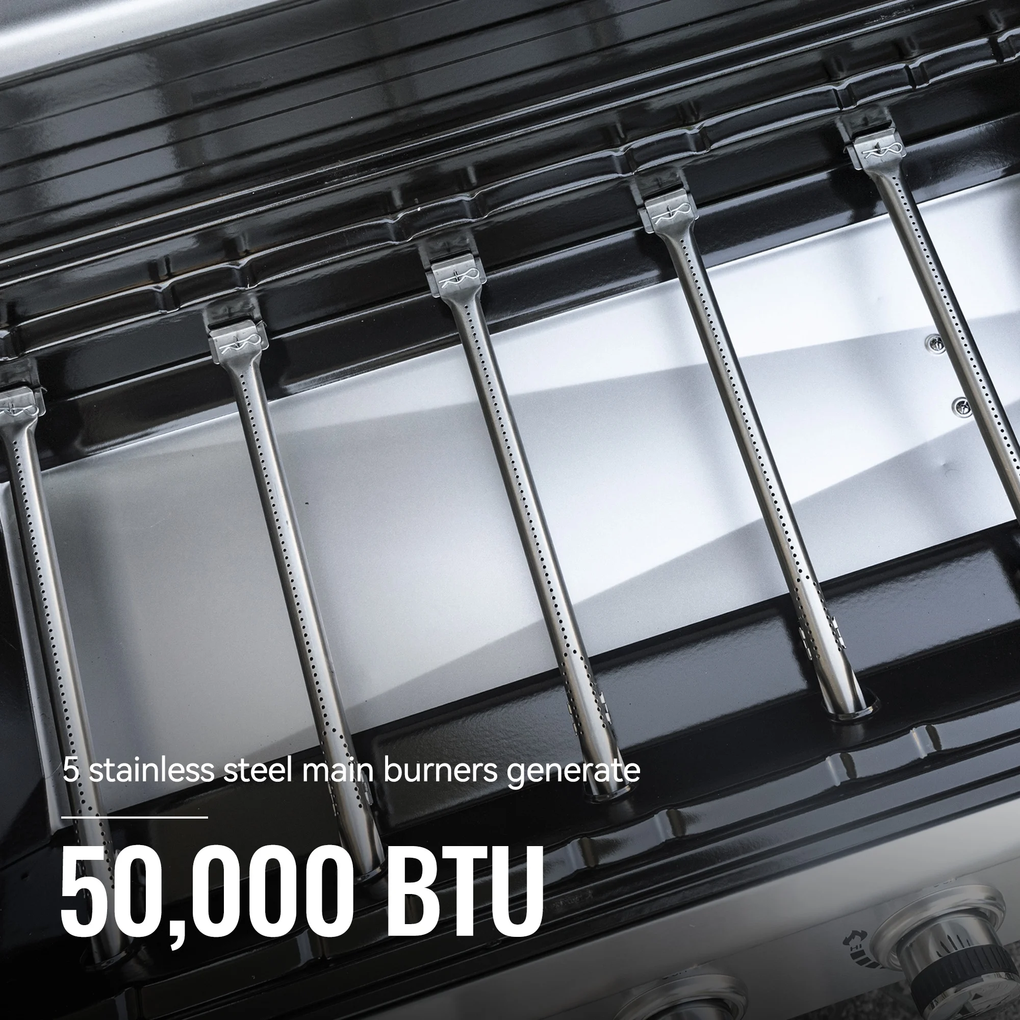 High Cooking Output: Powerful five tube burners (10,000 BTU each), a sear burner (14,000 BTU) and a side burner (10,000 BTU). With all burners in use, you will have a total of 74,000 BTU output that can heat up the grill in no time. Sufficient Cooking Capacity: Total of 892 square inches cooking area which can hold up to 39 hamburgers at one time. It can satisfy the need of an 8-10 gathering to conveniently cook as much gourmet food as possible. Burners for Different Purposes: With the capacity of offering 14,000 BTU power, the sear burner produces intense high heat for professional style searing. The single side burner is an appropriate choice to prepare side dishes. Fast & Even Heat: One-button electronic ignition system, reliable enough to fire up burners immediately. Stainless steel flame tamers and porcelain-enameled cast iron cooking grates help distribute heat evenly throughout the whole cooking surface. Mess-free Cleanup: Cast-aluminum removable grease tray and porcelain-enameled grease cup reduce the risk of flare-ups. It’s easy to slide out and dump residues, thereby simplifying the cleanup procedure. Color: Olive Green Material: Steel (Main body); Porcelain-enameled Cast Iron (Cooking grates); Chrome-plated Steel Wire (Warming rack); Porcelain-enameled (Lid) Product size: 62.01’’L x 25.00’’W x 45.67’’H Package size: 44.49” L x 28.94” W x 21.46”H Primary cooking area: 37.01” L x 18.11” W Warming rack area: 35.24” L x 6.30” W Net weight: 118 lb. Gross weight: 143.1 lb. Recommended grill cover: Royal Gourmet® CR6412 Hose Length: 19.69 inch