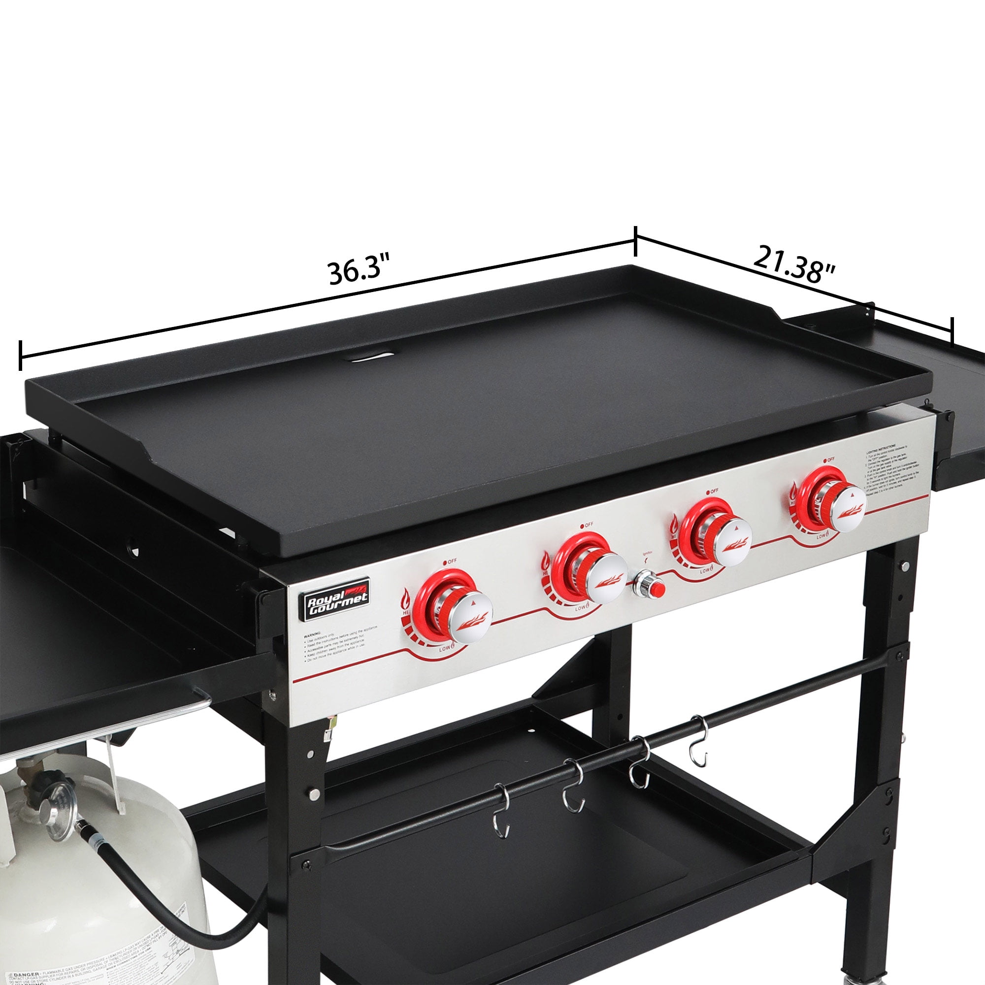 Powerful Heating System: 4 independently controlled stainless steel tube burners with 13,000 BTU each, 52,000 BTU cooking power in total. Spacious Cooking Surface: 748 square inches cooking area with 7 gauge pre-seasoned steel flat top caters for large events or outdoor activities. Quick Start-up: Electronic ignition system on the durable stainless steel control panel offers a reliable spark at every push. No Fussy Cleanup: This grill makes the cleanup a breeze with efficient grease management system that facilitates easy and hassle-free cleanup. Dual Collapsible Side Shelves: Lay down dual side shelves to the left and right sides respectively as work space when grilling or fold vertically to cover the whole cooking flat top for easy storage and protective transport. 47.44’’L x 25.20’’W x 13.53’’H(Dual shelves and four legs fold) (including side handles) Package size: 41.73”L x 26.38”W x 15.75”H Primary cooking area: 36.30’’ x 21.38’’ Net weight: 128.3 lb. Gross weight: 140.0 lb. Recommended grill cover: Royal Gourmet CR4014