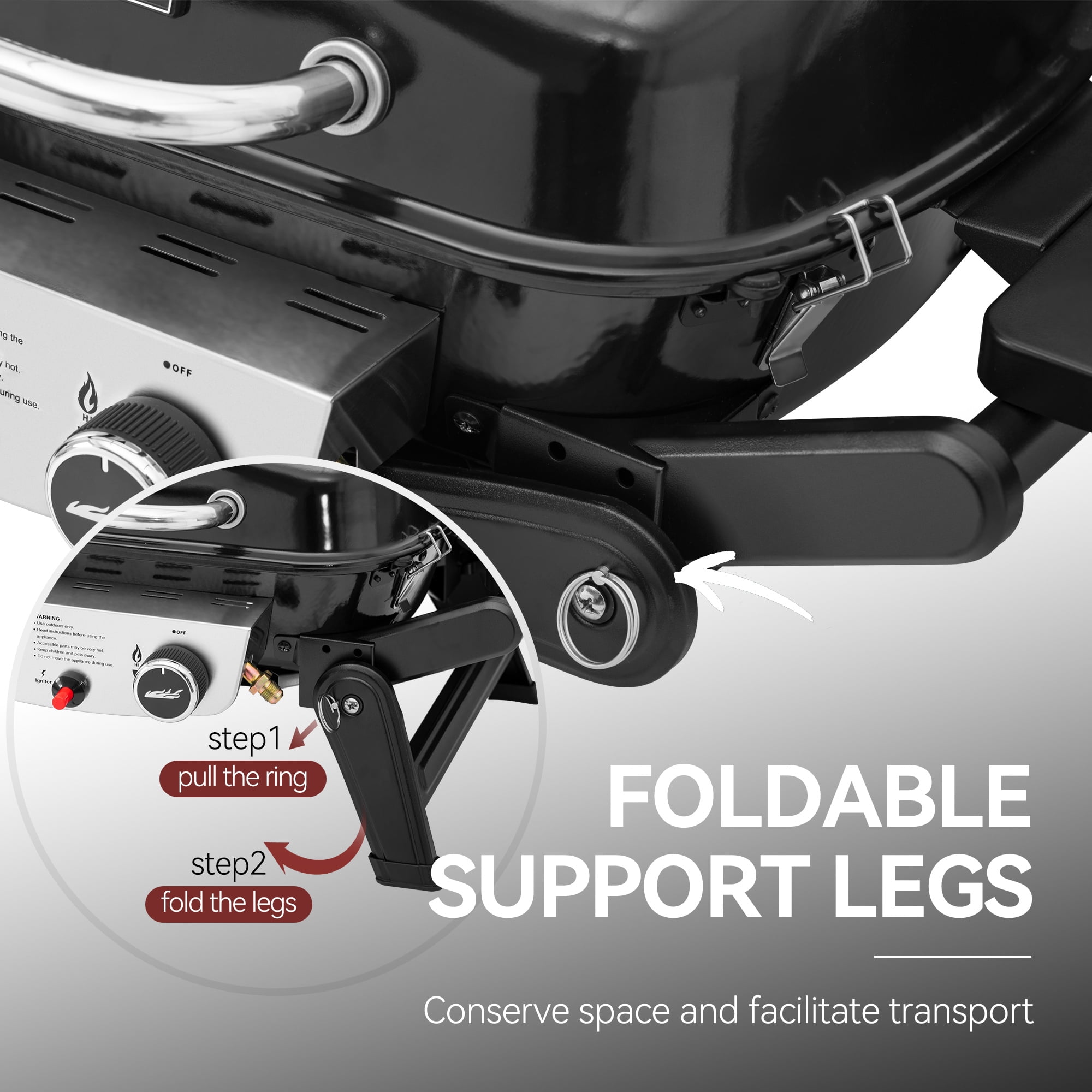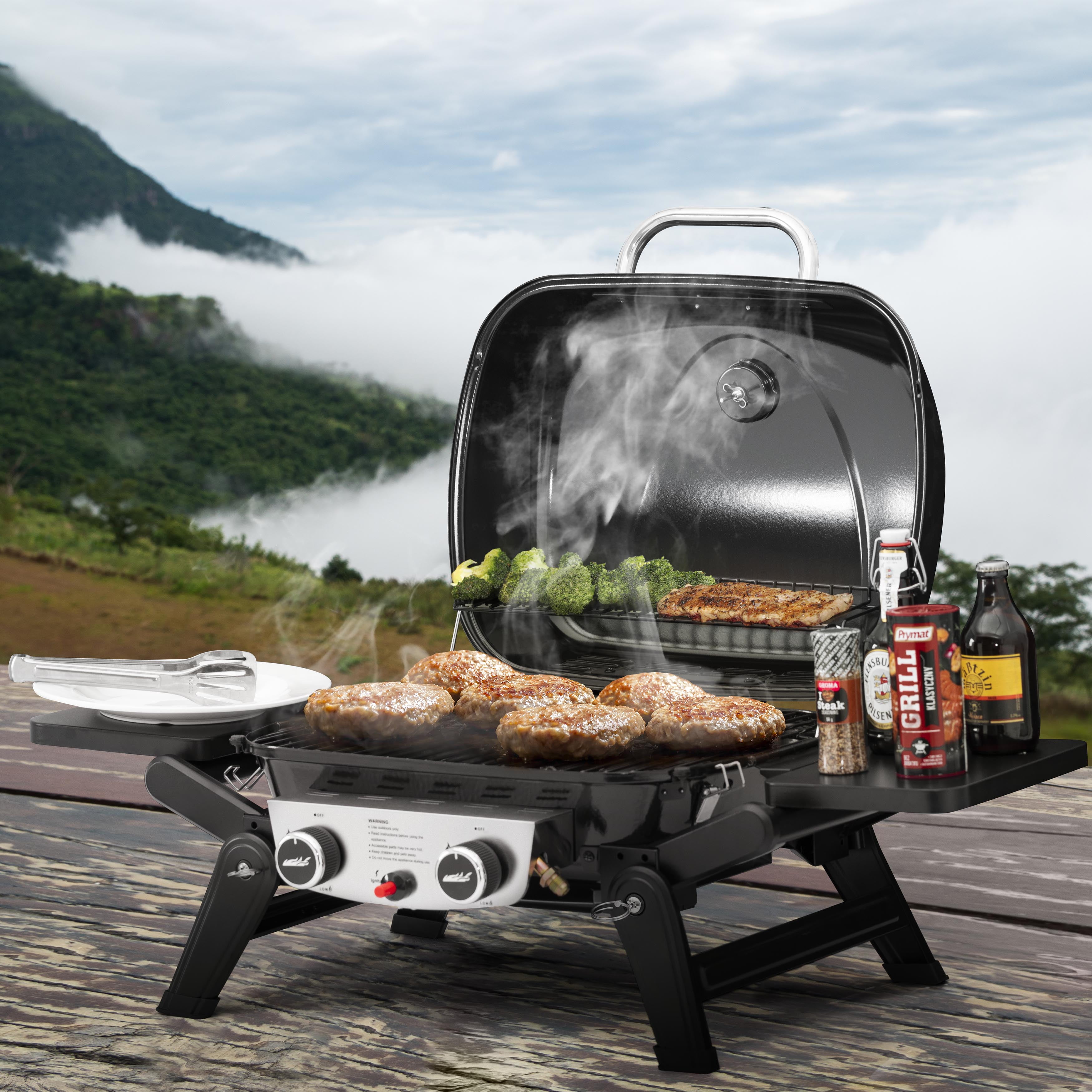 1.Perfect for Outdoor Settings: Whether camping under the stars or picnicking at the park, this tabletop grill effortlessly adapts to any outdoor setting. Its portability elevates any gathering with a tantalizing aroma and flavor. 2.Ample Cooking Space: With a spacious 270 sq. in. main cooking area, this grill offers ample room for meats, vegetables, and more to perfection. Additionally, it includes an extra 100 sq. in. warming rack for keeping cooked food warm. 3.Compact Size: Measuring just 26.06 x 18.90 x 11.02 in. when side tables and support legs are folded, this grill is your perfect outdoor companion, making it easy transportation and snug storage in your trunk or RV without occupying much space. 4.Foldable Side Tables: Simply extend the side tables as needed to provide extra space for keeping your grilling essentials within reach and fold them away for compact storage once the grilling festivities come to an end. 5.On-the-Go Ignition: With its piezo ignition system, this grill creates a spark at the burner, providing quick and hassle-free startup wherever you are, eliminating the need for matches or lighters. 6.Stainless Steel Burners: It boasts 2 stainless steel burners, each capable of generating 8,500 BTU, ensuring rapid and even heating across the cooking surface, which allows you to achieve perfectly cooked meals with ease. 7.Temperature Gauge: The built-in temperature gauge allows you to monitor the cooking temperature inside the cooking chamber accurately, provides precise control over the grilling process, and helps to achieve optimal results. 8.Foldable Support Legs: With sturdy support legs, this grill stands firm on uneven terrain, ensuring a stable cooking surface for your culinary creations. When not in use, simply fold the legs to conserve space. 9.Convenient Cleanup: Equipped with a removable grease cup positioned beneath the grill, it facilitates effortless collection and disposal of excess grease and drippings for a consistently clean and hassle-free grilling experience. 10.Enhanced Airflow: Ventilation holes positioned on the lid’s back promote consistent airflow, aiding in temperature regulation and flare-up prevention, thus providing a controlled and enjoyable grilling experience. Color: Black Material: Steel (Main body); Stainless Steel (Control Panel); Porcelain-enameled steel wire (cooking grate and warming rack) Product Size: 38.03’’ L x 18.90’’ W x 15.00’’ H Product Size (fold side tables and legs): 26.06’’ L x 18.90’’ W x 11.02’’ H Package Size: 27.95” L x 20.87” W x 10.83” H Grilling Grate Area: 18.51” L x 14.57” W Warming Area: 15.95” L x 6.30” W Net weight: 23.4 lb. Gross weight: 28.4 lb.