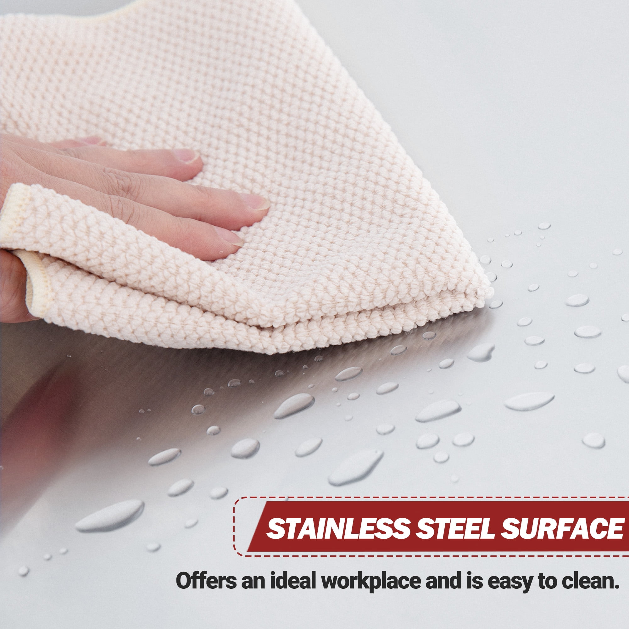 1.Multipurpose Worktop: Made from stainless steel, the 34″ L x 20″ W tabletop facilitates an ideal workplace to serve both indoor and outdoor cooking needs, like setting up a portable barbecue grill meanwhile preparing food aside. 2.Impressive Storage: Besides the tabletop, you may also place food materials, seasonings and cooking accessories on the middle shelf, meanwhile put other utensils and boxes at the bottom, all within arm’s reach. 3.Sturdy Structure: The heavy-duty steel base frame composed of 4 robust tube legs enables the table to stay stable on uneven grounds. 4.Removable Trash Bag Holder: A side trash holder is available for handy use and is removable to save storage space. 5.Mobility: The table is equipped with two directional wheels and a side handle bar to move smoothly between venues. Color: Silver ·Material: Stainless steel(tabletop); Steel ·Product size: 45.98″/39.65″(with/without side trash holder) L x 23.82″ W x 31.73″ H ·Package size: 35.43″ x 21.46″ x 4.72″ ·Tabletop area: 33.46″ L x 19.69″ W ·Net weight: 28.9 lb. ·Gross weight: 33.5 lb.