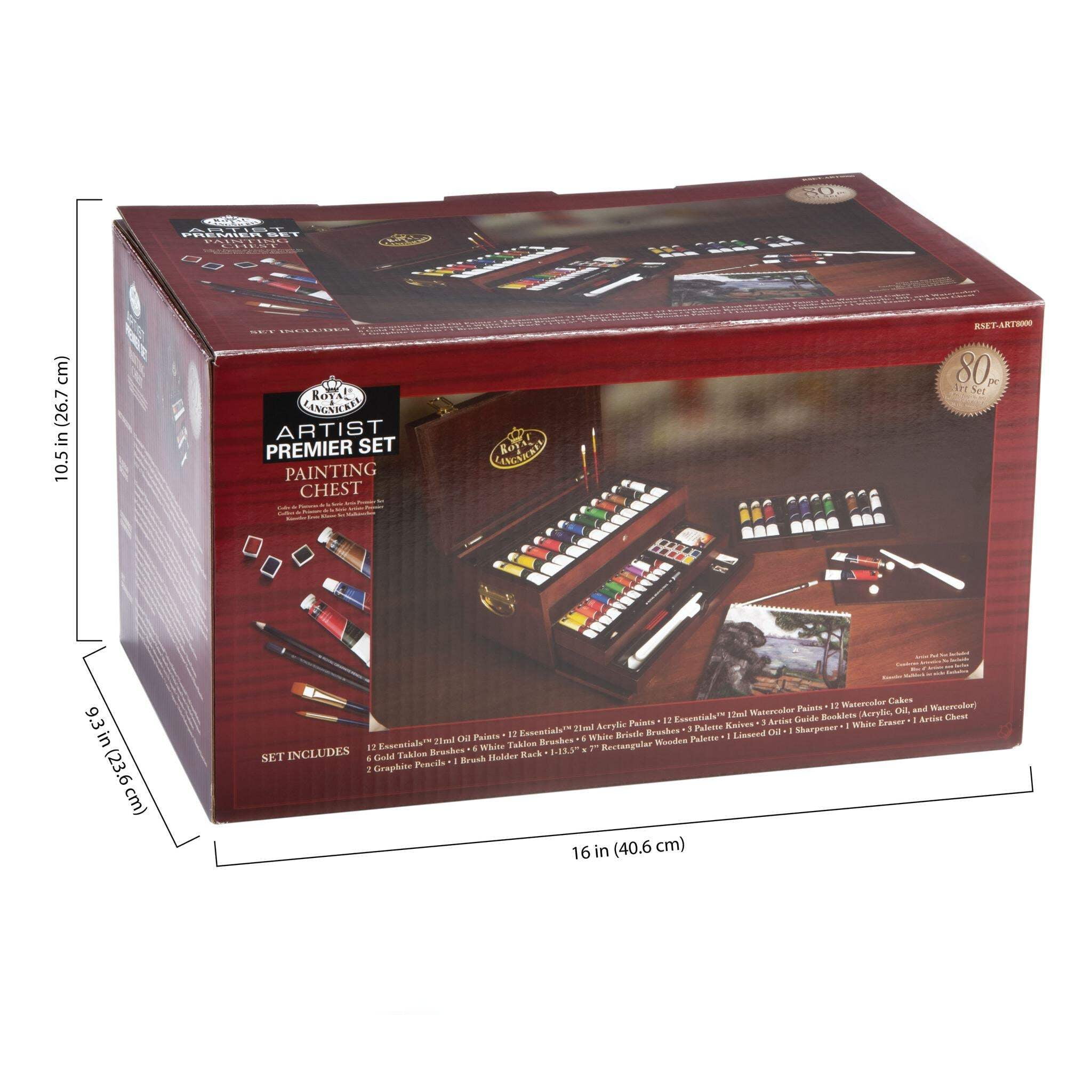 80pc Set Includes- 12 Acrylic Paints (21 ml / 0.71 US fl. oz.), 12 Watercolor Paints (12 ml / 0.4 US fl. oz.), 12 Oil Color Paints (21 ml / 0.71 US fl. oz.), 12 Watercolor Pans, 6 Gold Taklon Brushes, 6 White Bristle Brushes, 6 Black Taklon Brushes, 3 Palette Knives, 3 Instructional Guide Booklets, 2 Graphite Pencils, 1 Linseed Oil, 1 Wooden Palette, 1 Eraser, 1 Sharpener, 1 Brush Holder Rack, and 1 Wooden Artist Chest Beautifully crafted wooden box is included to keep all of your supplies neatly organized. Perfect artist tool set for beginners, students, professionals, crafters, artists and hobbyists.