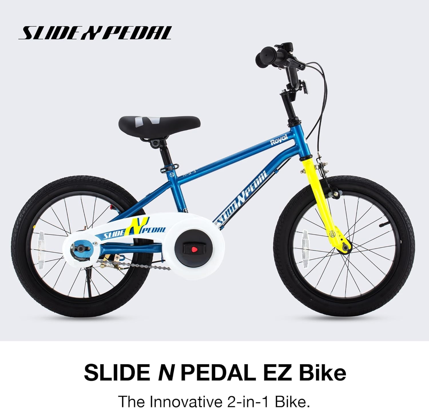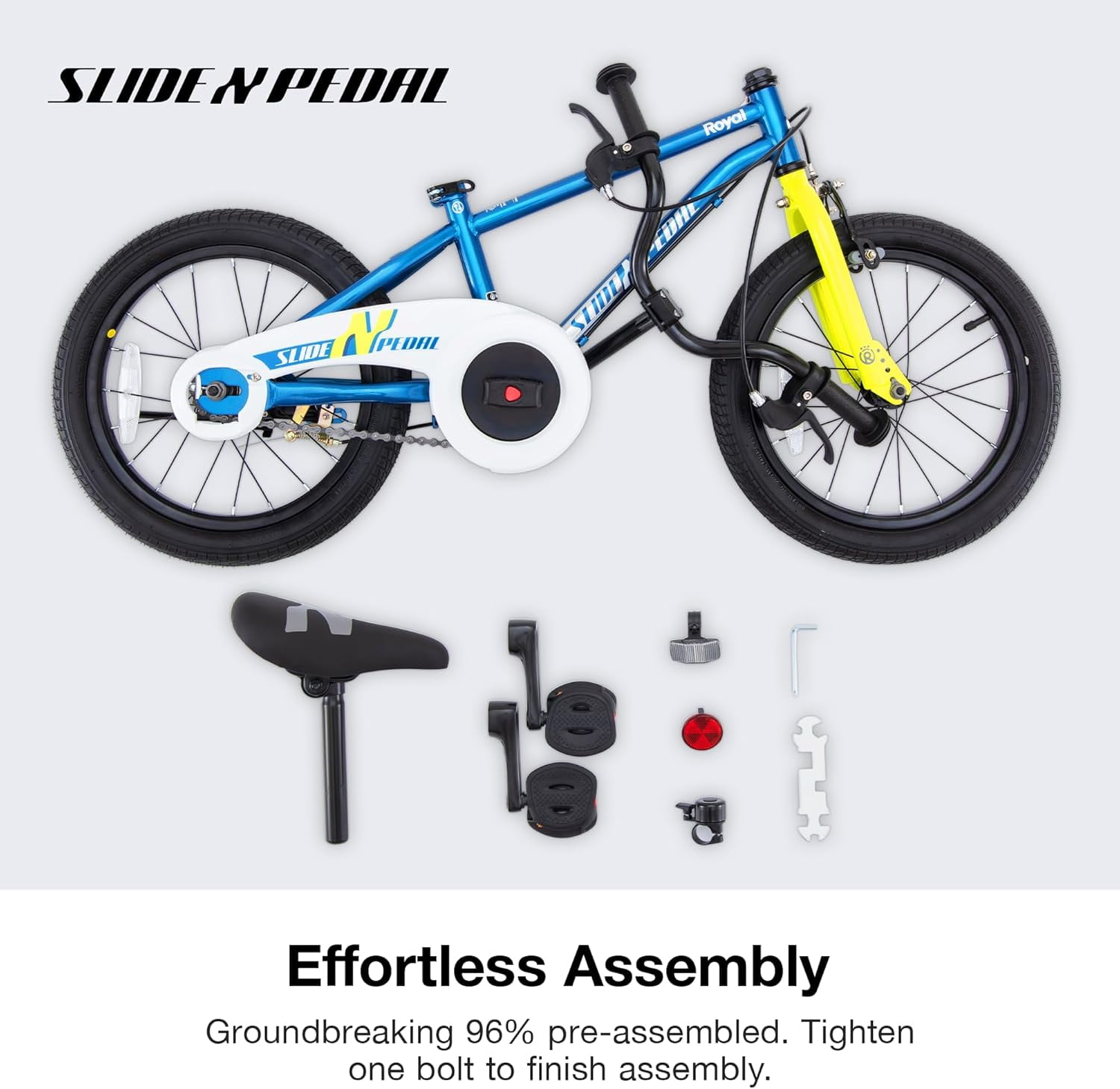 TWO TYPES OF BIKE. Balance bike is an excellent start for beginners, and we take it a step further. The new-launched RoyalBaby EZ bike allows kids to learn balancing first to gain confidence, and seamlessly transform into a real pedal bike. OPTIMIZED WEIGHT AND GEOMETRY. The EZ bike reduced 20% by frame weight compared to average. The exclusive child-friendly geometry gives kids an optimal riding posture. With the lower frame position, height adjustable saddle and handlebar, even young toddlers can easily have their feet touching the ground and start confidently. HASSLE-FREE ASSEMBLY. Comes 98% Pre-Assembled. The patent cranks and footrest feature a tool-less quick release design. With one button click, the EZ bike can switch between a balance bike and a pedal bike.