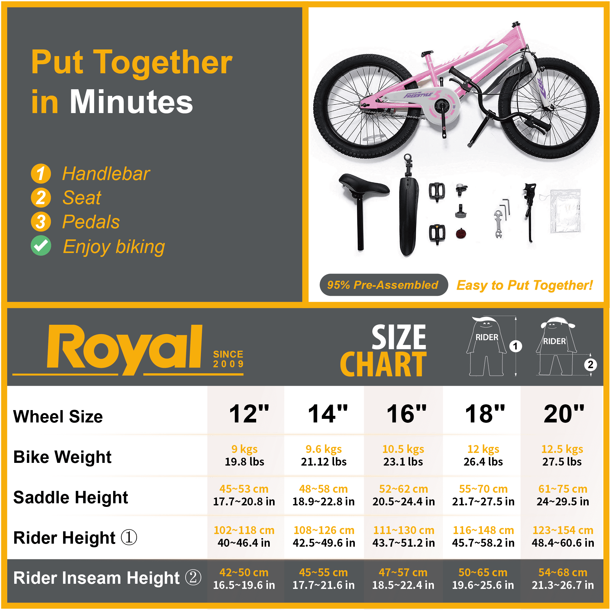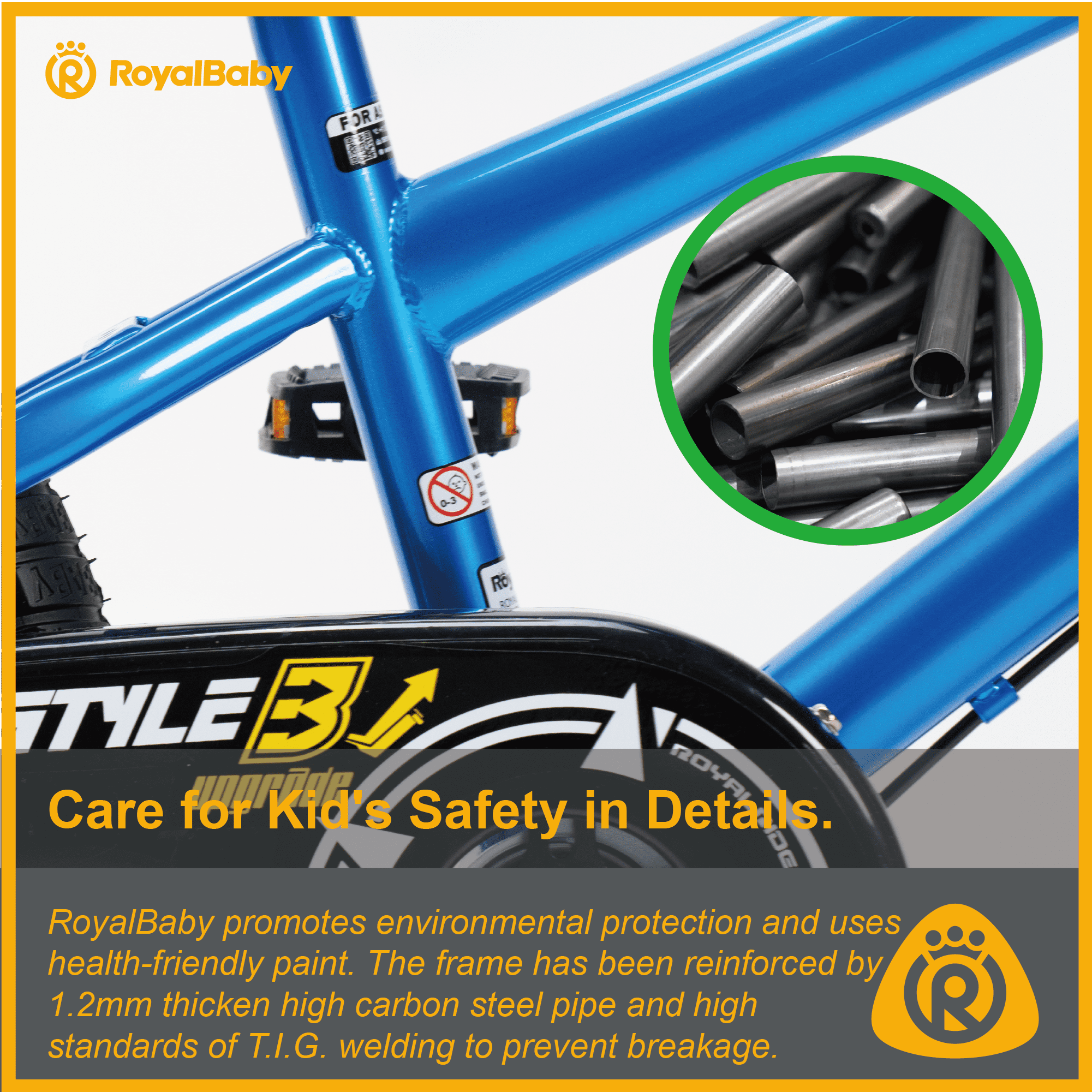 Components tailored for kids: Bottom Bracket: Maintenance-free and low rolling resistance sealed bearing for a long-lasting smooth ride. Pedals: Wider with more dots to enhance grip. Brake lever: Shorter travel distance lever makes it easier for younger riders to grab and squeeze. Training wheel: Reinforced training wheel legs with wider distance provide more maneuverability during sharp turns. Brakes: Reliable front caliper brake and rear coaster brake. Water bottle: The premise of enjoying outdoor time is to stay hydrated with our FDA-certified water bottle. Saddle: The handle on the saddle makes coaching and carrying easier for parents. Height adjustable: Both the height of handlebar & saddle can be adjusted to better match the little rider, bringing a more comfortable cycling for kids! For tips and tricks on RoyalBaby bike assembly and maintenance, visit our Youtube channel by search RoyalBaby. For more RoyalBaby Content, visit our Instagram by search Royalbabyglobal.