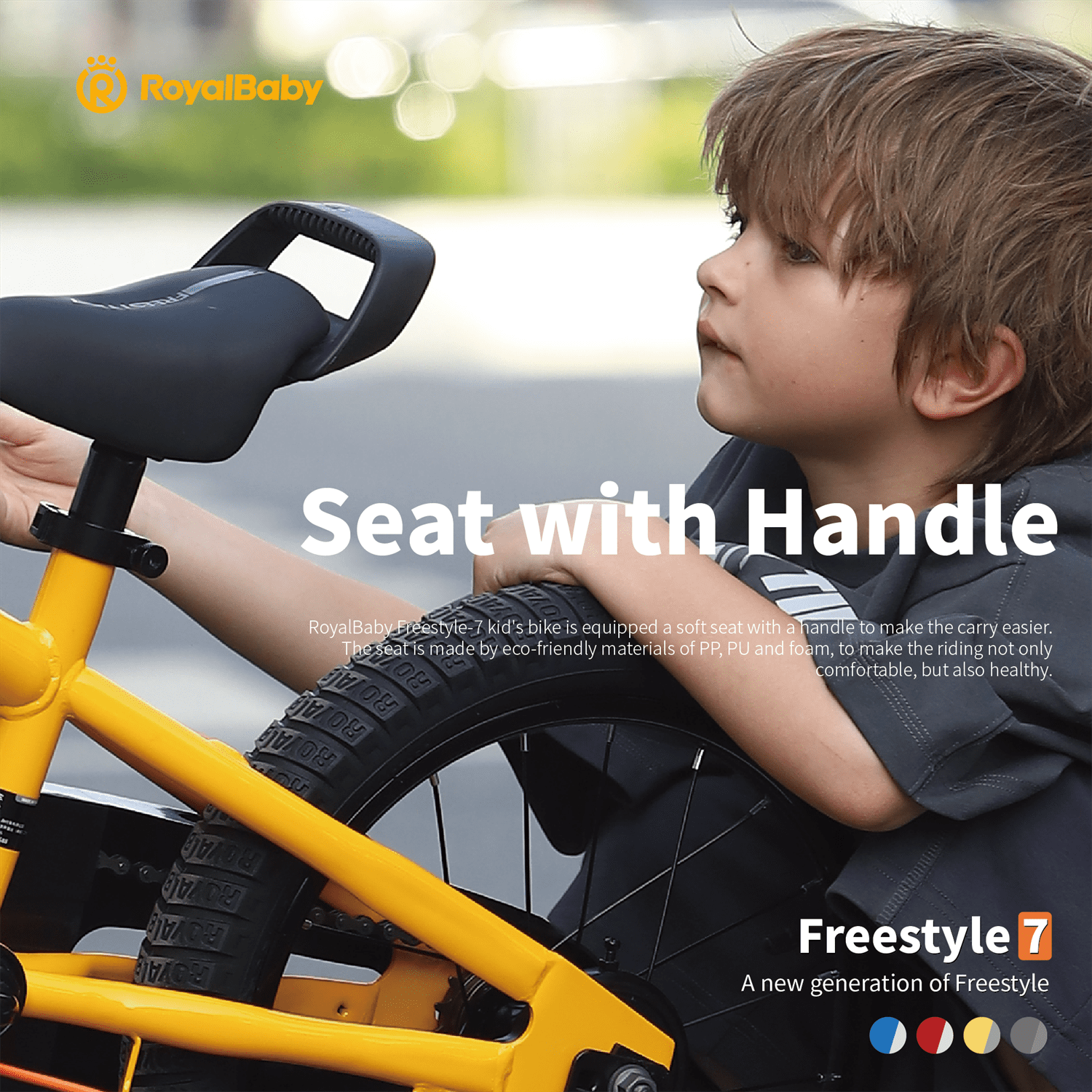 Royalbaby Freestyle 7 Kids Bike Sporty Design – RoyalBaby Freestyle 7 is the aesthetic upgrade of the original Freestyle with gorgeous metallic paint and sporty color contrast. The brake cable with contrasting colors indicates front and rear brakes and adds sporty tones to the design. Specifically For Kids – Each bike has RoyalBaby patented sealed bearing for smooth pedaling. The jet engine water bottle adds more joy to the ride. The optimized geometry is designed to work perfectly without training wheels! Better Way to Learn – Kids naturally pedal back to adjust the pedals’ positions while learning to ride, and a coaster brake will get in the way. With RoyalBaby kids specified two-hand brake bikes and short pull brake lever, kids can learn to bike without being held back by a coaster brake and still have equivalent braking power. Easy Assembly – The bike comes 95% pre-assembled, with an elaborated instruction manual and all tools needed in the box. It is easy enough to put together in 15 minutes.. Always Reliable – RoyalBaby bike complies with the CPSC standards and is trusted by millions of families in more than 80 countries globally. RoyalBaby offers a lifetime warranty on the frame and local 24-hour service.