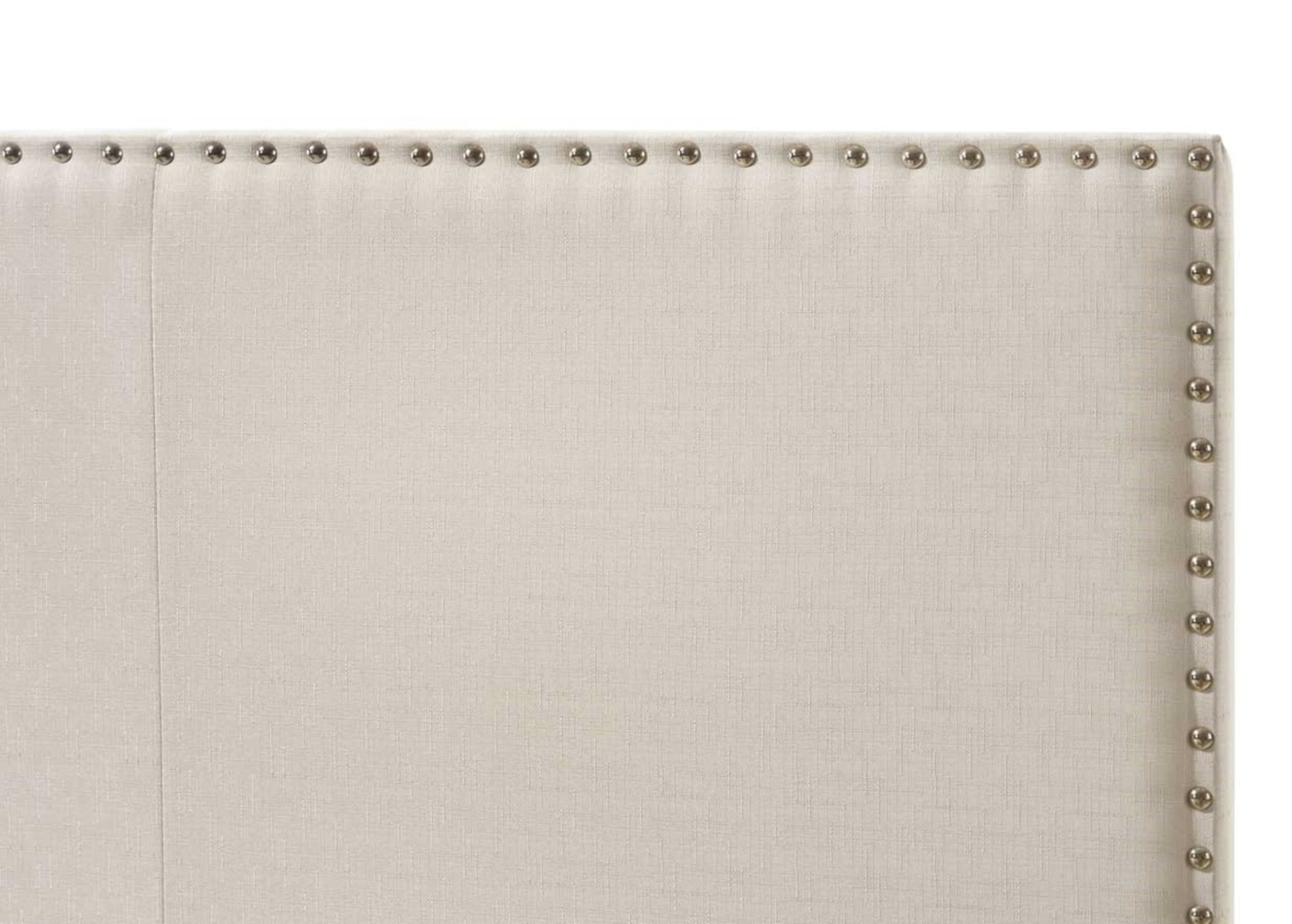 Modern style with an understated design creates this wonderful linen upholstered panel bed. Antiqued nickel rivets add a touch of timeless style. Neutral-toned upholstery can coordinate with many tones. Features a rubberwood frame for added strength and durability.