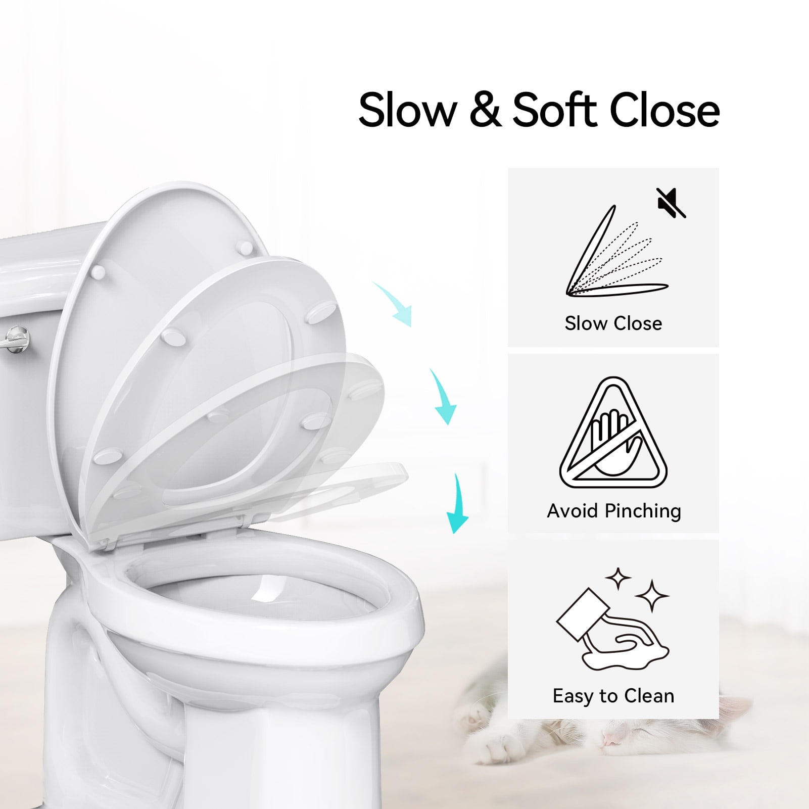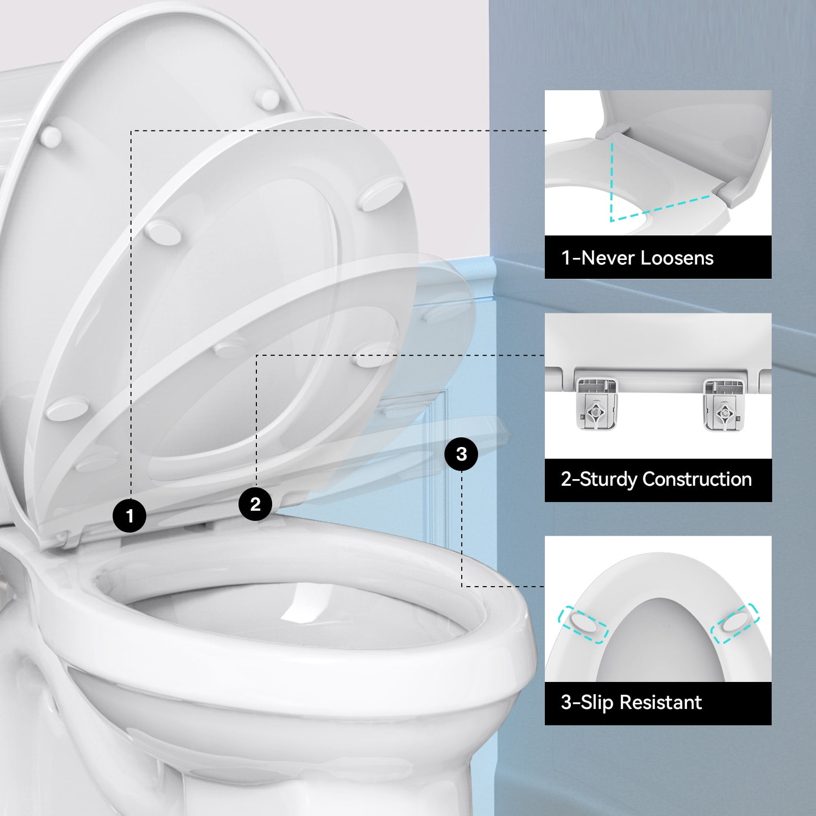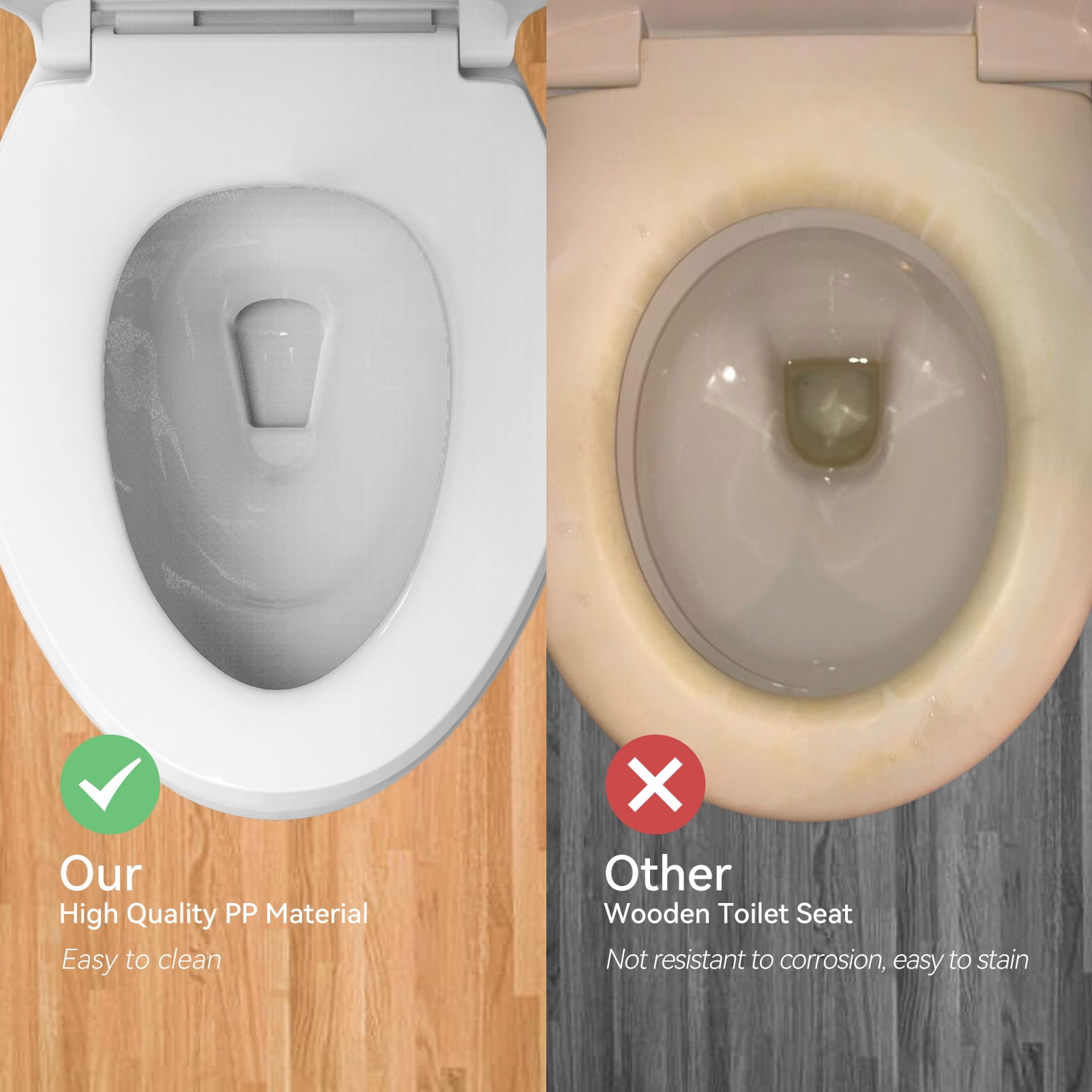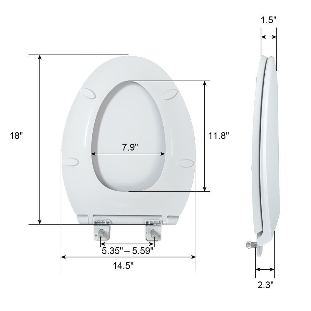 Heavy-Duty Construction: Crafted from PP material, R&T elongated toilet seat supports up to 400 lbs. Endures rigorous testing with 50,000 life cycles for durability and reliability. Universal Fit for Elongated Toilets: Designed to fit most American standard elongated toilets, measuring 18″ long and 14.48″ wide, mounting hole distance: 5.5″. Please measure your toilet bowl before purchase. Easy Installation & Cleaning: Featuring top mount bolts for fast installation from above, eliminating the need to kneel down. Quick-detach design facilitates easy cleaning by quickly removing the lid. Soft Close: Enjoy quiet in your bathroom with R&T slow close toilet seat, preventing slamming lid and fingers pinching. Enhanced Stability: R&T elongated toilet seat comes with grip-tight bumpers, ensuring stability as you use it.