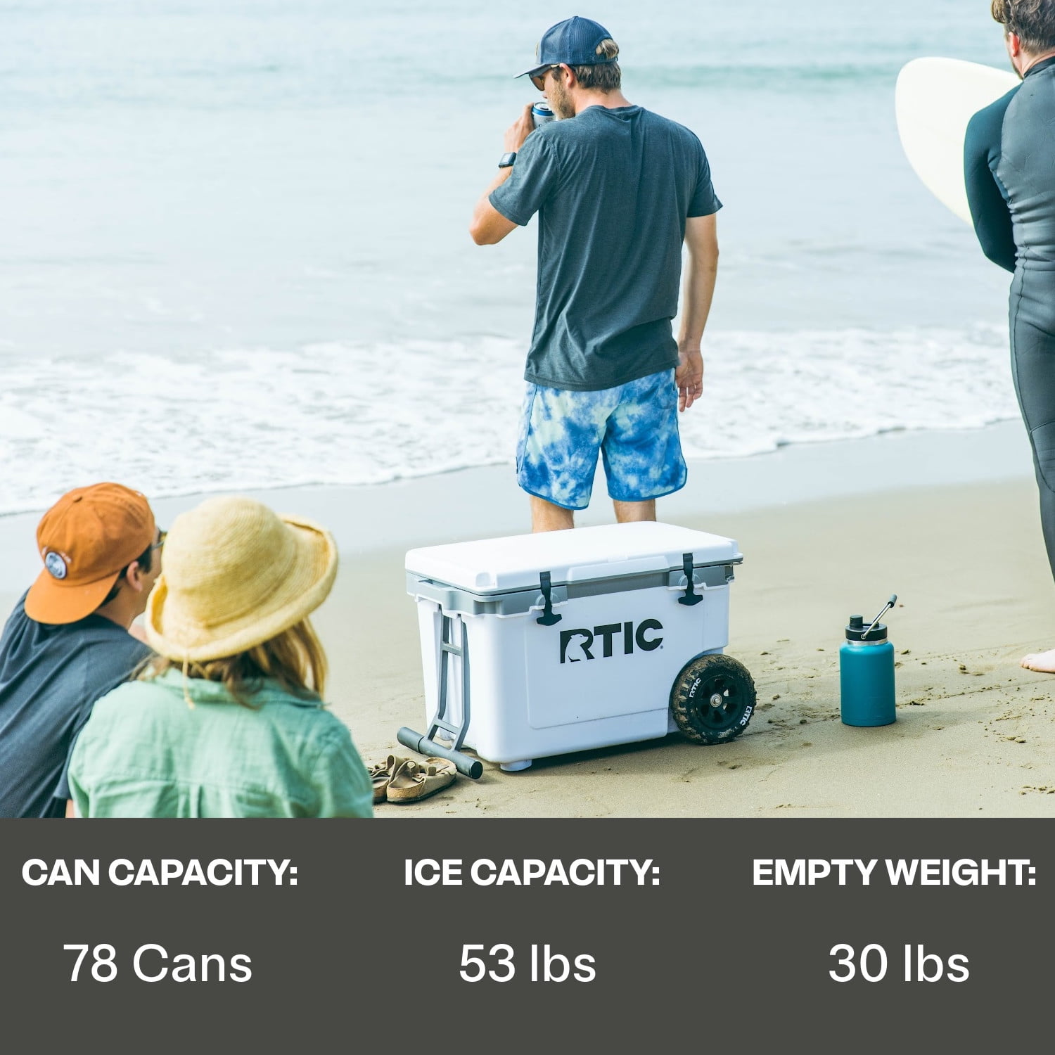 52 quart capacity holds up to 78 cans Ultra-Light Construction 30 percent lighter than rotomolded coolers of similar capacity Up to 2.5 inches of closed-cell foam insulation keeps cold for up to 5 days Puncture-proof wheels handle tough terrains, like sand, mud, grass, stairs, and more Powder-coated aluminum handle with non-slip silicone grips and gently release Built-in stainless steel bottle opener silicone cargo net and integrated lock holes