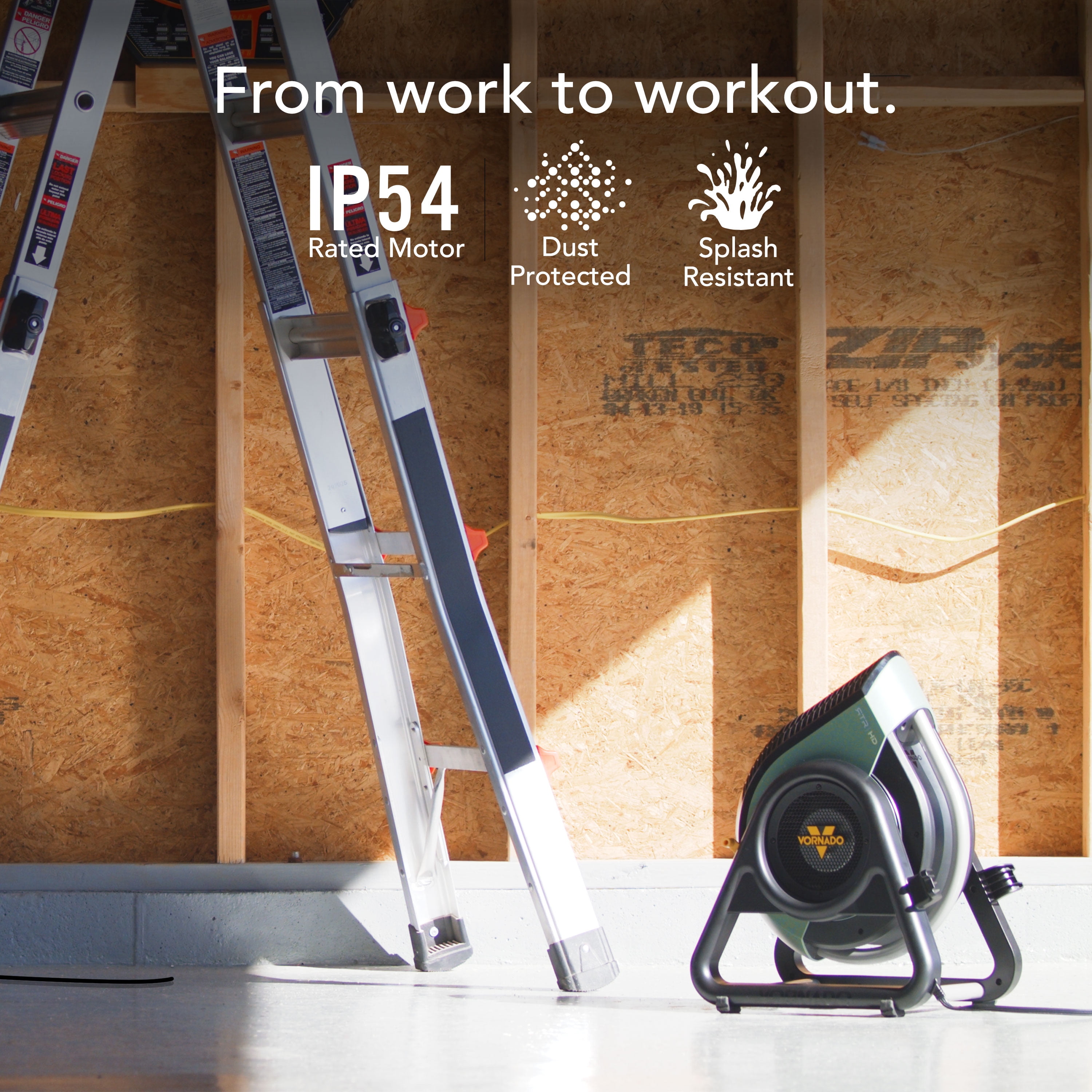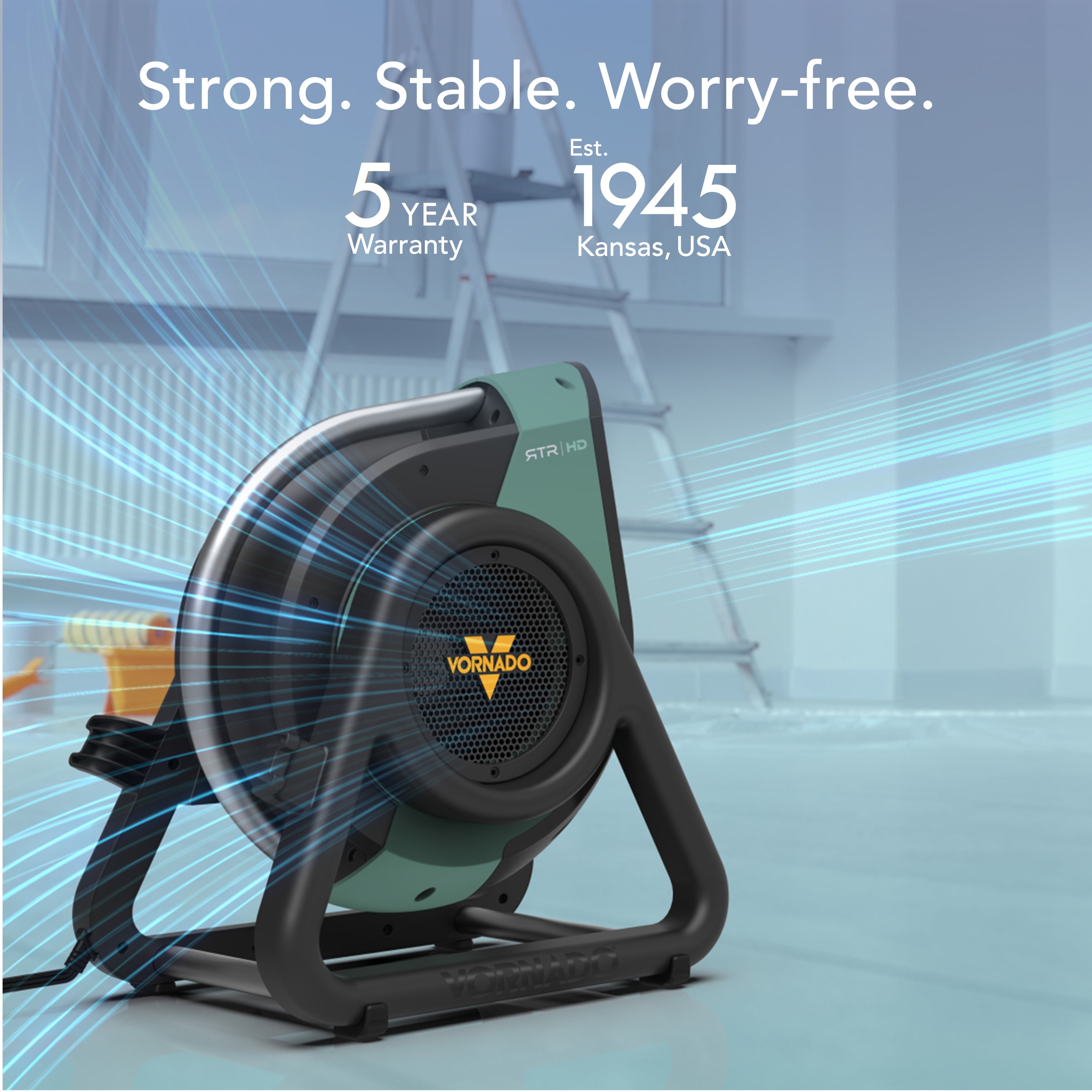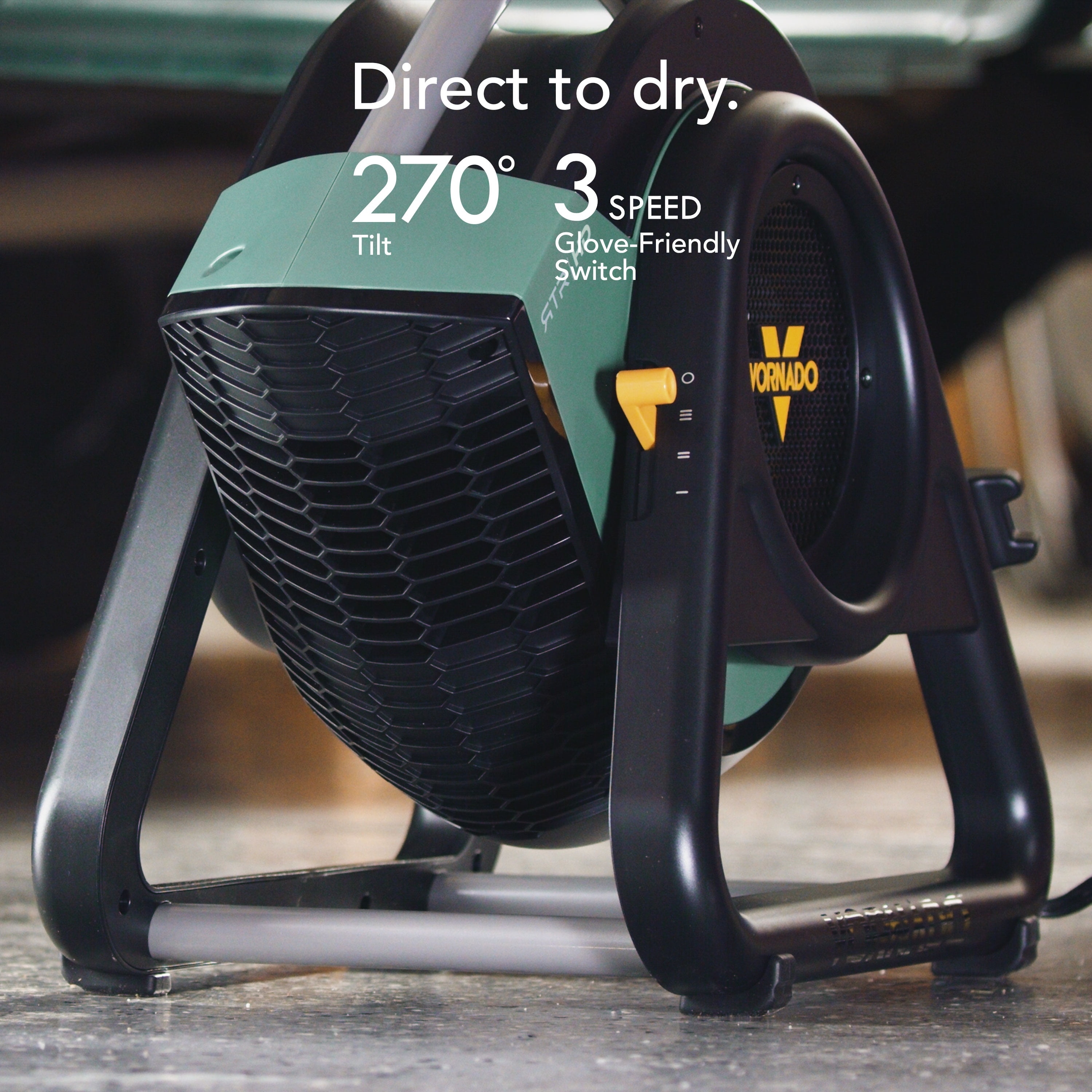 DIRECT TO DRY — Direct the powerful airflow of the Vornado RTR high-velocity shop fan with its 270º tilt feature. Whether you need to dry wet floors quickly, target specific areas for drying paint or finishes, or enhance overall circulation in your garage or workshop, this fan offers versatile and focused airflow to meet your needs. DURABLE DESIGN — Engineered for durability, this high-performance circulator is built with a dust-proof and splash-resistant IP54 rated motor, ensuring reliable operation even in demanding environments. The robust, high-impact case is designed to withstand the rigors of tough jobs, making it an ideal choice for any shop or garage setting. VERSATILE DESIGN — The fan’s versatile 270º tilt capability allows you to direct airflow precisely where it’s needed. Featuring a glove-friendly switch, you can easily toggle between 3 speed settings to customize the cooling or drying effect, ensuring optimal performance for various applications. CONVENIENT CORD STORAGE — Simplify transport and storage with the convenient flip-up cord management system. This thoughtful design keeps the power cord neatly organized, making it easy to move the fan between projects and maintain a clutter-free workspace. SUPERIOR SUPPORT — Our standards are high, and so are your expectations. If our product doesn’t meet them, we’ll replace it, for up to 5 years. Products designed and supported in Andover, KS.