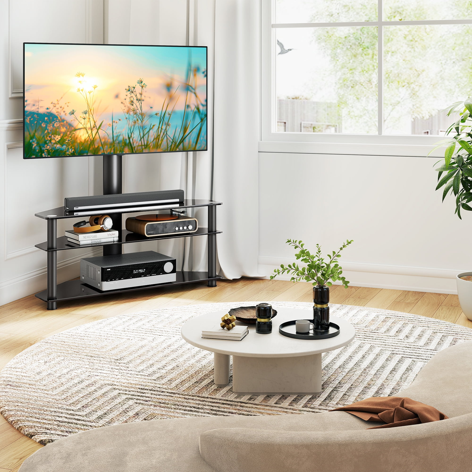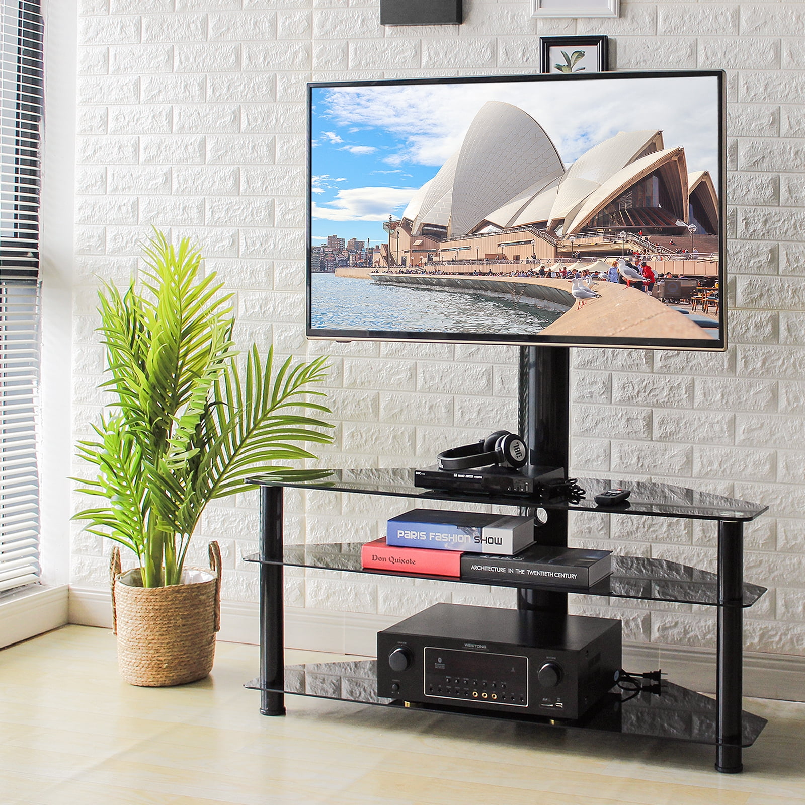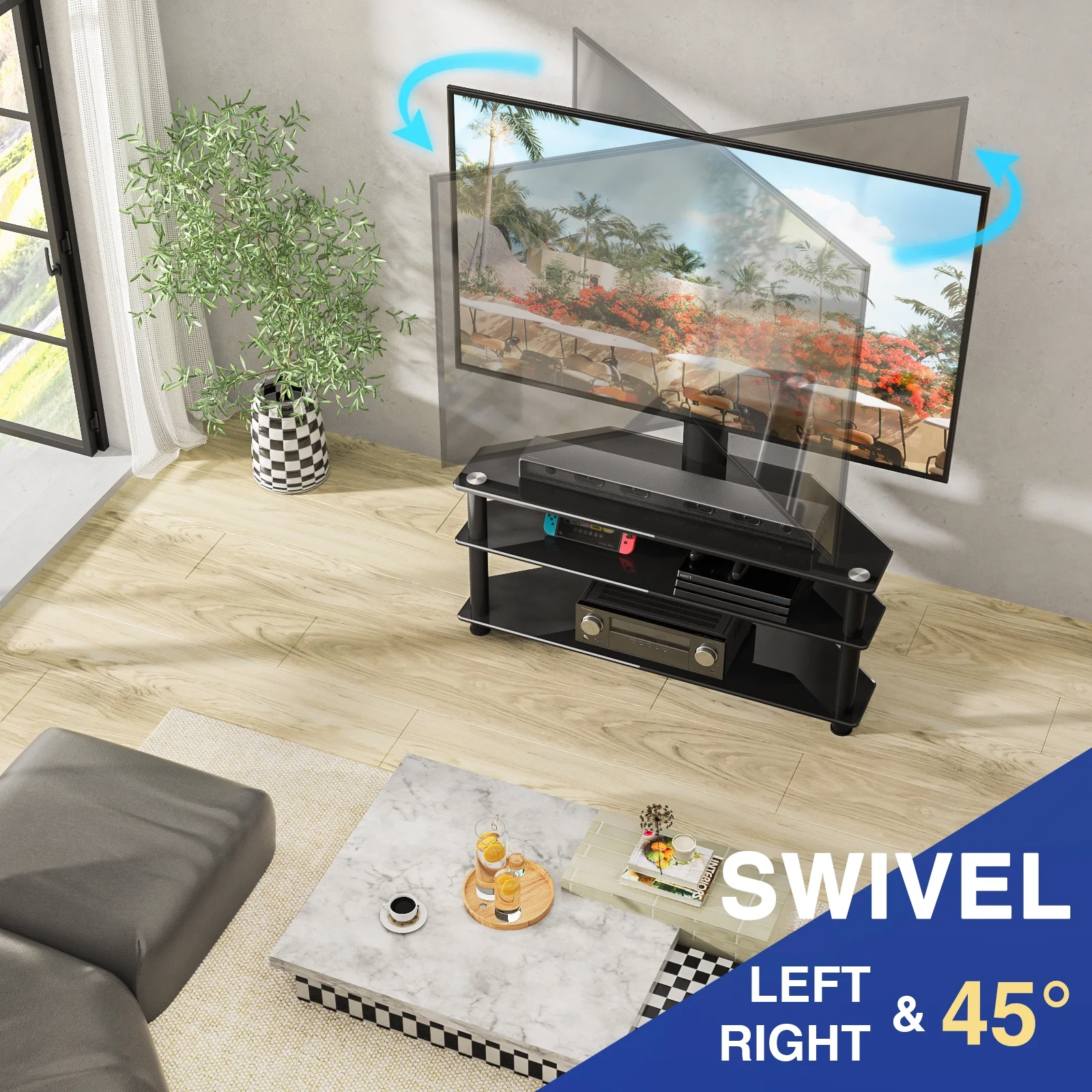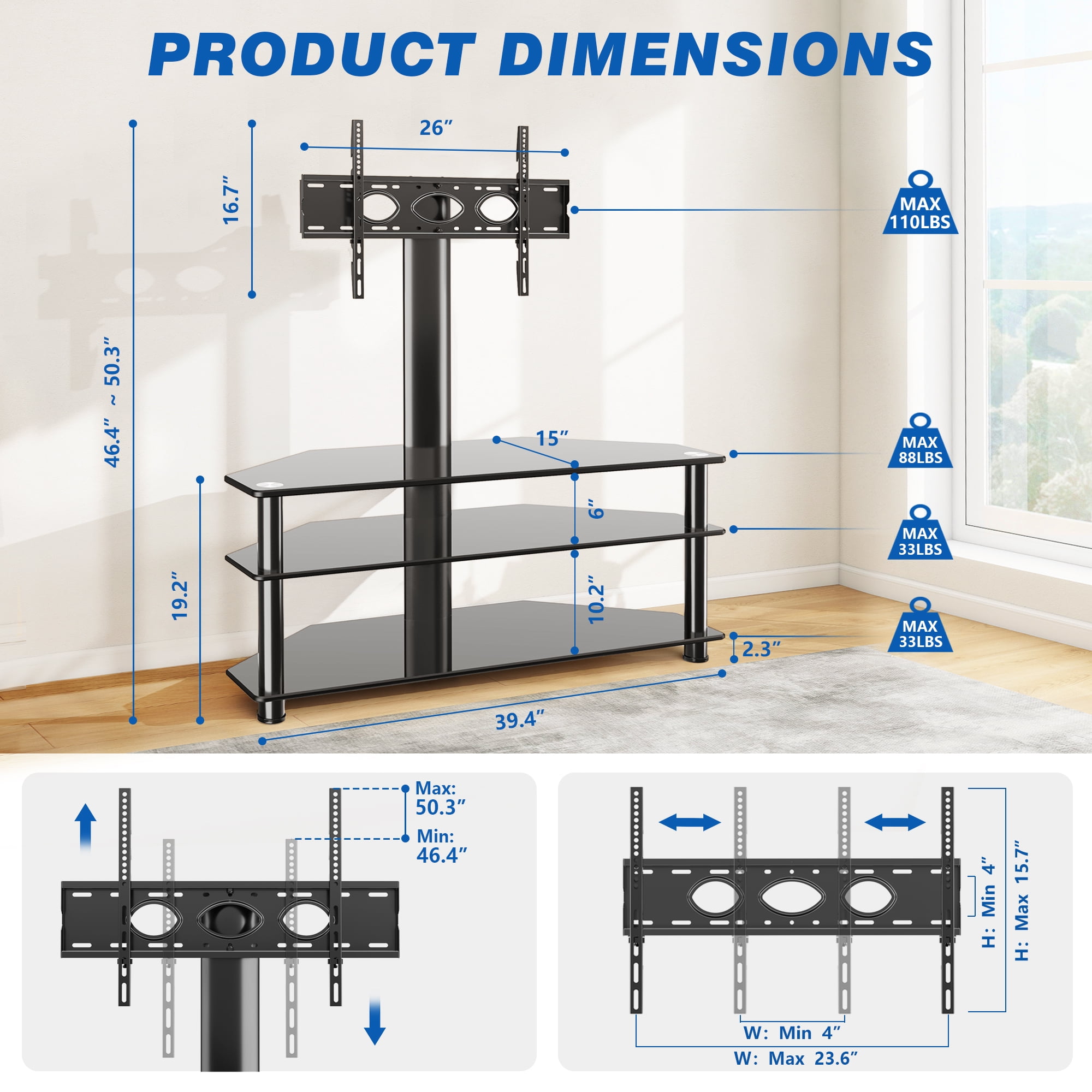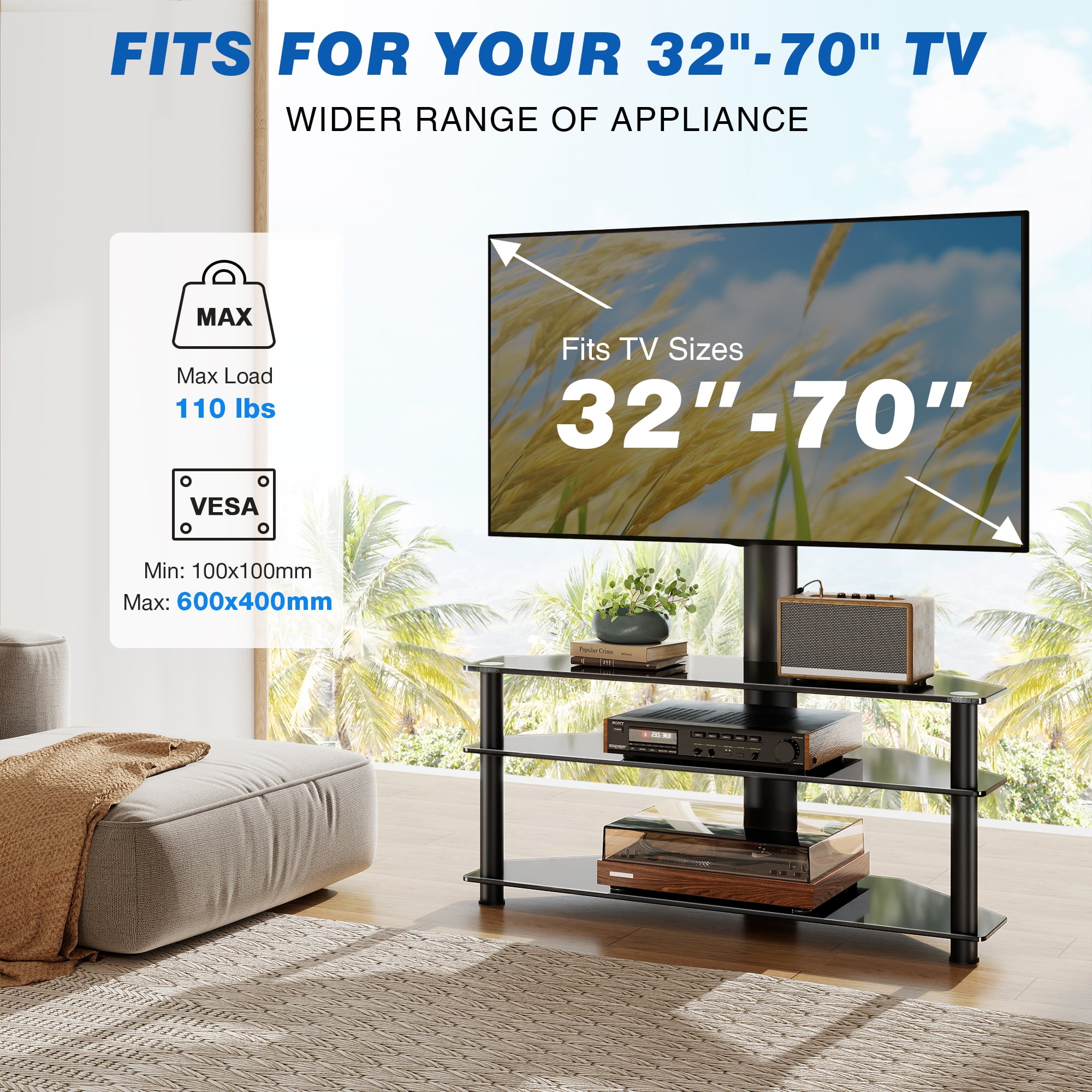 Black glass tv stand for 32 40 42 43 45 50 52 55 58 60 62 65 68 70 inch flat panel curved screen TVs. Tall TV stand up to 88 lbs. Flat TV stand is very easy to assemble with provided tools. Versatile TV furniture swiveling tv mount bracket easily swivel 45 degrees left or right. TV table console stand VESA mounting pattern from 100×100 to 600x400mm. Corner TV stand made by safety high quality tempered glass, no rust and water-proof finish. Space-saving 3 in 1 tv stand entertainment center, perfect for small space. Glass TV stand with mount boast with wide storage space to store DVD players, DVRs, HD recorders, cable TV Boxes, AV components, gaming systems, CDs, DVDs and any other media. TV console table stand fit Samsung LG Electronics Sony Sharp Panasonic Philips Vizomax Cello Bush Blaupunkt JVC Hitachi Hisense Goodmans Finlux Toshiba TCL Element and more brand LCD LED OLED QLED Plasma smart TVs.