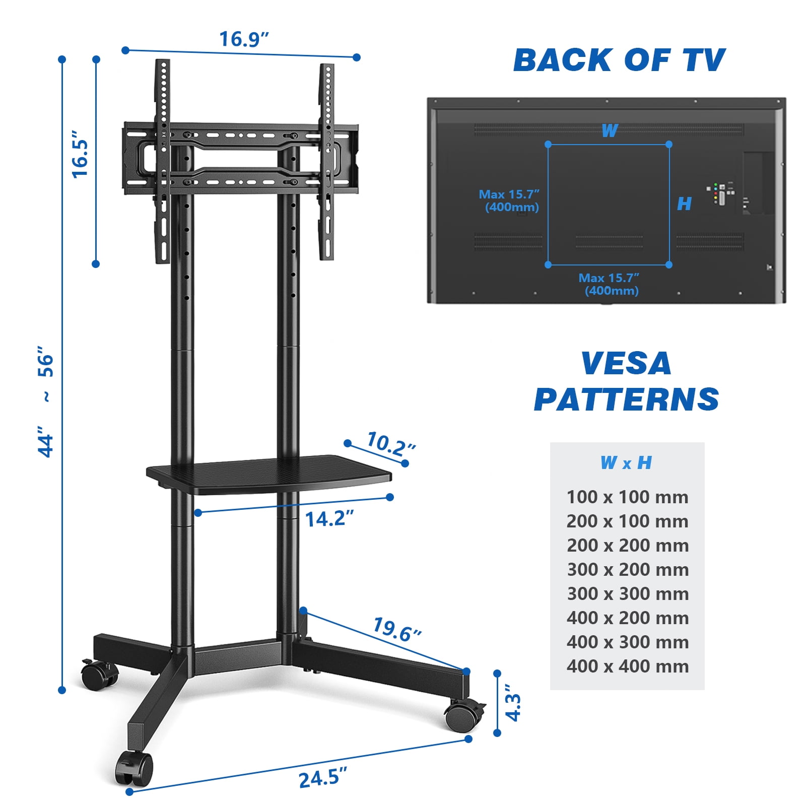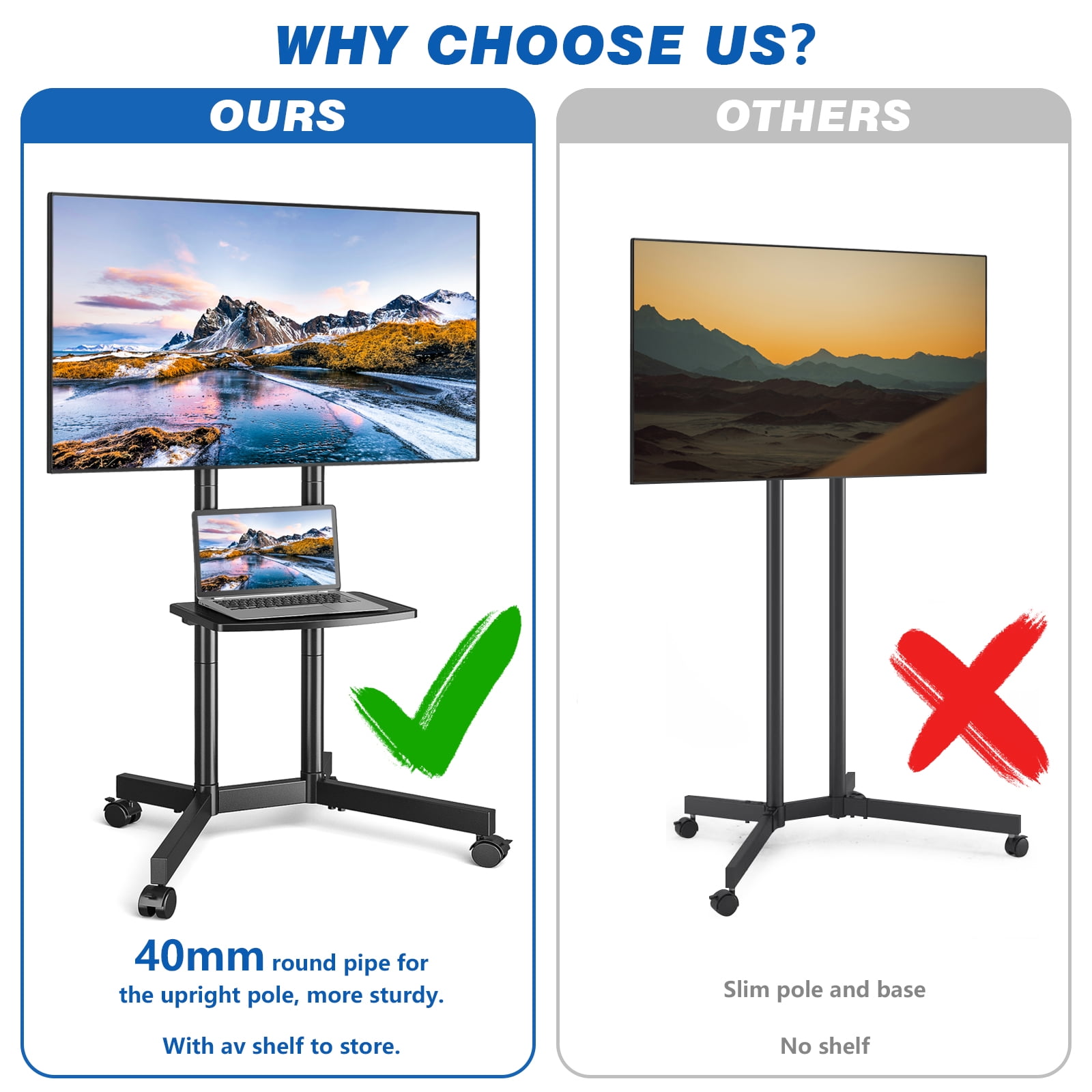 Rolling TV stand with 4 feet welded base and 40mm round pipe, very stable and durable. 65 inch black TV stand with easy to follow instruction manual. Mobile TV stand with wheels fit for Samsung LG Electronics Sony Sharp Panasonic Philips Vizomax Vizio Cello Scepter Bush Blaupunkt JVC Hitachi Hisense Goodmans Finlux Toshiba LCD LED OLED QLED Plasma flat curved screen TVs. Tall TV stand with lockable roller, convenient to make outdoor TV cart stand with wheels stationary when cleaning, fit for home living room bedroom easy. Swivel TV stand with wheels with protective safety bolts prevent TV from falling. Outdoor TV stand cart mounting bracket VESA pattern from 100 x 100 to 400 x 400 mm, weight capacity up to 88 lbs. Wire management easily organize power and AV cords, keep equipment and accessories neat.