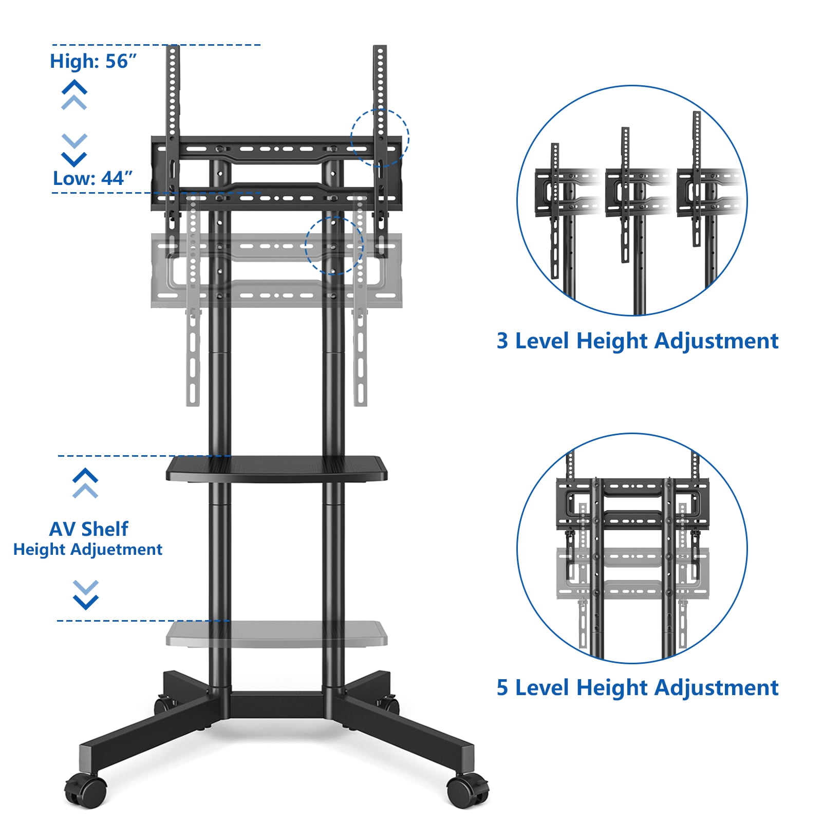 Our RTVR modern rolling TV stand cart with wheels for 32 35 38 40 43 48 50 55 58 60 65 inch flat curved screen TVs. Versatile mobile TV stand cart with mount made of sturdy high-grade steel, very durable especially for high traffic environments. Besides, rolling tv cart with attractive black finish that blends with any decor. Mobile TV stand can be used in commercials or home, present upcoming events, meeting, festivals. Portable TV stand with wheels convenient for living rooms, homes, or educational institutions. Metal rolling TV cart on wheels trolley floor stand easy to carry electronics like laptops and tablets. Moreover, adjustable shelves can be adjusted for extra convenience.