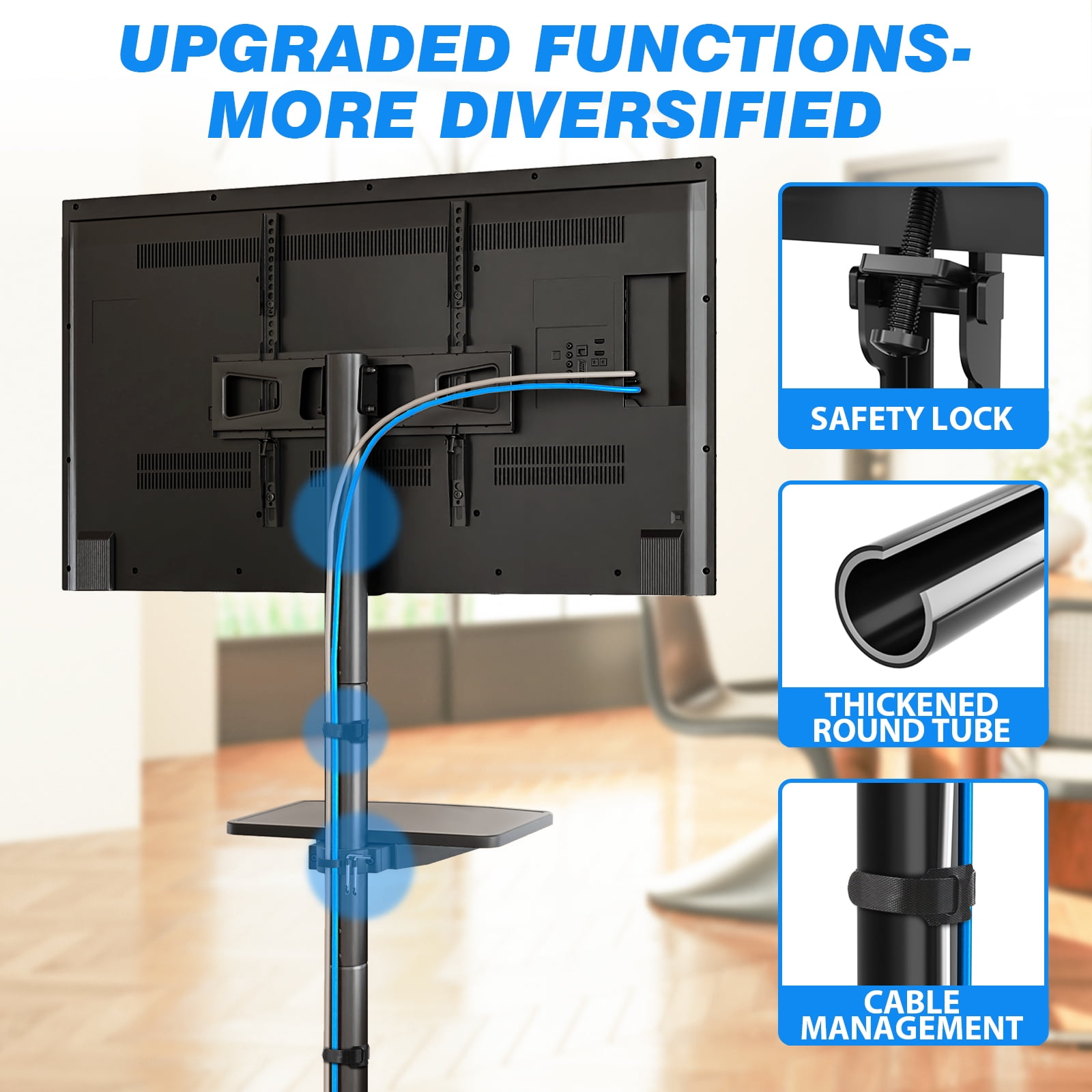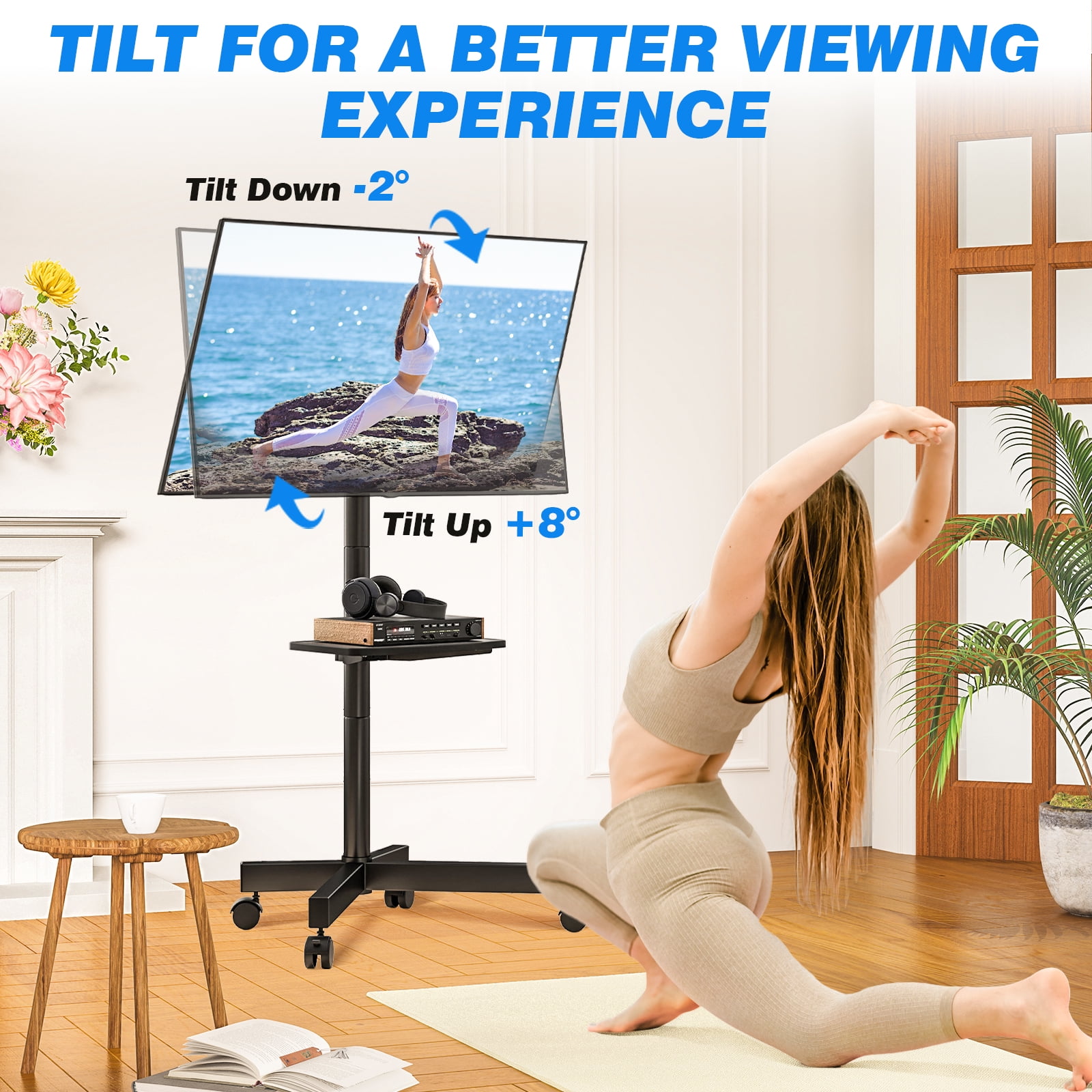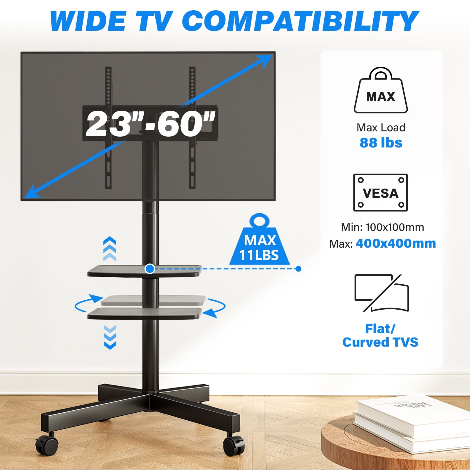 Modern black rolling TV stand on wheels for 23 30 32 40 42 43 50 55 60 inch flat panel curved screen TVs, weight capacity up to 88 lbs. Mobile TV stand mounting bracket VESA pattern meet: 400 x 400/ 400 x 300/ 400 x 200/ 300 x 300/ 300 x 200/ 200 x 200/ 200 x 100/ 100 x 100 mm. Adjustable TV mount stand tilts up 8 degree and down 2 degree for better view. Metal tv cart stand’s tray shelf can be adjusted or removed, hold cable/dish box, DVD player, streaming device, Xbox One and Blu-ray player easily. Black tv stand wheels with mute pulley is very convenient to move, do not disturb neighbors or children sleep. Rolling tv cart stand wheels two shorter X-shaped bases against the wall, more stable and space-saving. Ideal for homes, offices, dorms, kitchens, businesses, schools, halls, malls, entertainment centers.
