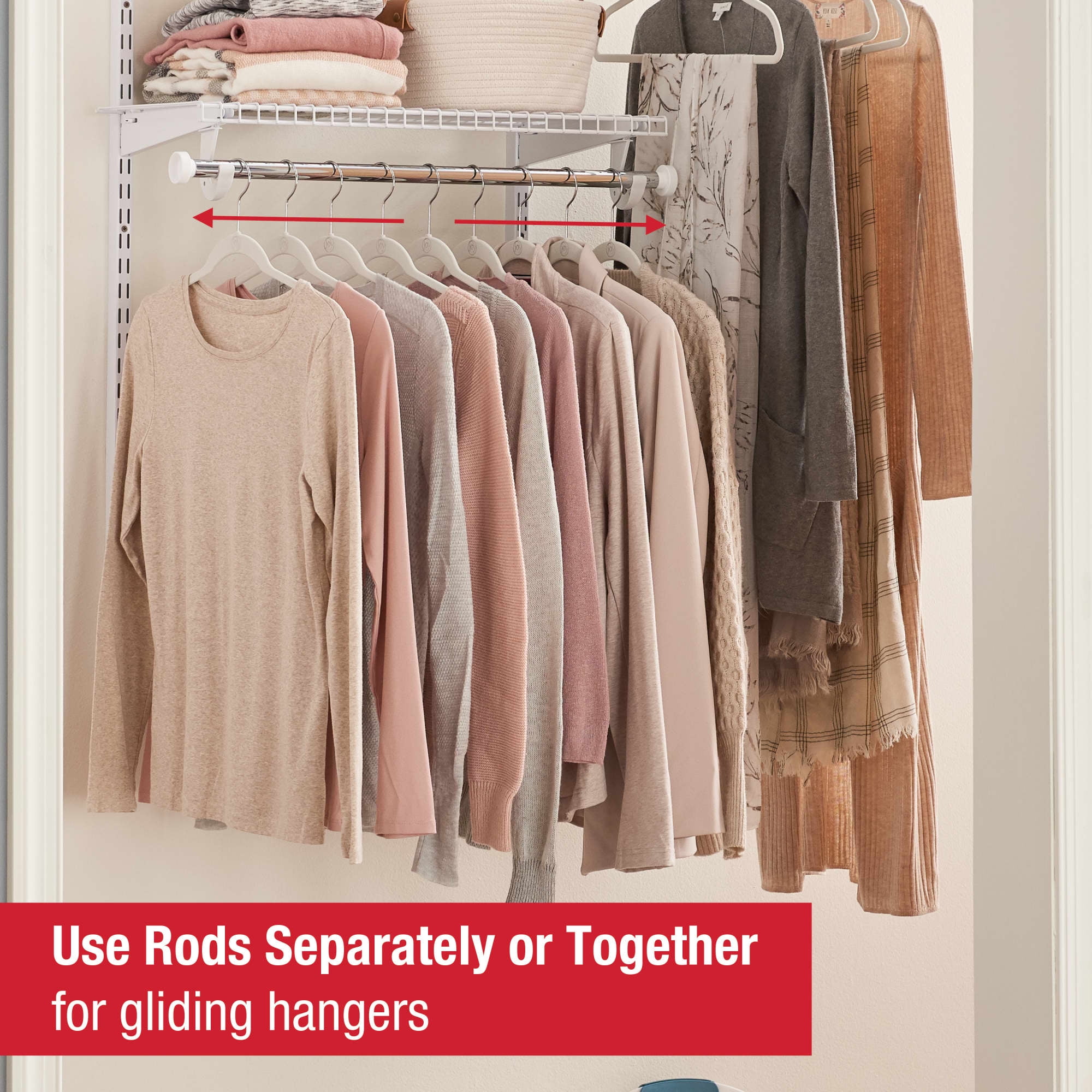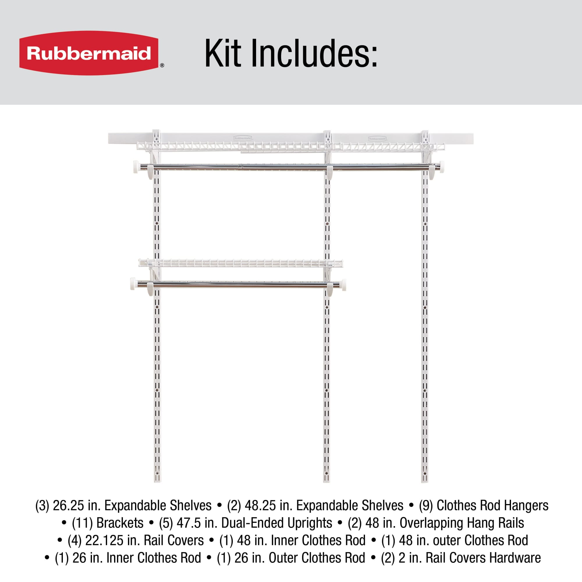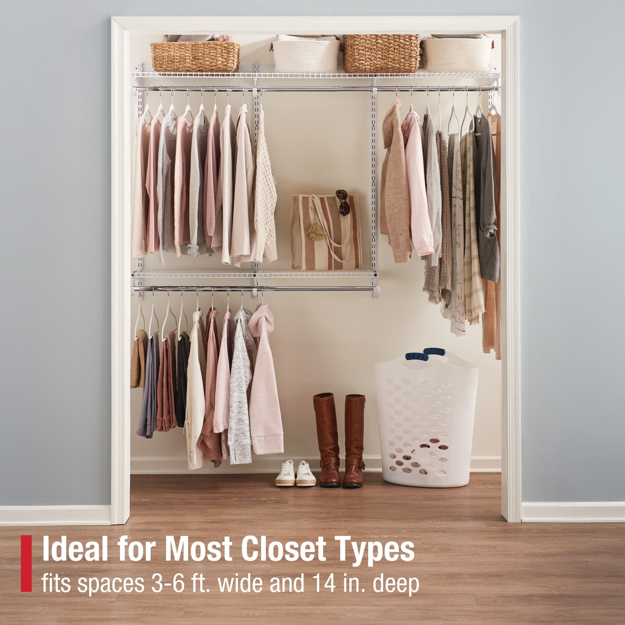 Kit fits in any walk-in or reach-in closet that is between three to six feet wide and at least fourteen inches deep Expandable steel, white shelving and overlapping rails allows for easy, no cut closet installation Modular design enables kit to be assembled in a variety of configurations to meet storage needs and design preferences Shelving is adjustable along the closet system as well, enabling shelf height to vary Hang rods can be used separately or telescoped together to enable hangers to freely glide along the closet kit Reassemble the closet to a new configuration without any tools as storage needs change All hardware needed to install the kit is included Accessories are available for further customization to add that finishing touch to the closet