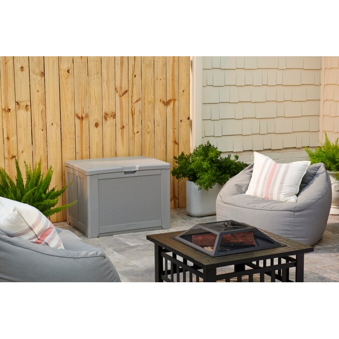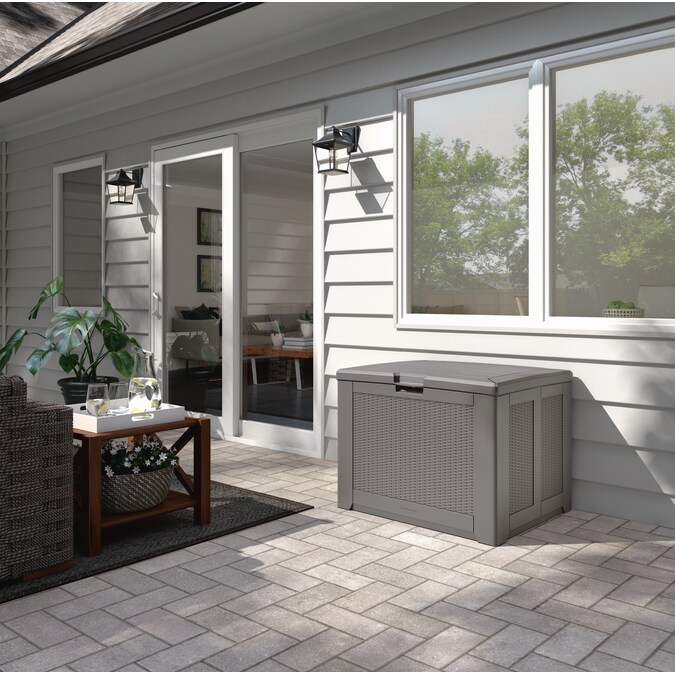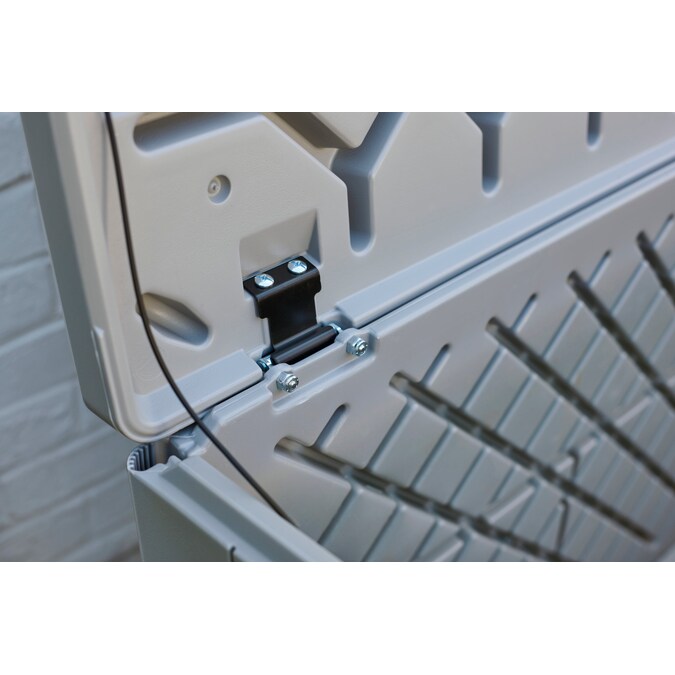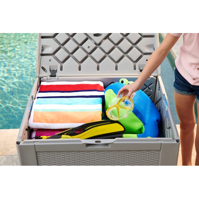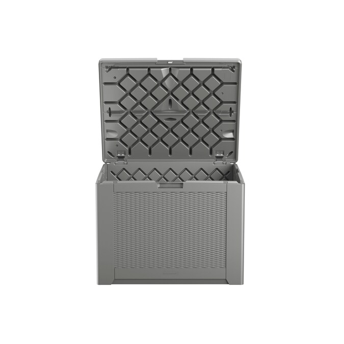 The Rubbermaid Medium 74 Gallon Deck Box is faster and easier to assemble with 69% fewer parts vs. Rubbermaid Large Deck Box (1837304). This durable deck box resists warping and doubles as an end table or extra seating. Two sturdy lid hinges make the lid easy to lift and remain open when accessing stored items. Store patio cushions, gardening tools, pool toys and more in this all-weather durability deck box that can be locked for added security.