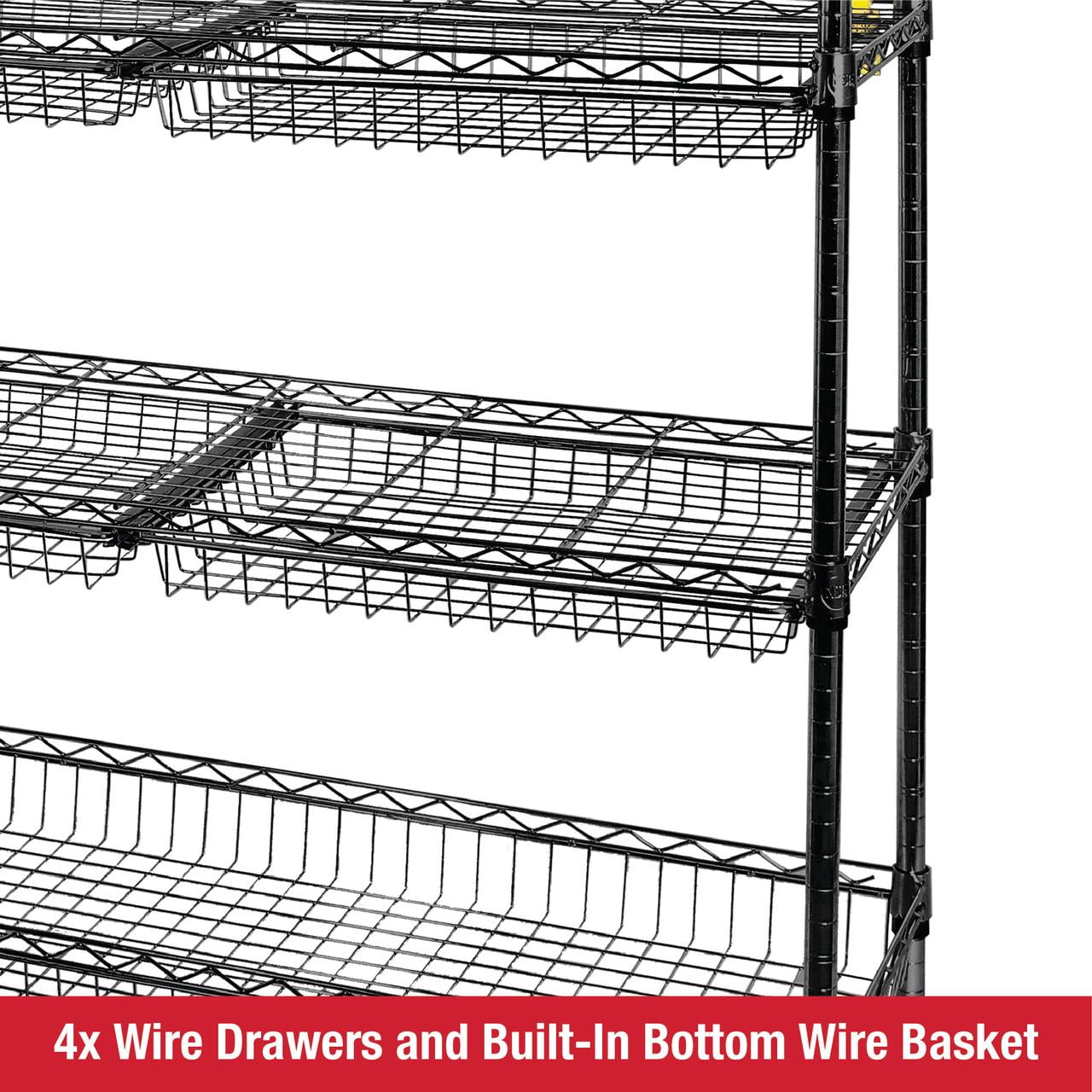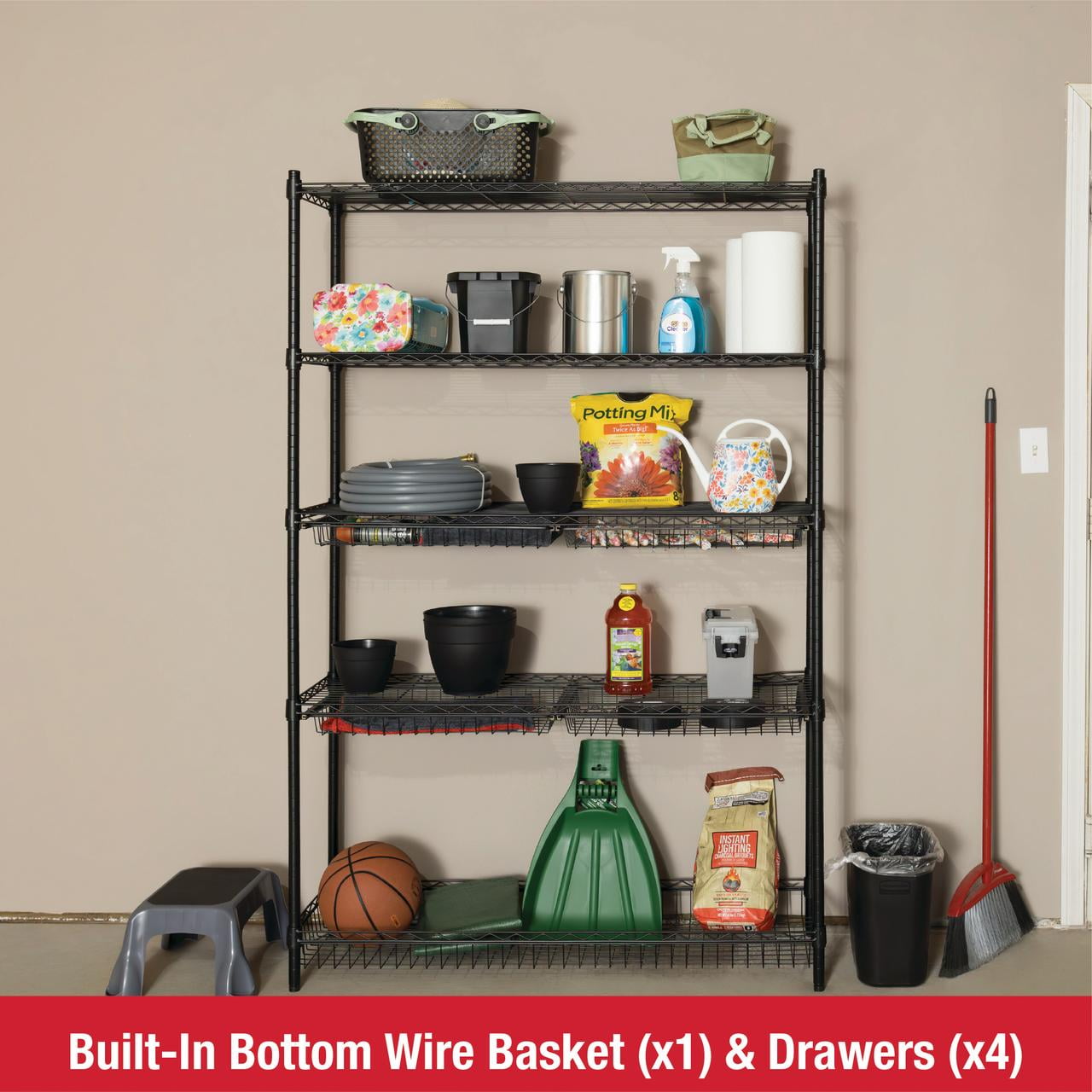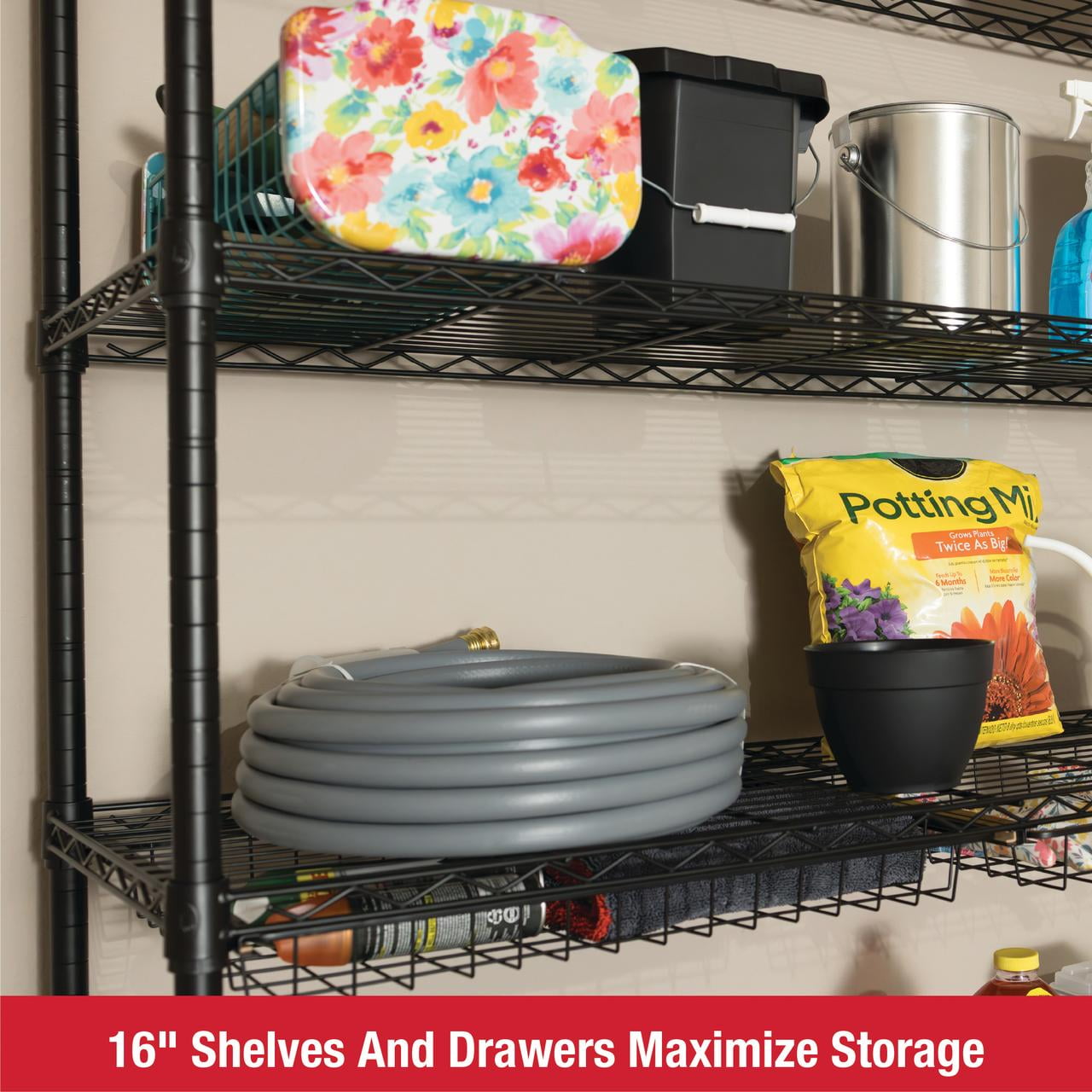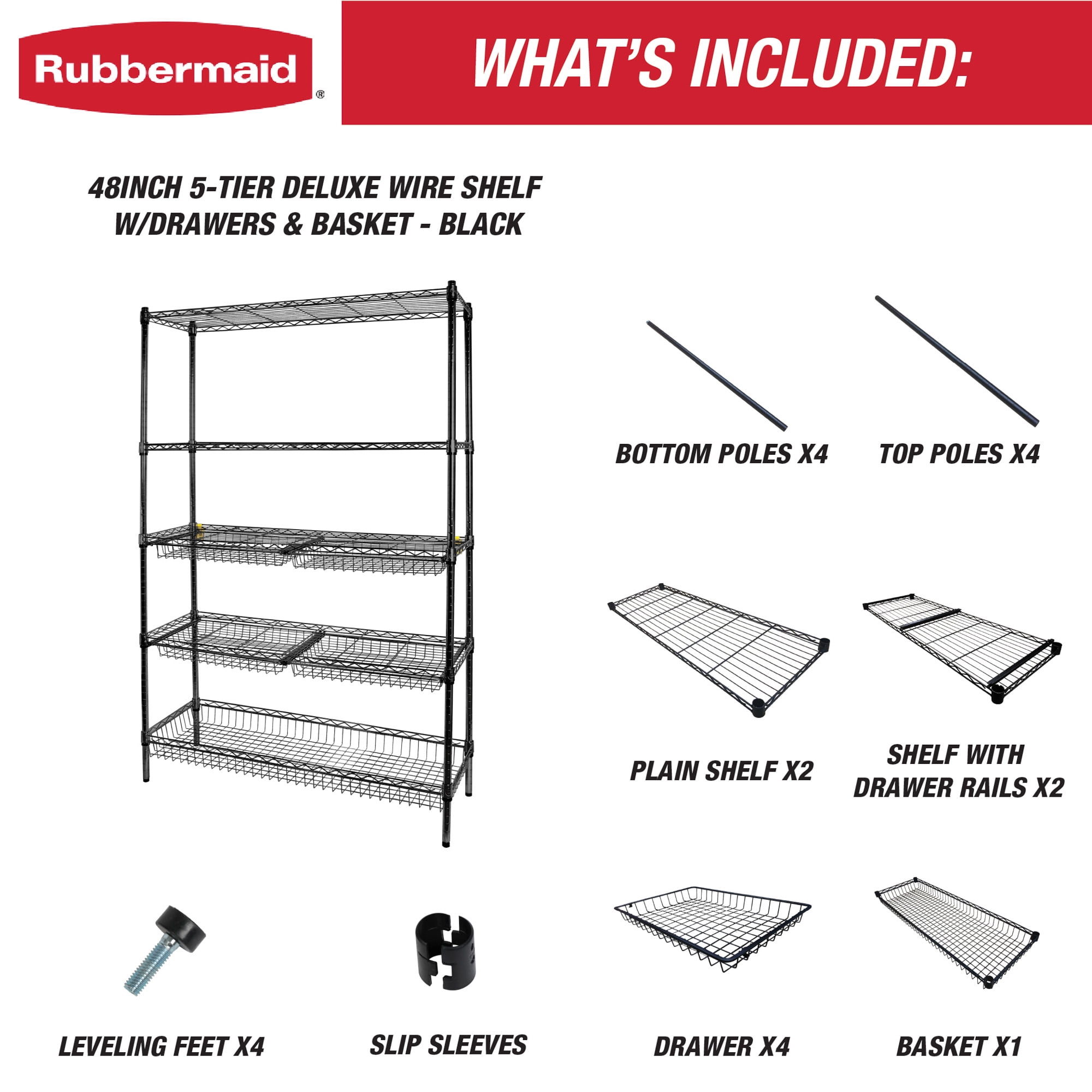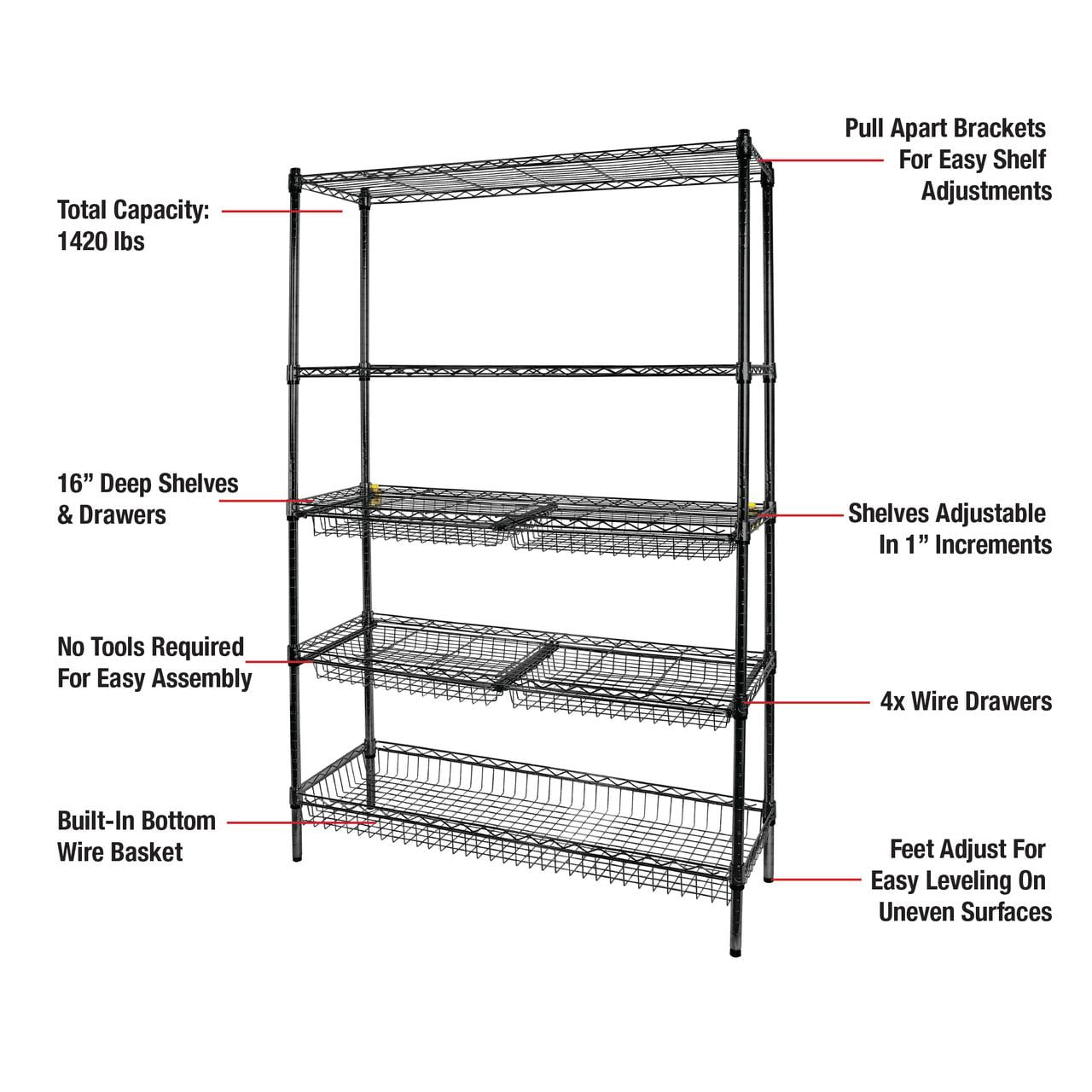 Rubbermaid 5-Tier Deluxe Heavy Duty Black Wire Shelving Unit with Drawers & Basket Heavy-duty steel frame with black powder-coated finish for durability and a clean, modern look Five adjustable wire shelves with a total weight capacity of 1,520 lbs Includes 4 sliding wire drawers and 1 large bottom basket for added organization Dimensions: 48″ W x 16″ D x 72″ H – ideal for garages, laundry rooms, utility spaces, and more Tool-free assembly and 1-inch shelf adjustment for a fully customizable storage solution