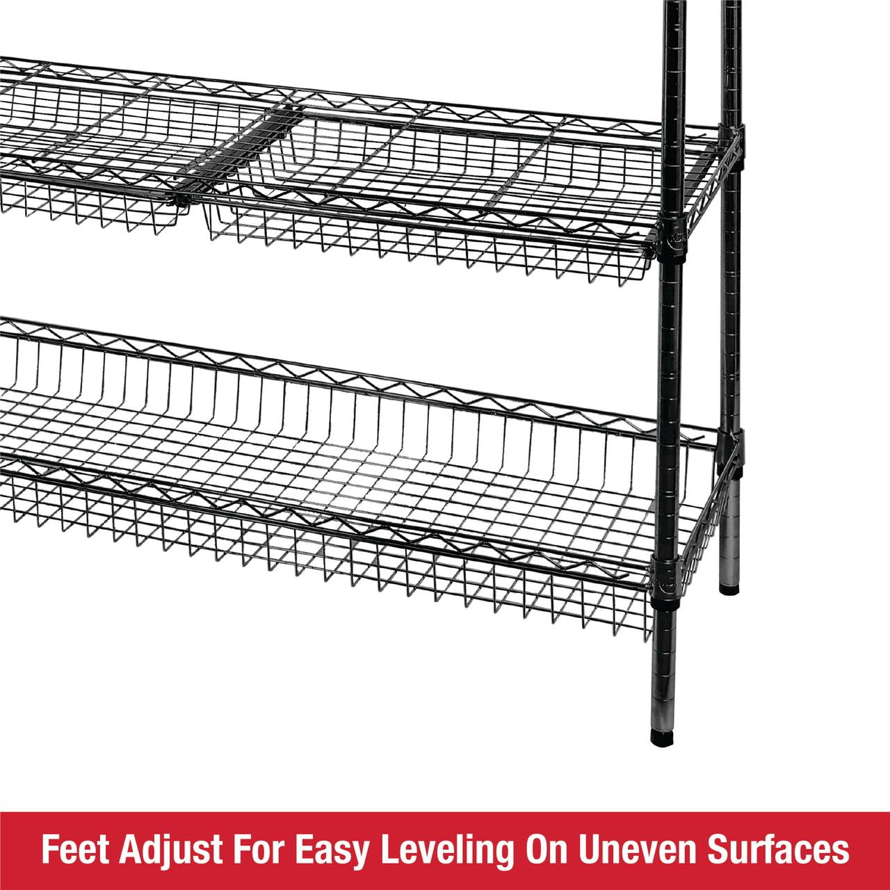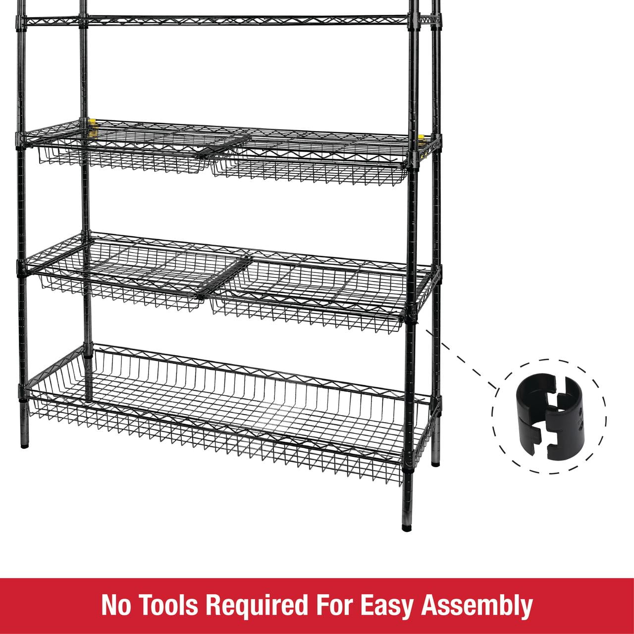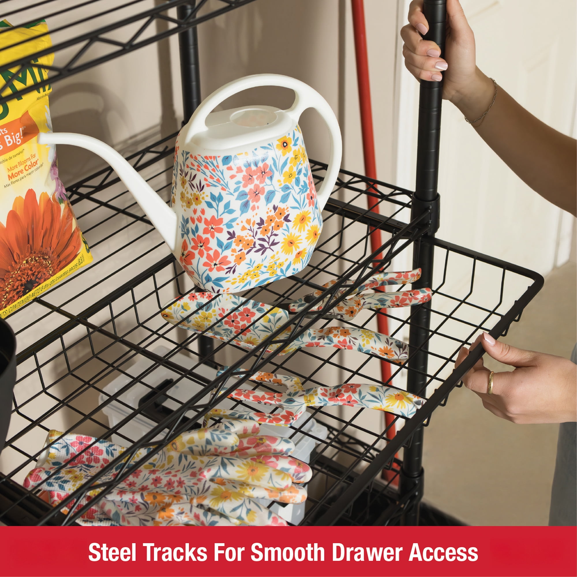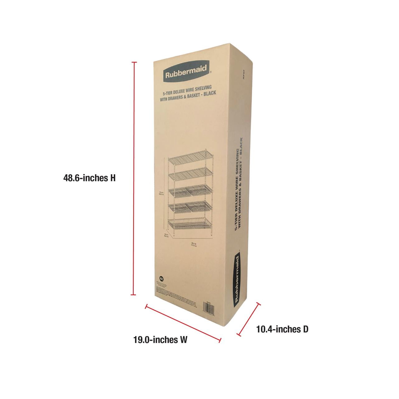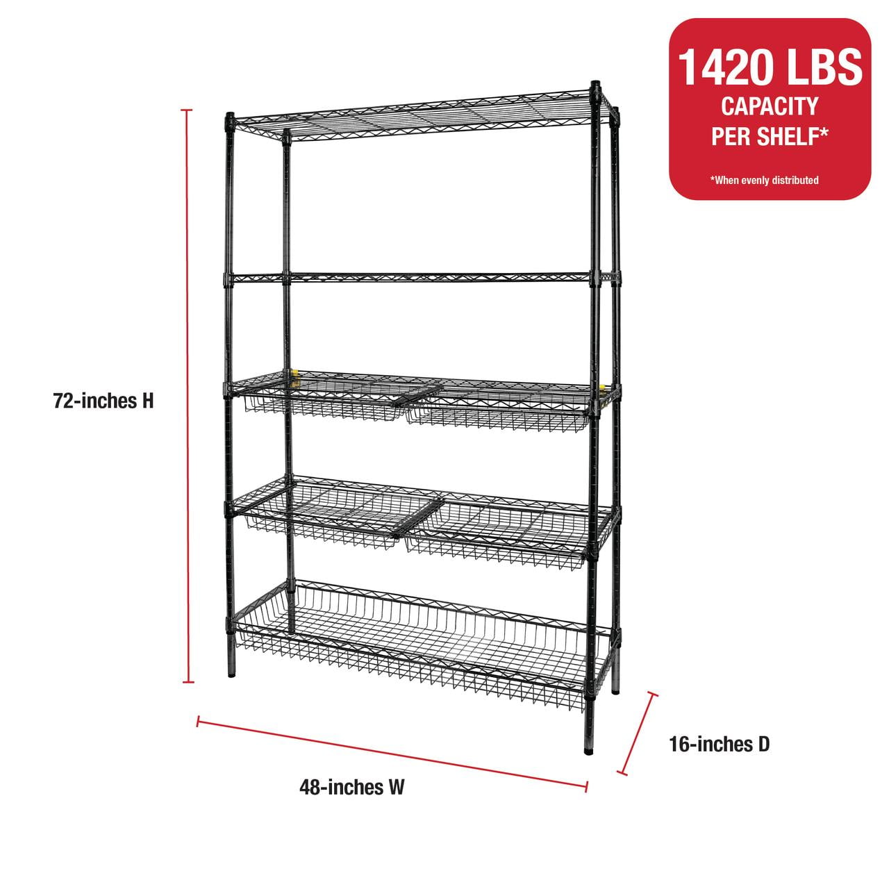 Rubbermaid 5-Tier Deluxe Heavy Duty Black Wire Shelving Unit with Drawers & Basket Heavy-duty steel frame with black powder-coated finish for durability and a clean, modern look Five adjustable wire shelves with a total weight capacity of 1,520 lbs Includes 4 sliding wire drawers and 1 large bottom basket for added organization Dimensions: 48″ W x 16″ D x 72″ H – ideal for garages, laundry rooms, utility spaces, and more Tool-free assembly and 1-inch shelf adjustment for a fully customizable storage solution