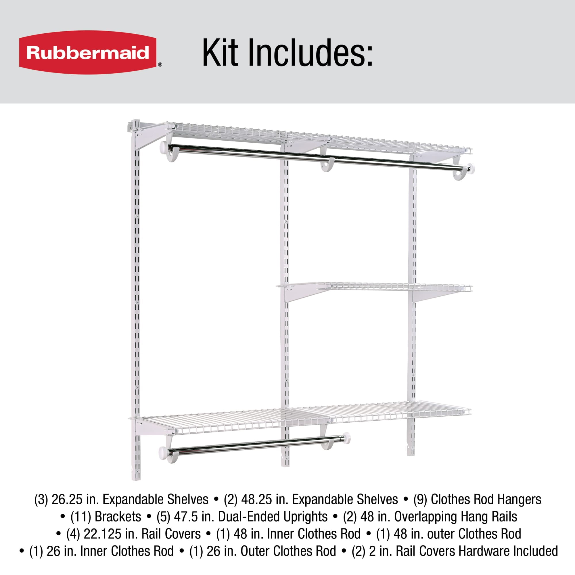 Rubbermaid quality Additional limited-time savings reflected in current price 4-to 8-foot expandable wardrobe organizer kit Telescoping rods and expandable shelves Customize your walk-in or reach-in closet Creamy white finish Includes shelves, top rail, brackets, uprights, and hanging rods Easy to install with no cutting required Three 26-inch shelves Two 48-inch shelves Two 48-inch top rail 11 brackets Five 47.5-inch uprights 2 hang rods