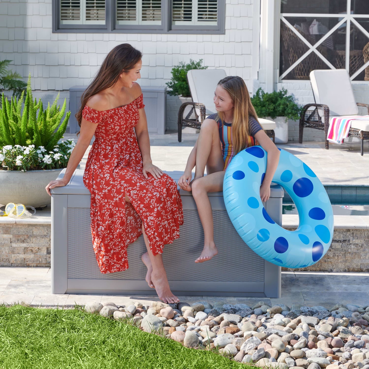 The Rubbermaid Deck Box features a basket weave pattern to complement decor. This deck box has 67% fewer parts and is much faster and easier to assemble then previous X-Large Deck Box Model. There is plenty of storage space inside for patio cushions, yard supplies, gardening tools, pool accessories and more. The lid offers a flat surface area for serving or seating space, plus it has easy-access lid hinges that open and close with just a light touch.
